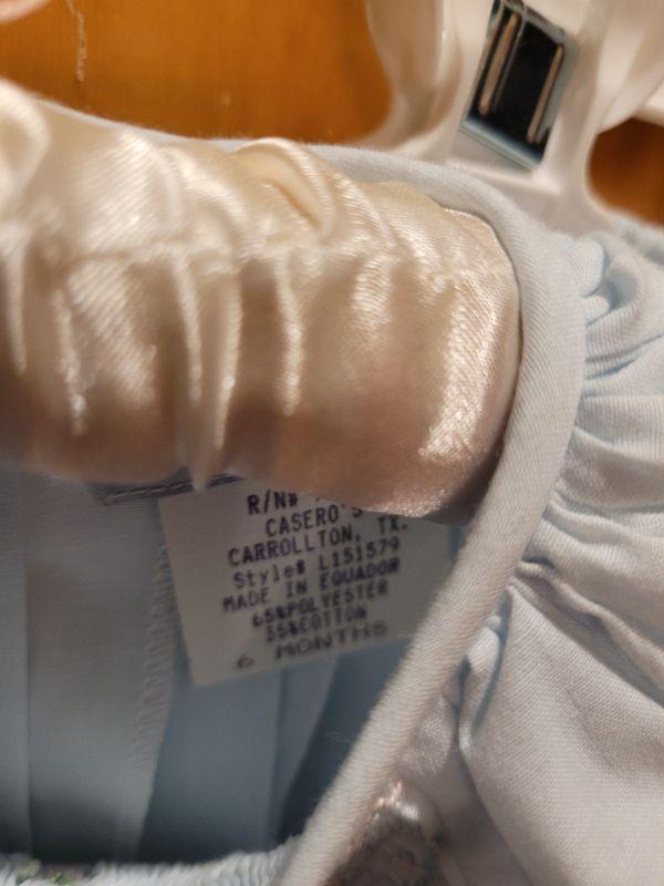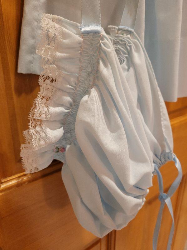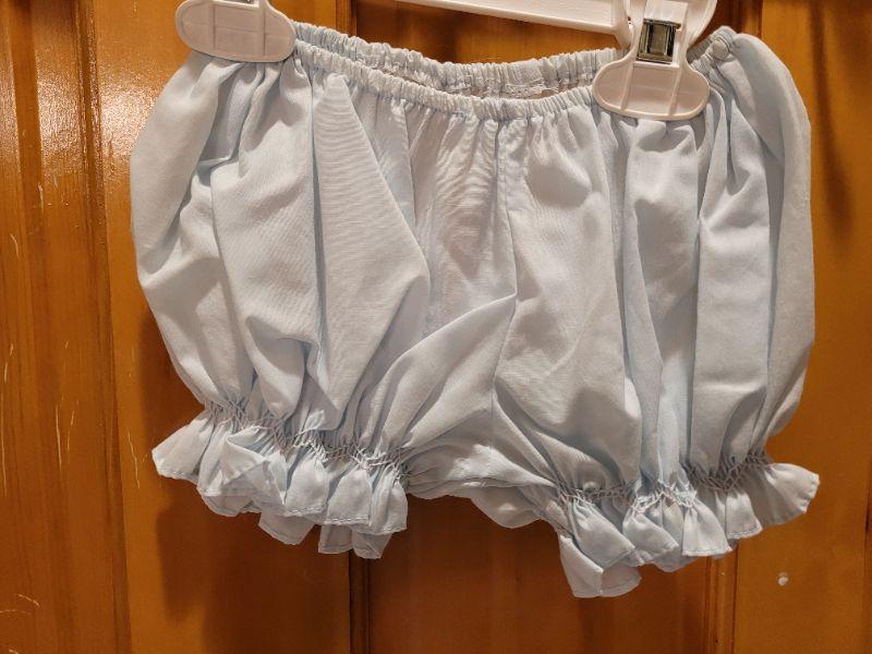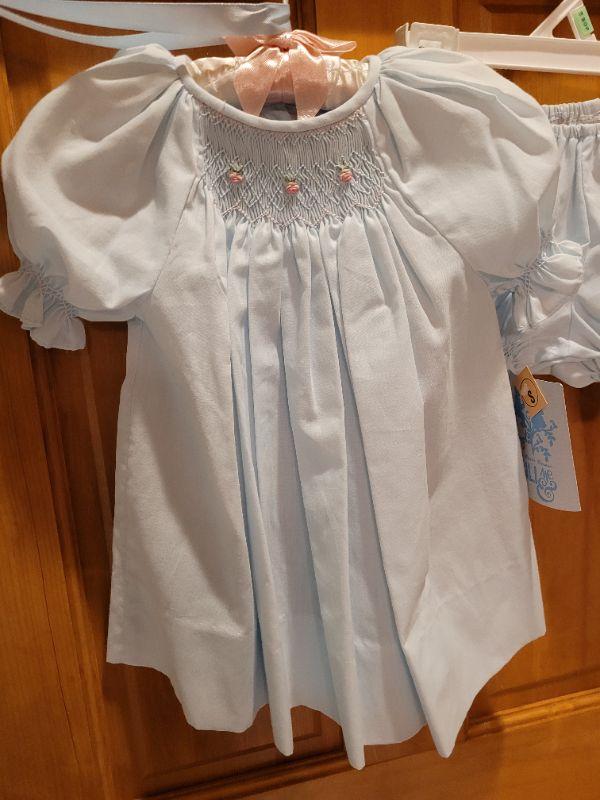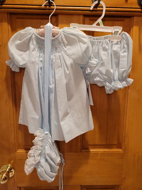 Lot 499: New Blue Dress, Bloomers and Bonnet 6 Months (Bonnet Ribbons are dirty)