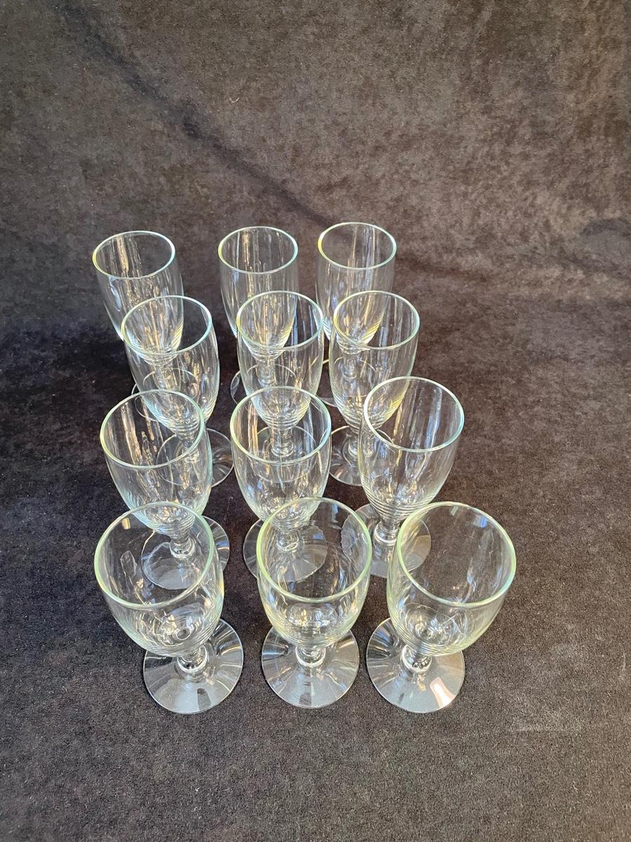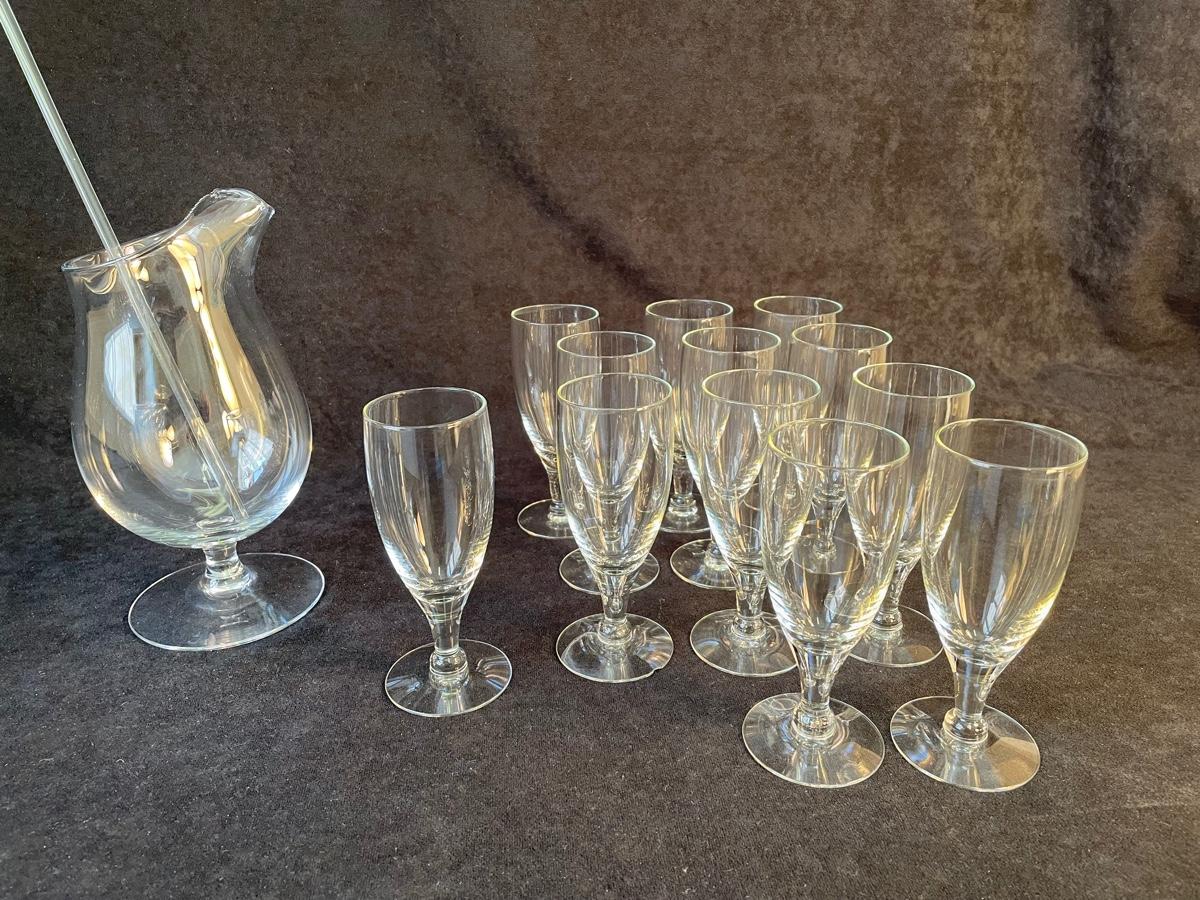 Footed glass pitcher with glass stirrer and 12 small footed goblets
