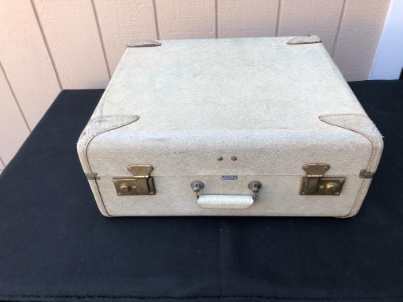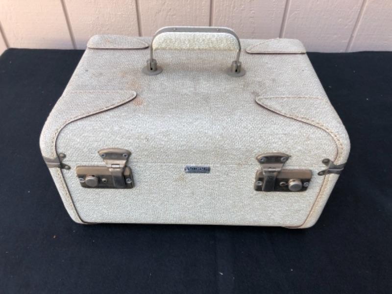 Lot 49S. Vintage “Vogue” Luggage Set, Train Case, Carry on and Large suitcase, Light Grey with Blue Satin lining, Textured Hard-case, Custom Made in San Francisco California, 1950’s “” $93.75
