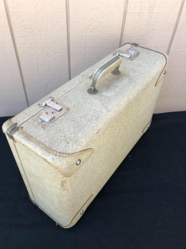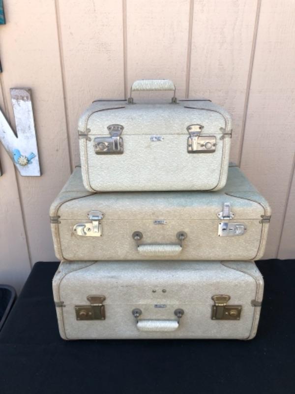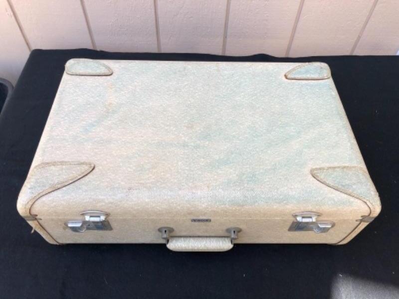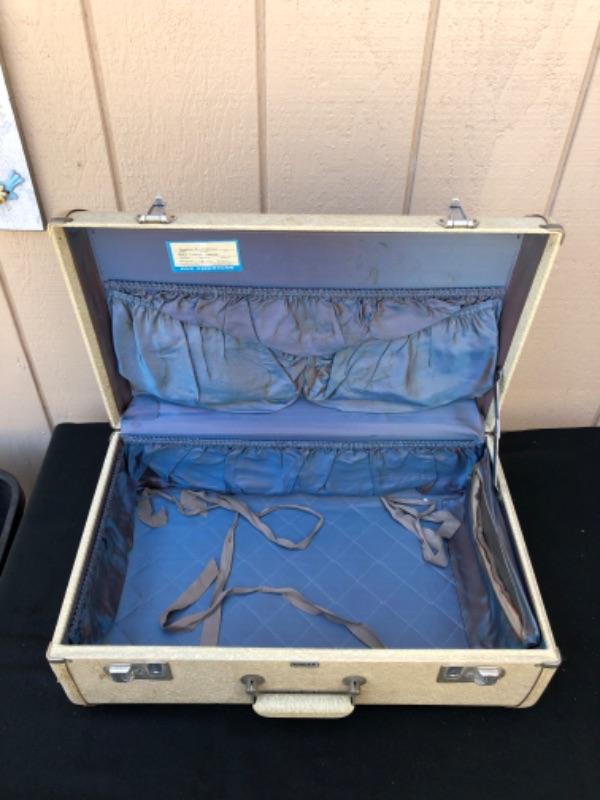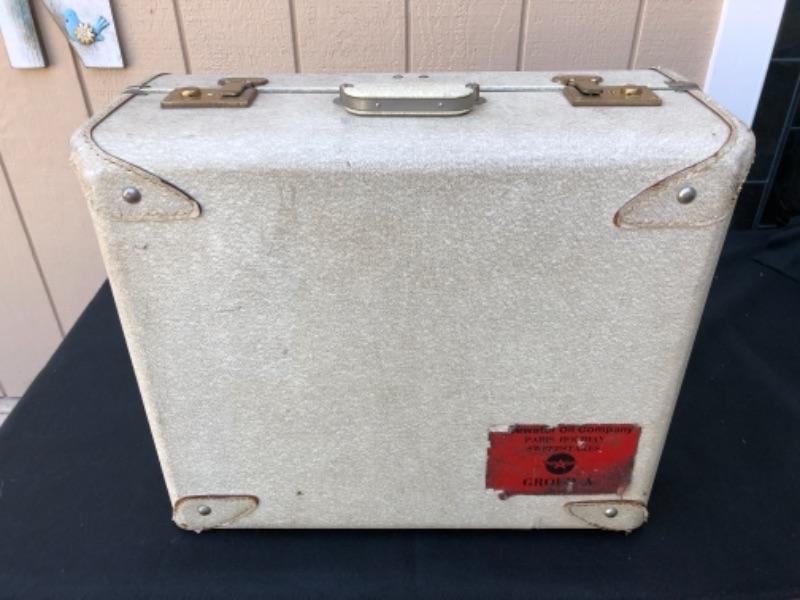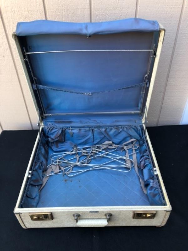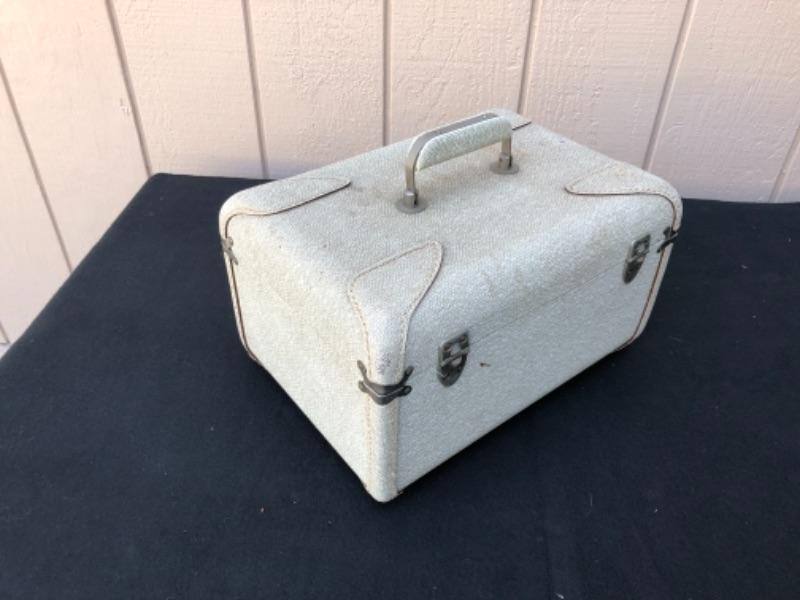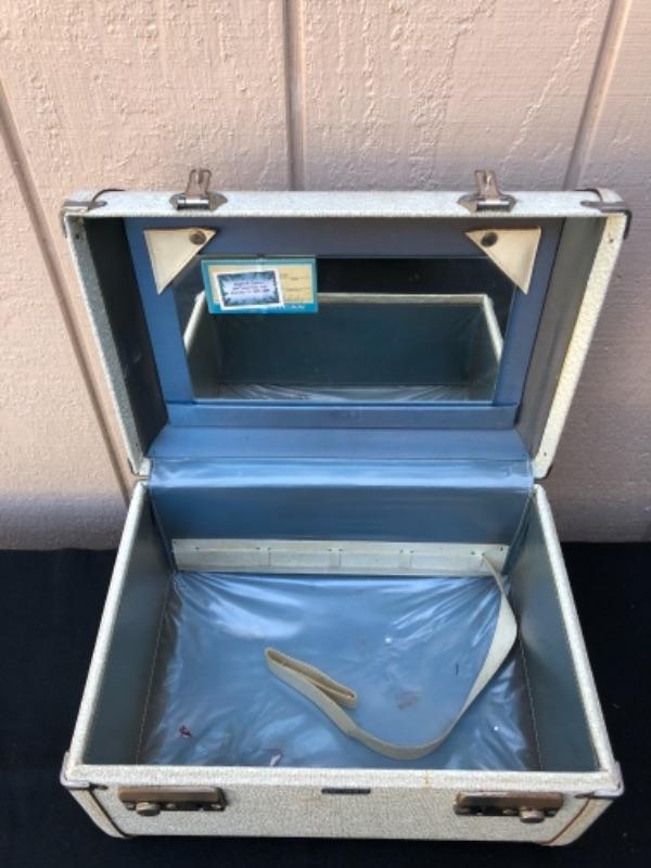 Lot 49S. Vintage “Vogue” Luggage Set, Train Case, Carry on and Large suitcase, Light Grey with Blue Satin lining, Textured Hard-case, Custom Made in San Francisco California, 1950’s “” $62.50