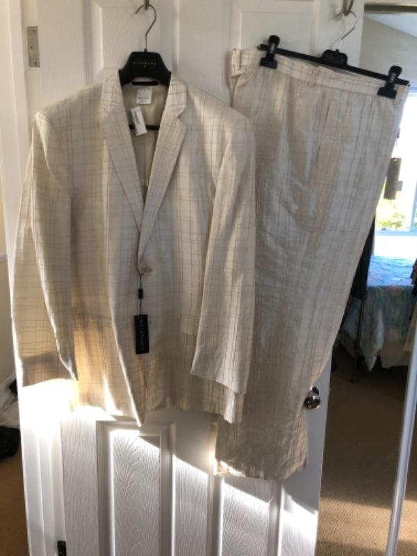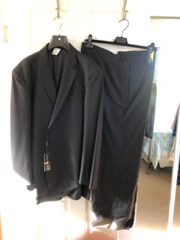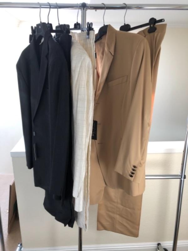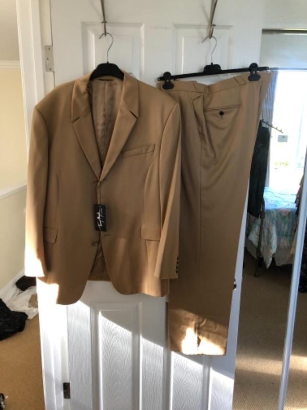 Lot 49U. Thierry Mugler suit, camel color, Italian size 58; Masamoto silk white suit, size XXL, Masamoto cashmere grey suite, size XXL--$250