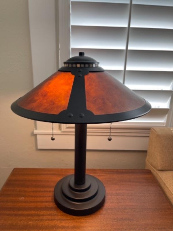 Lot 4LD. Walnut side table (24”L x 15”D x 24”T) with repro Craftsman style lamp (15”T)--$27.50