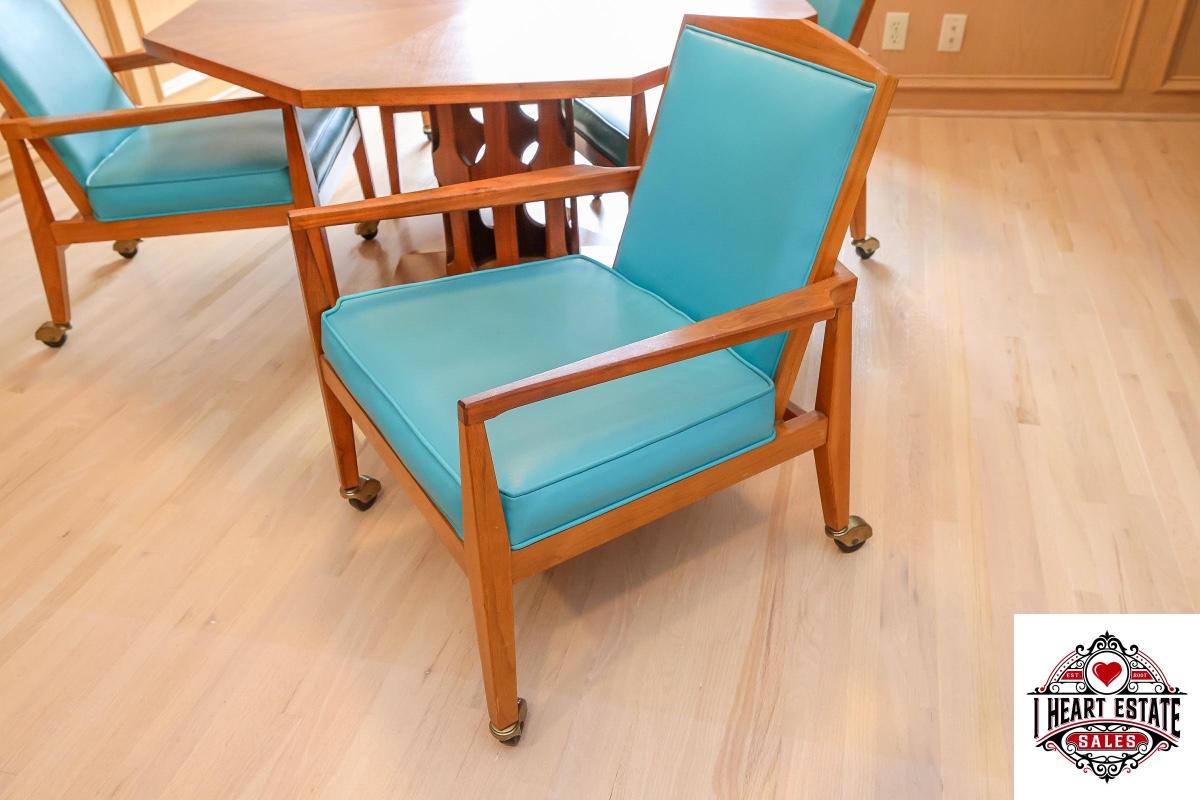 Mid Century Modern gaming/card table (4 ft wide x 25.5" tall) with 4 (Four) rolling MCM chairs 26" depth x 23" wide x 29" tall