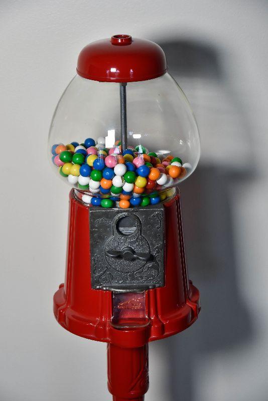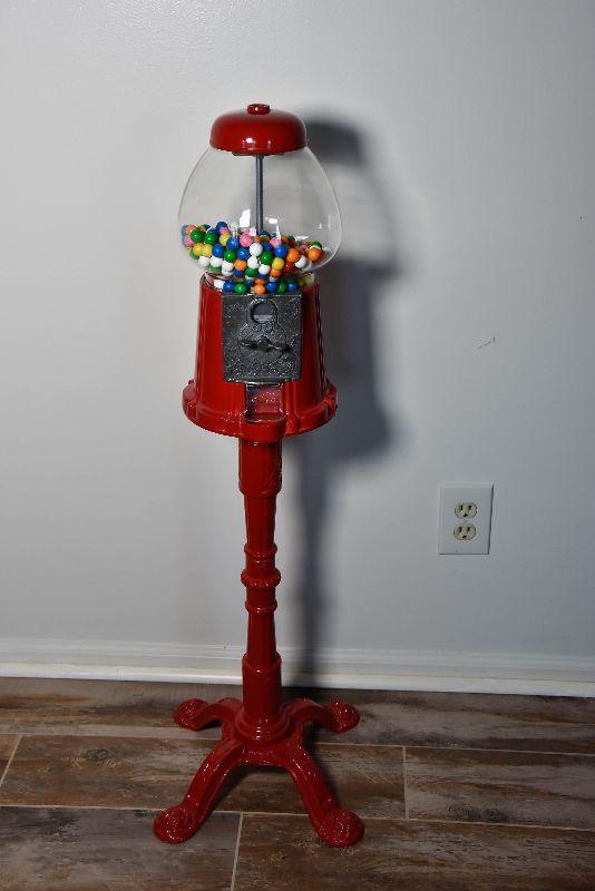 Cast iron and glass gum ball dispenser with gum balls. Quite heavy. Untested.