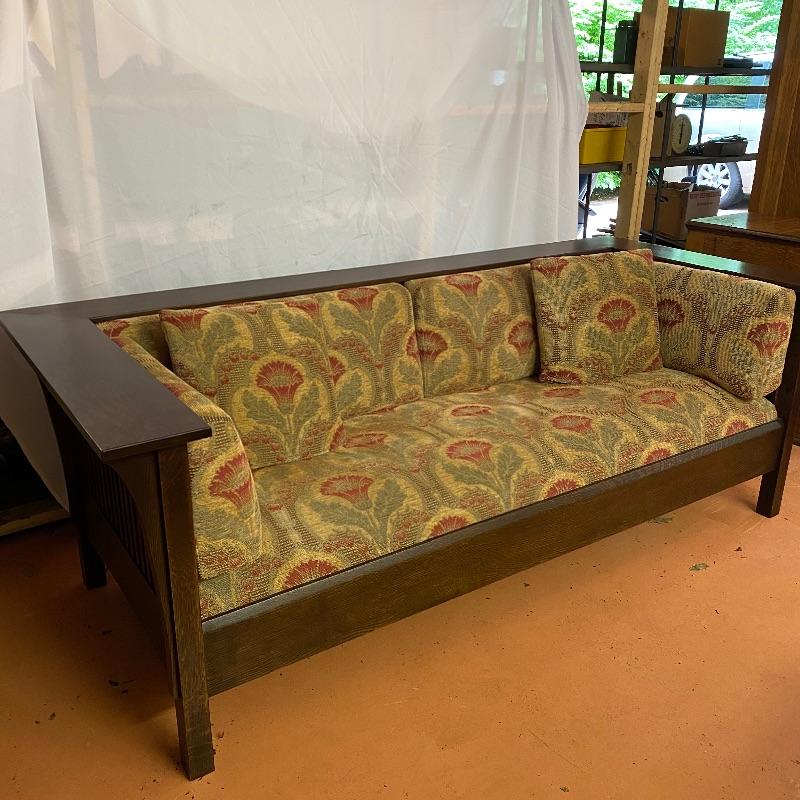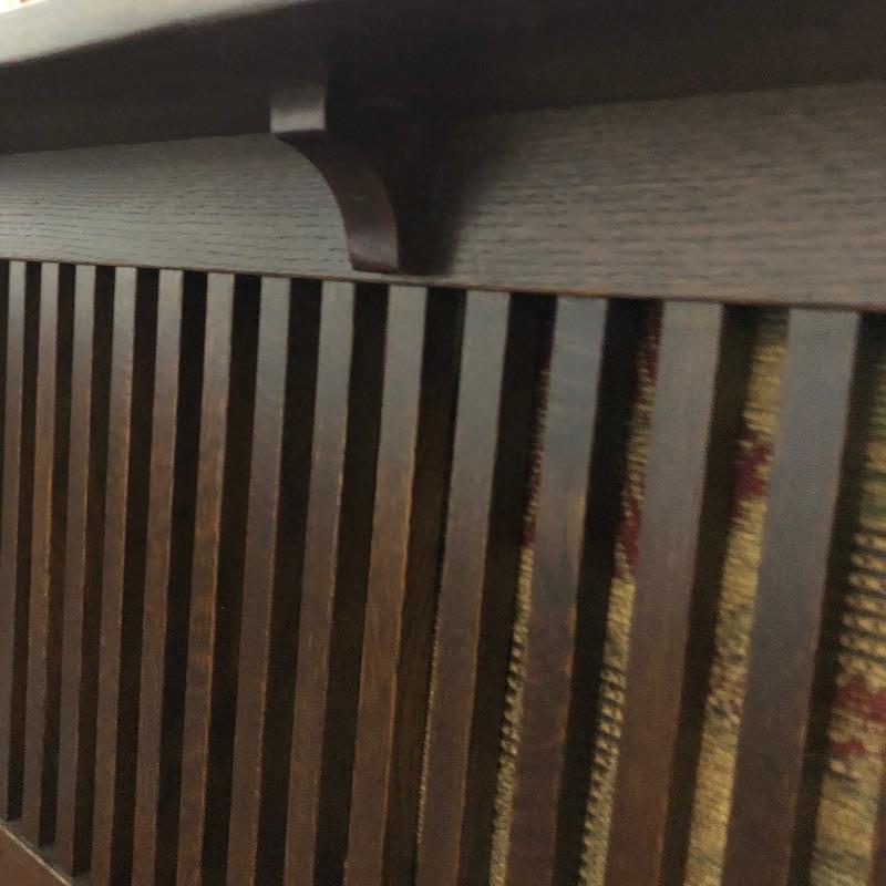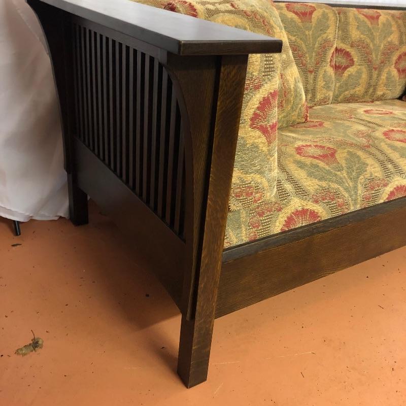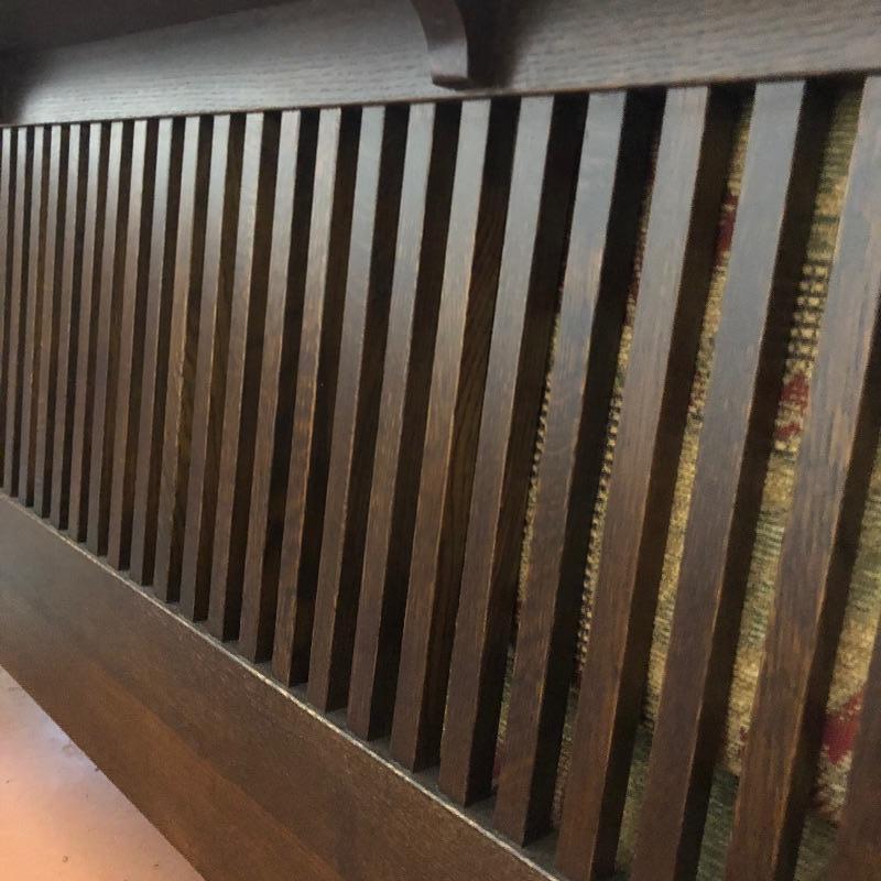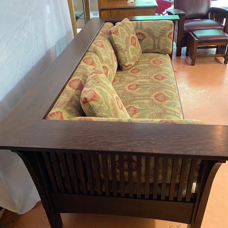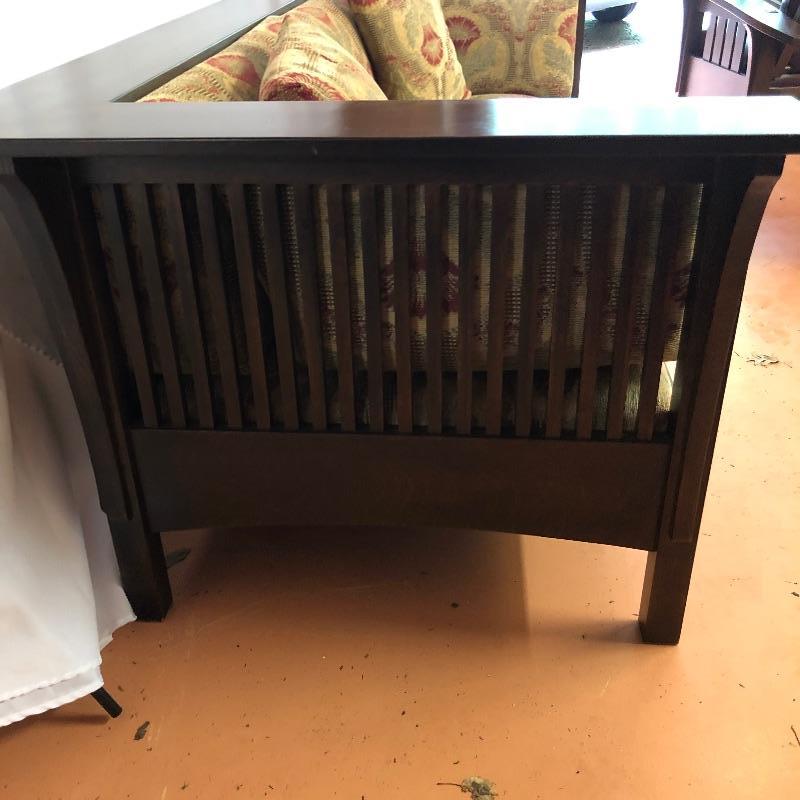 This Prairie Spindle Settle is from the Stickley Collection. It has classic Arts & Craft style are combined here with this gorgeous Stickley sofa that is super clean and shows little to no sign of wear, other than some very minor scratches on the arm, see images. Made from a dark wood with a very attractive upholstered seat that comes with 2 matching pillows.