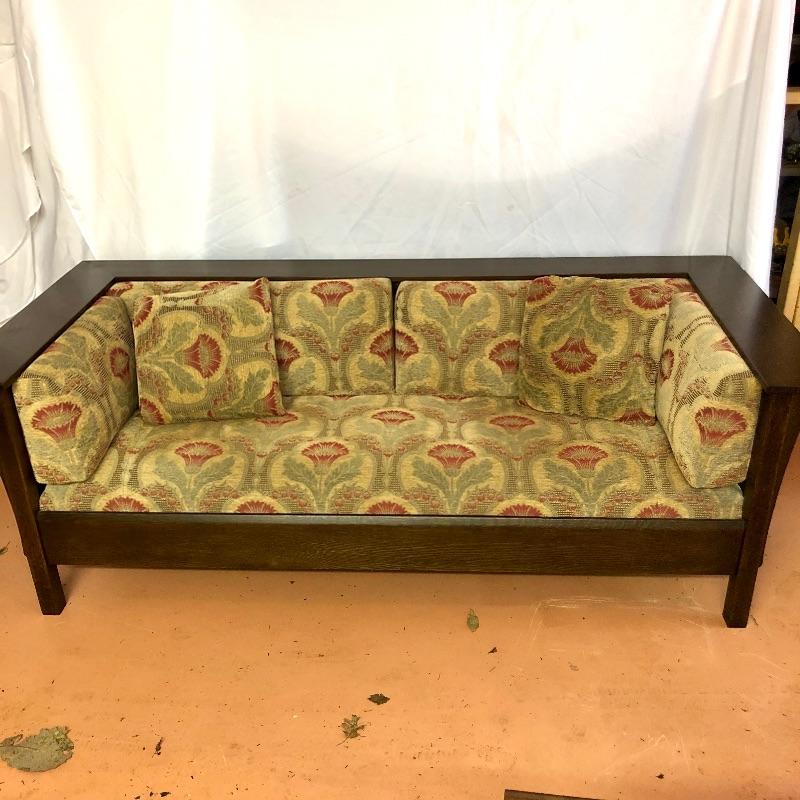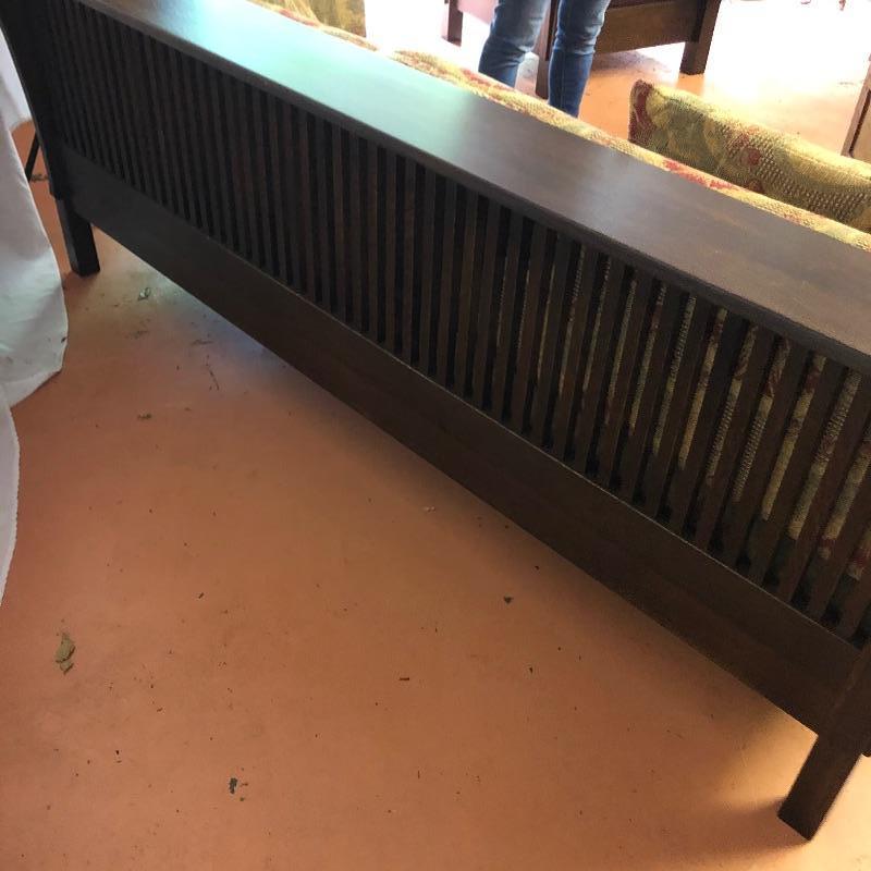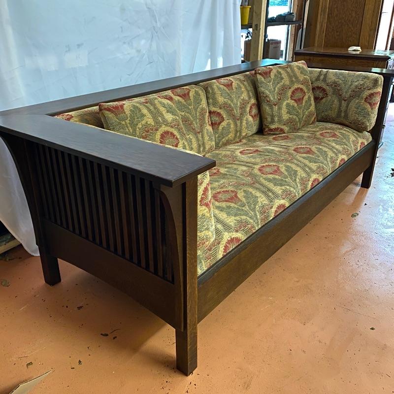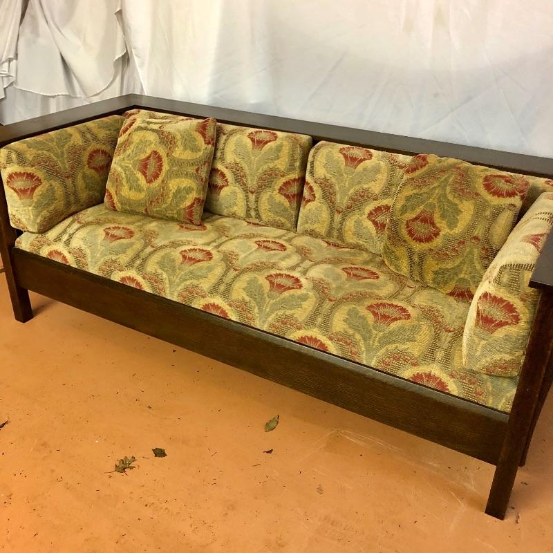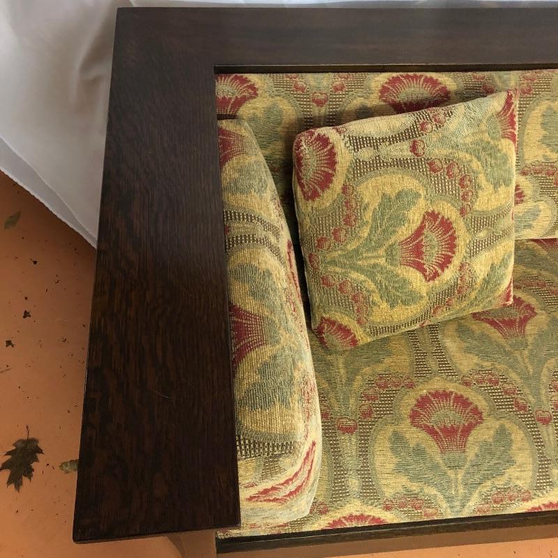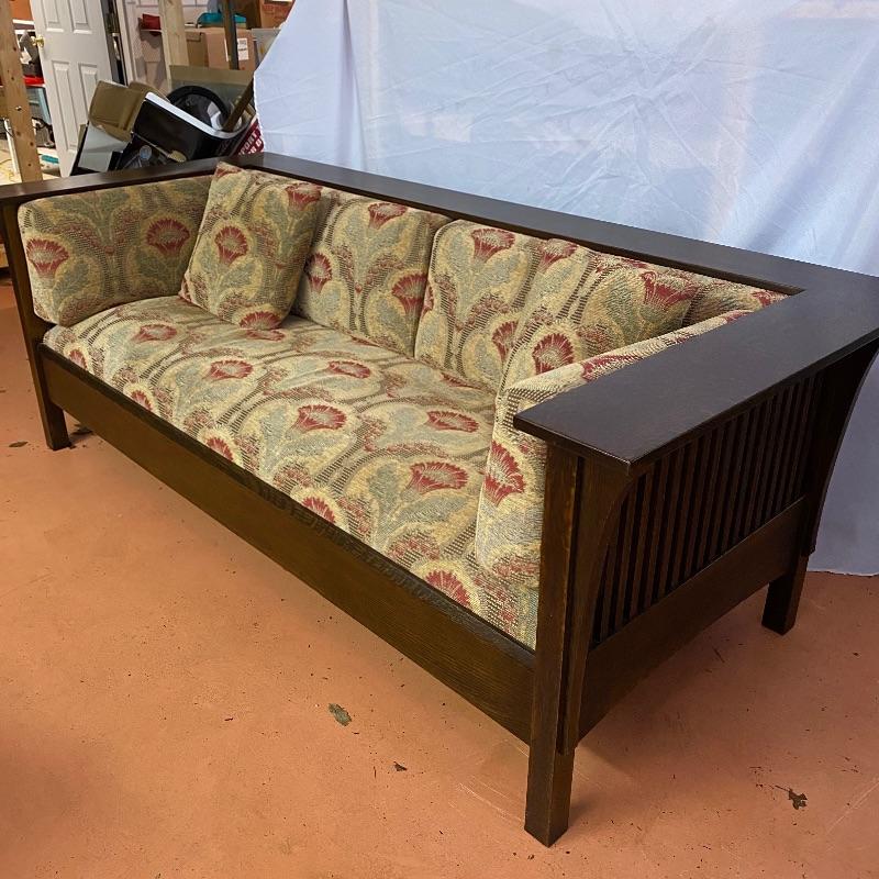 This Prairie Spindle Settle is from the Stickley Collection. It has classic Arts & Craft style are combined here with this gorgeous Stickley sofa that is super clean and shows little to no sign of wear, other than some very minor scratches on the arm, see images. Made from a dark wood with a very attractive upholstered seat that comes with 2 matching pillows.