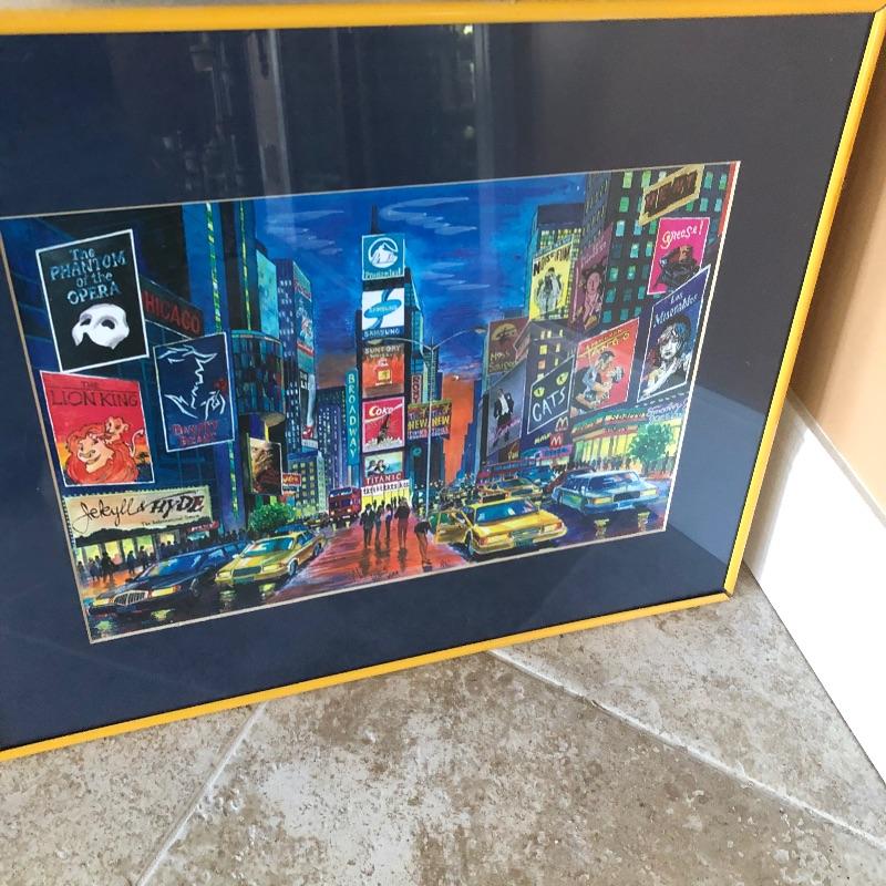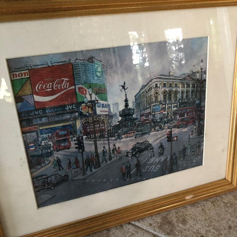 Did someone say Empire State of mind? With this lot Big Ben and Lady Liberty will be calling your name! This lot includes two matted and framed signed artworks. The H Moss one appears to be a print (London Piccadilly Circus) and the Time Square one appears to be from 1999 and have an illegible signature (Alex?). One depicts a scene of Time Square, New York, and the other depicts a busy London square. The New York artwork frame measures about 20" x 16". The London artwork frame measures about 20" x 16.5". Both are in good condition and colorful. Shipping available. Please note that shipping art can be costly so you may want to contact UPS Store for a quote before bidding (828)252-6930.