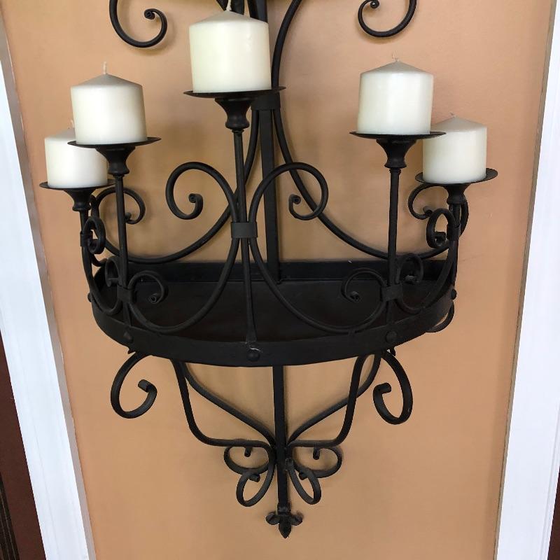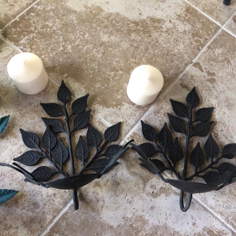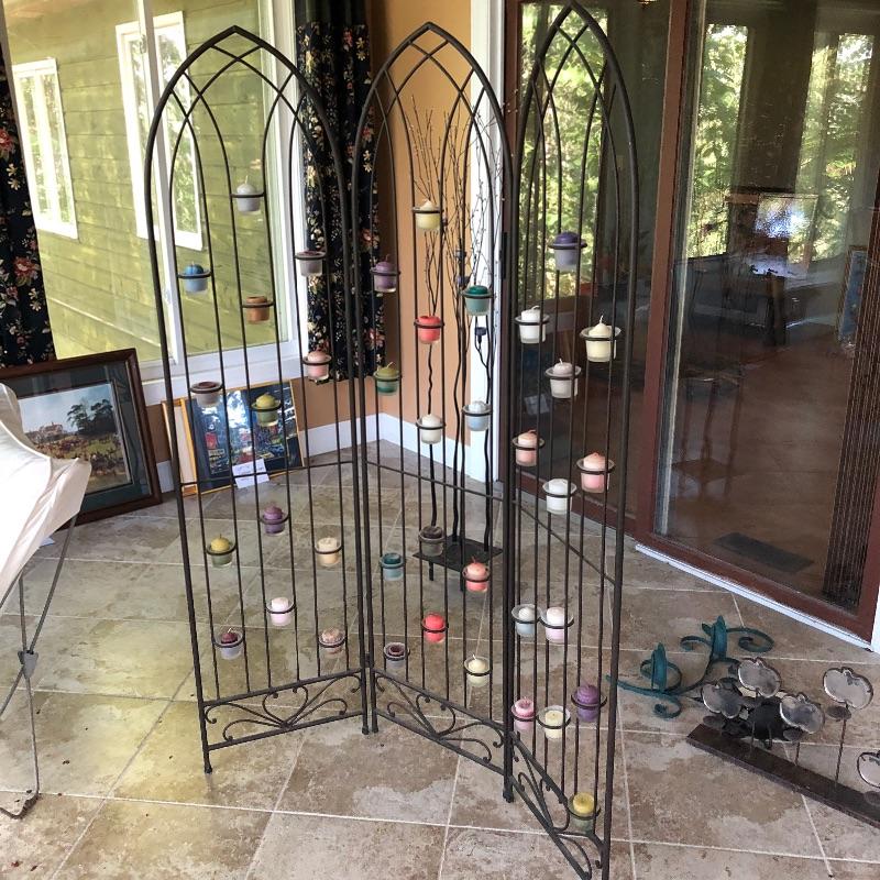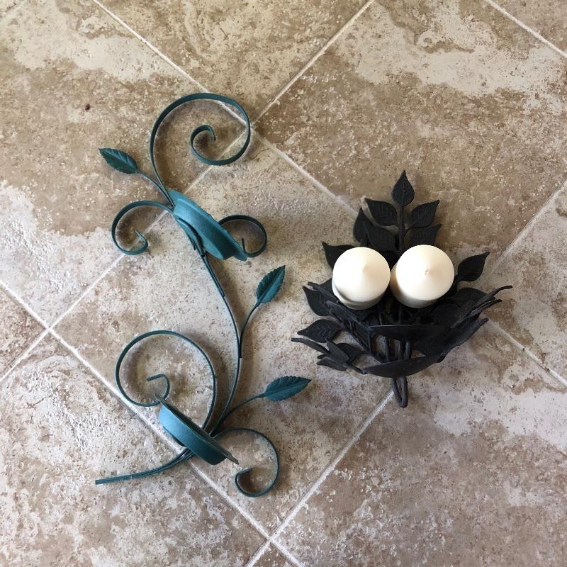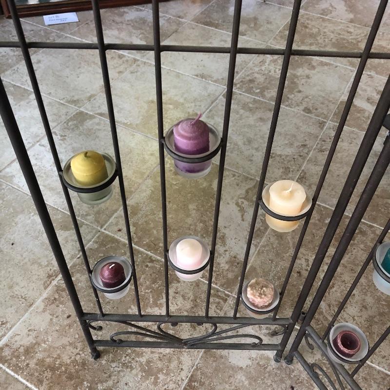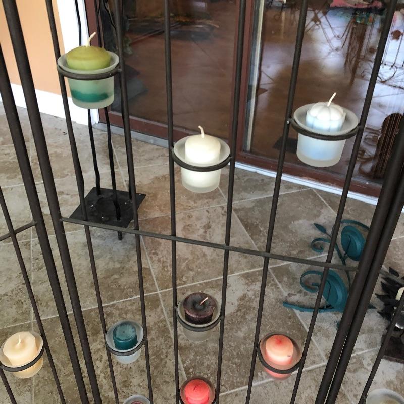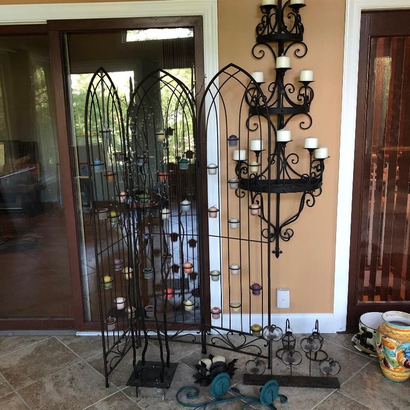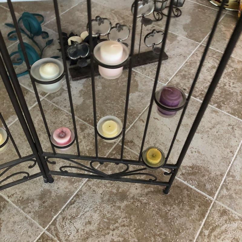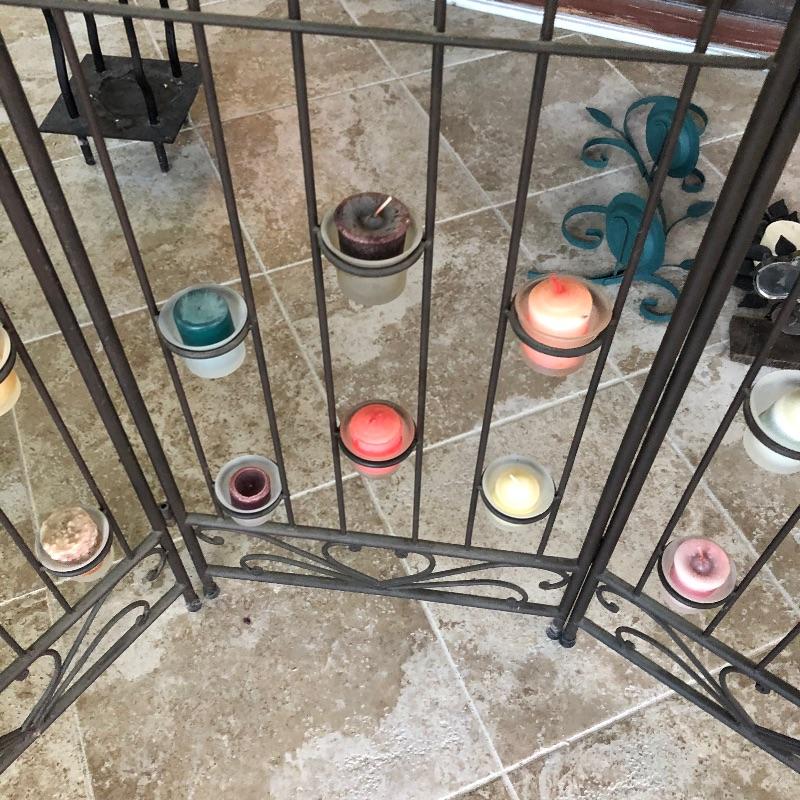 This lot is the perfect way to easily spice up any room in the house while also making it smell good! This lot includes seven metal decorated candle holders, Three of which are wall mountable. Four of the holders include candles. The largest three tiered metal, wall mountable holder measures about 64" x 22.5" x 10.5". The smallest wall mounted holder measures about 11" x 10.5" x 5". The largest table top / standing candle holder which is the screen free standing piece measures about 66.5" x 46". The smallest table top / standing holder with the pumpkins measures 10" x 7". The square based tree looking piece has glass beads on it which will catch the candle light so nicely. All are in good condition. Local pick up only.