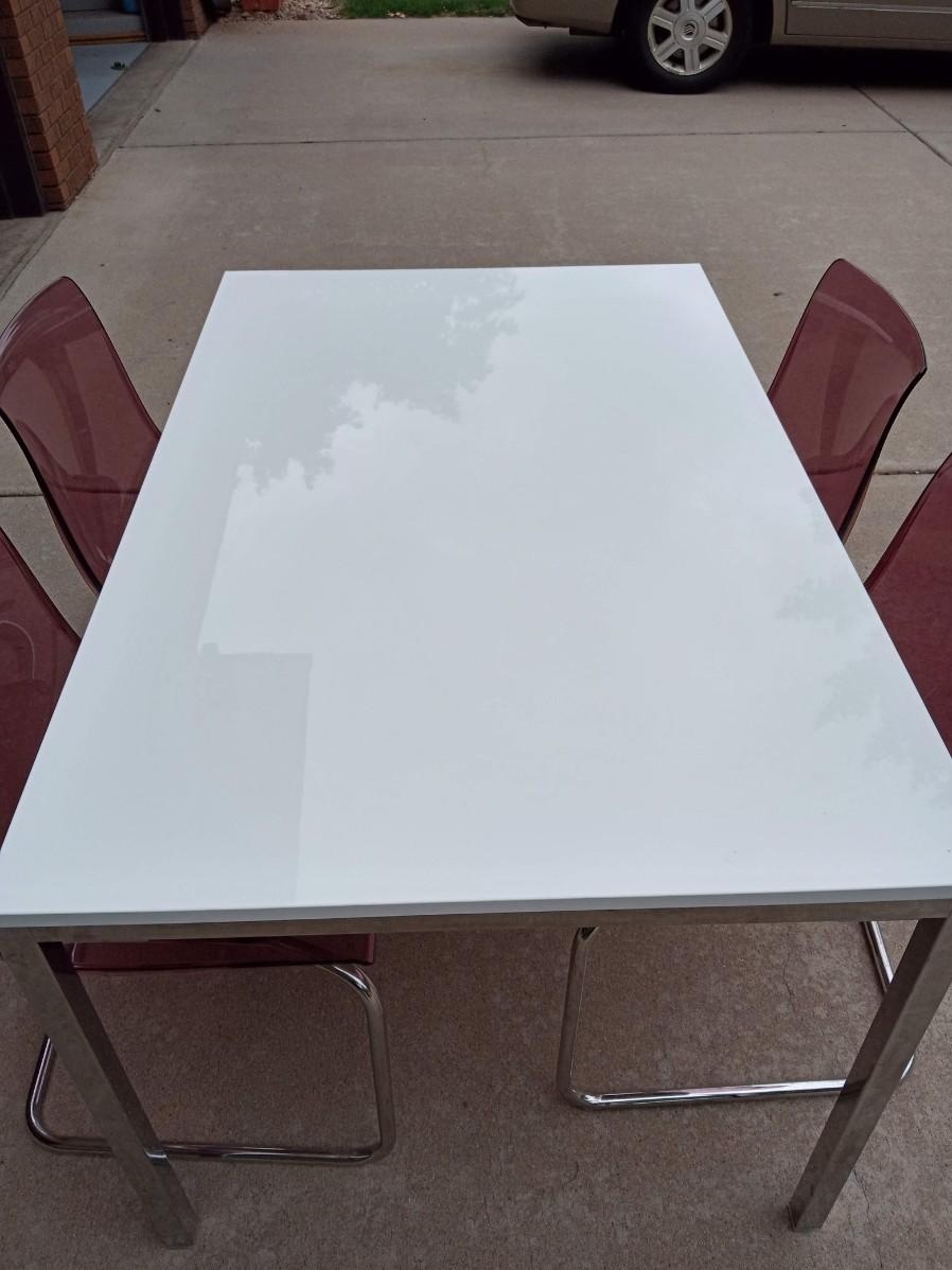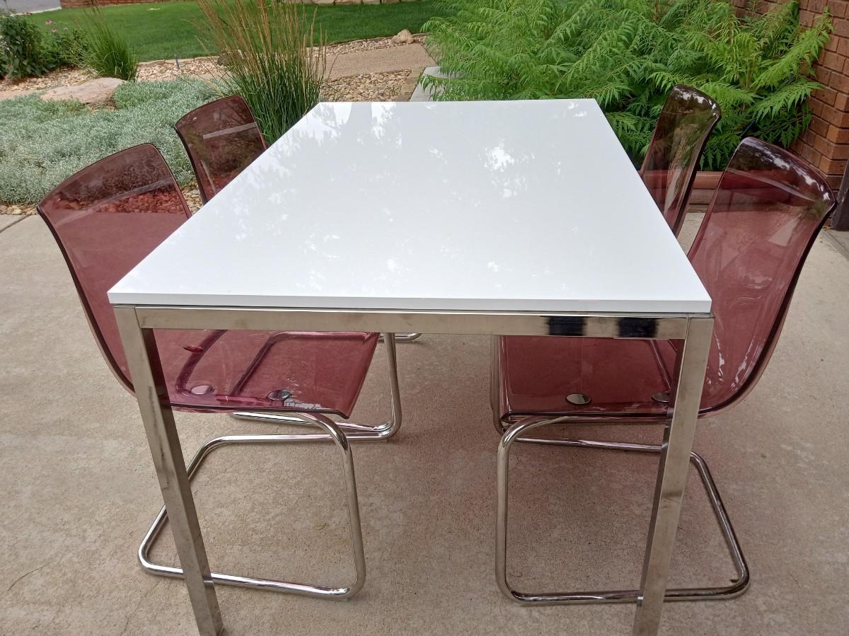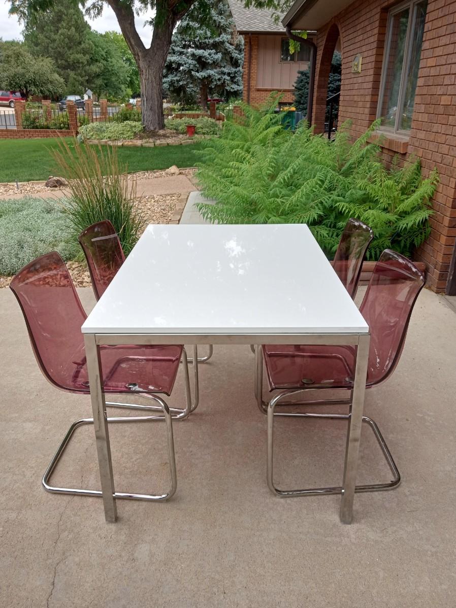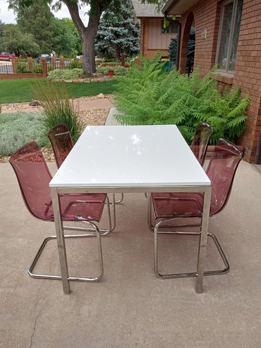 LOT 5  WHITE DINING TABLE WITH 4 LUCITE CHAIRS