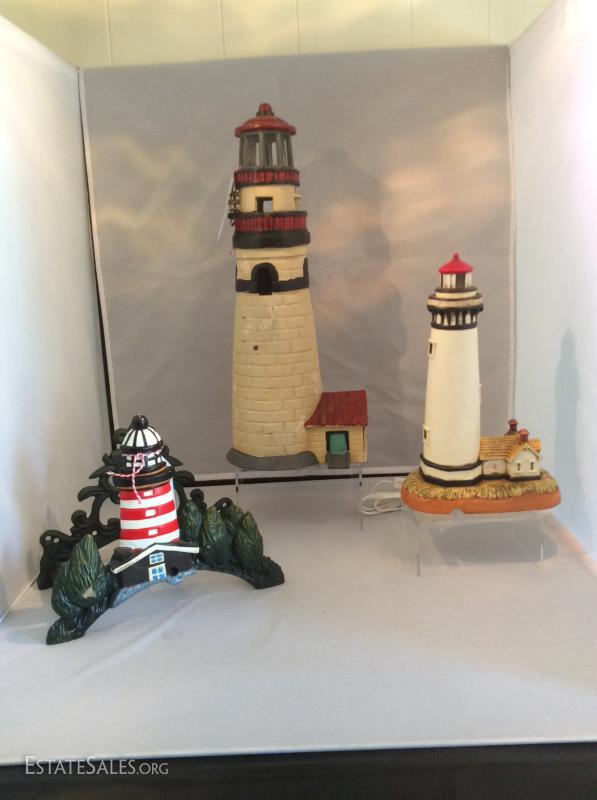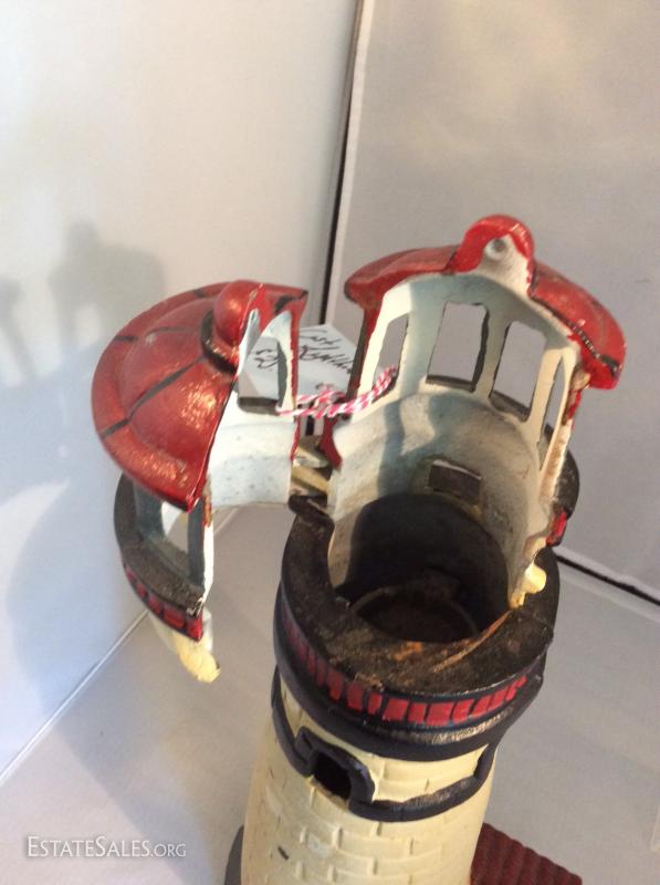 The large Lighthouse is seems to be cast iron or some kind of heavy metal. It opens up at the top so you can put a candle it giving it the full real Lighthouse effect.