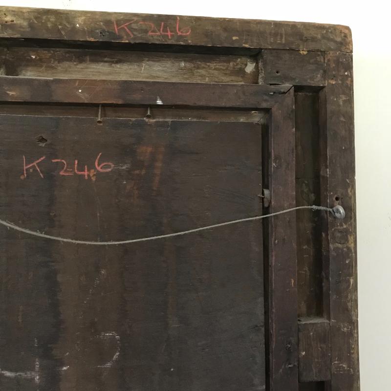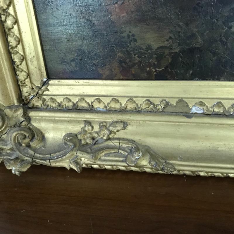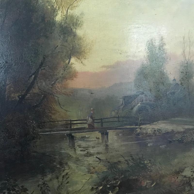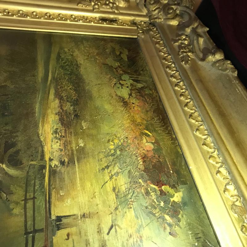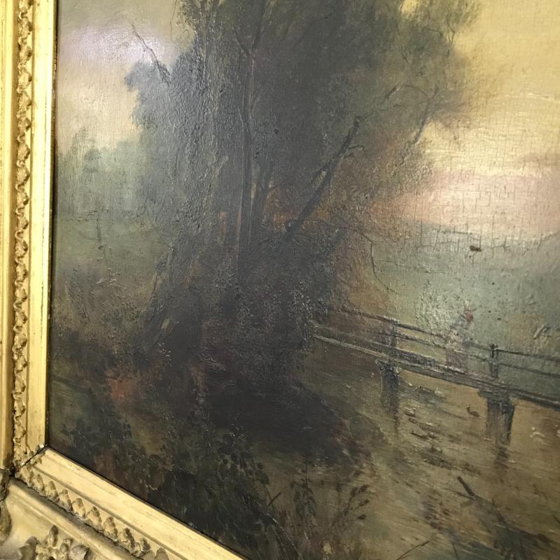 This gorgeous depiction of a woman on a bridge at dawn/dusk appears to be an oil painting. Nailed gold covered wood frame has damage (see photos). Artist signature present, but could not be verified. Approx. 32” x 26”. No shipping.