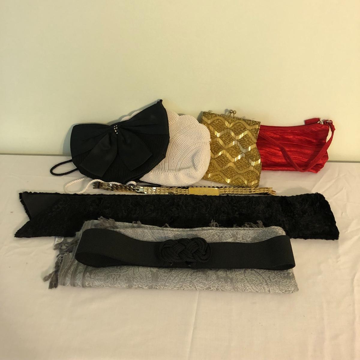 Be ready for a night on the town with this selection of evening purses and more. Lot includes Laura beaded purse, white beaded purse and a black and red purse. Also includes scarf, gold colored metal belt and a black belt. Laura purse is missing shoulder strap. Scarf measures 55” x 70”.