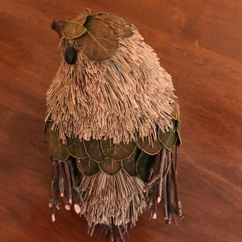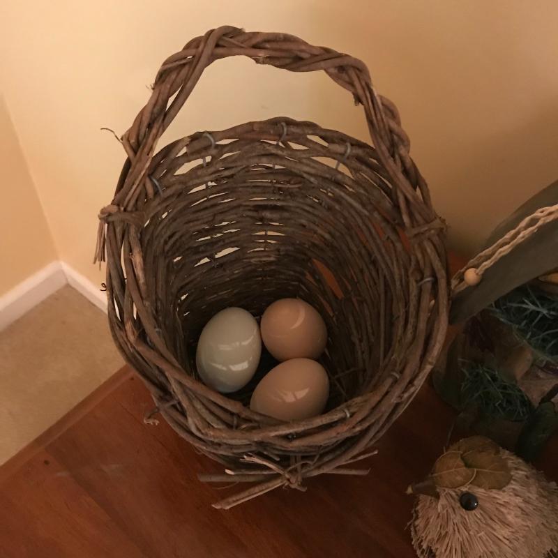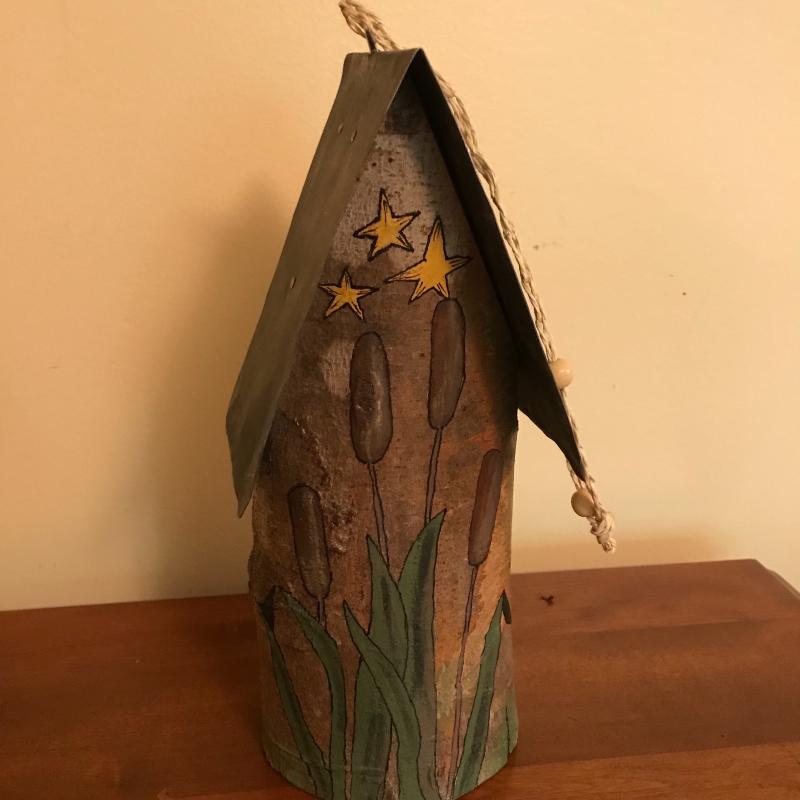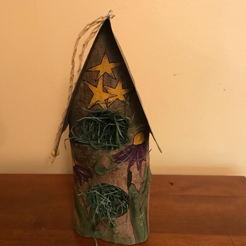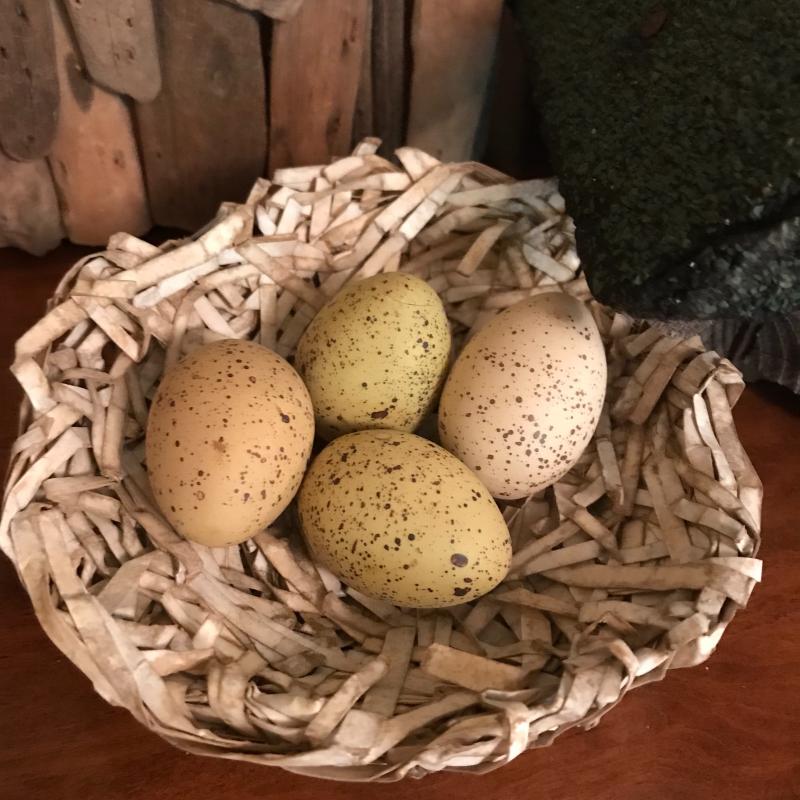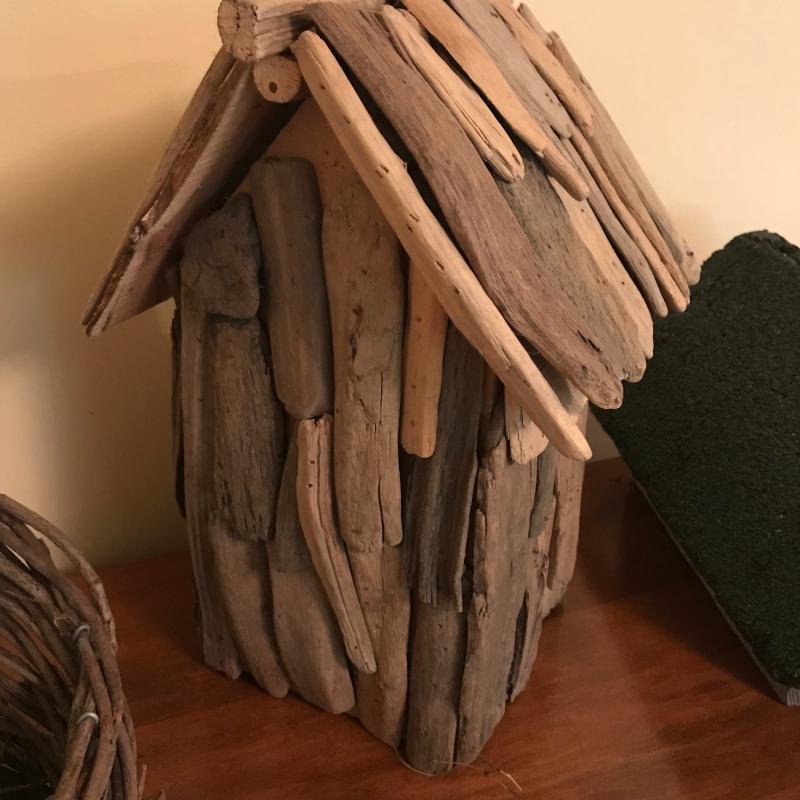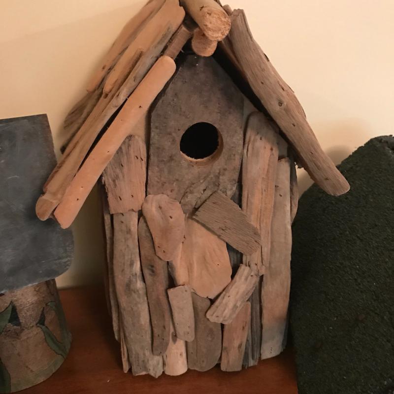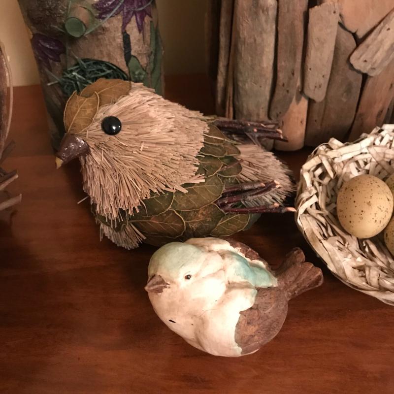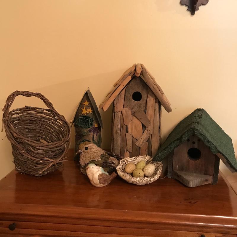 Three unique bird houses, baskets, eggs and two sitting birds. No known artists. Realistic eggs are handmade and smaller ones look to be real. Largest bird house is made of driftwood and measures approx. 9”x12”. Local pick up only.