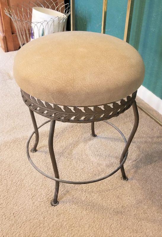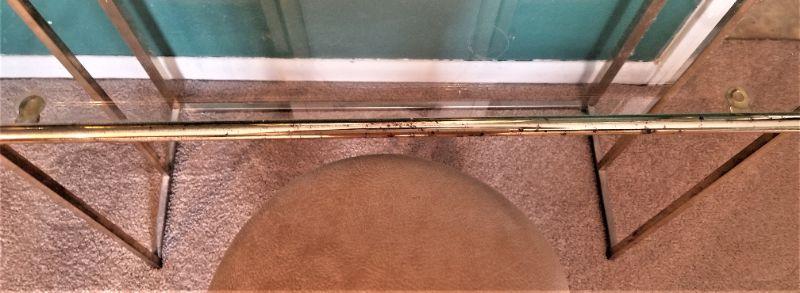 Brass and glass vanity with mirror - cute stool with wrought iron base. Brass has some wear, as shown. 52" tall at tallest point, 30" wide, 14" deep. Stool is 17.5" tall and is in good condition.