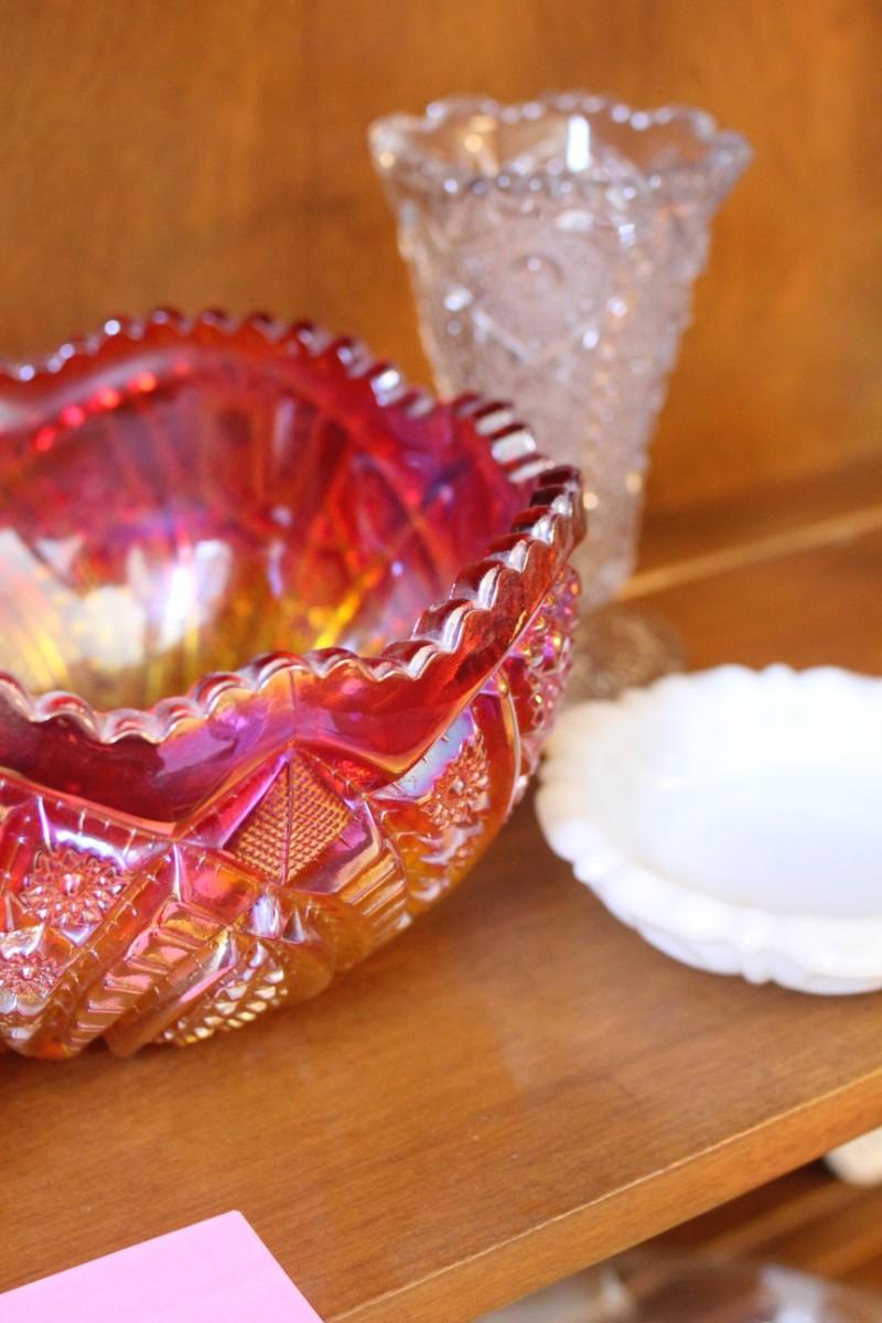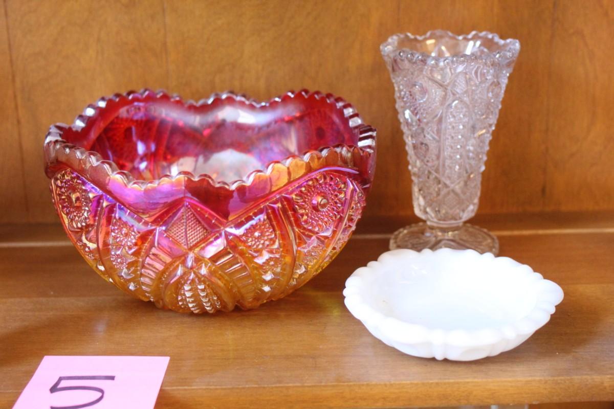 Lot 5 Carnival Glass Center Bowl, Milk Glass, Purple Glass