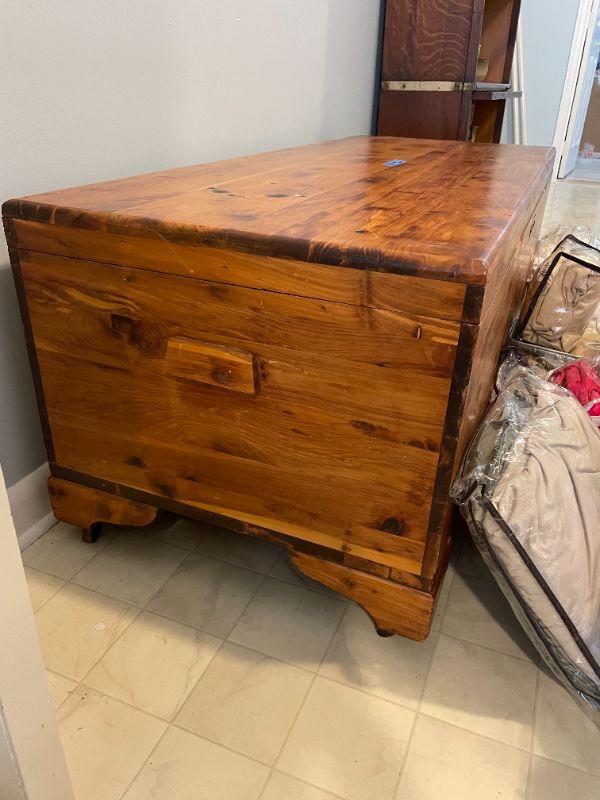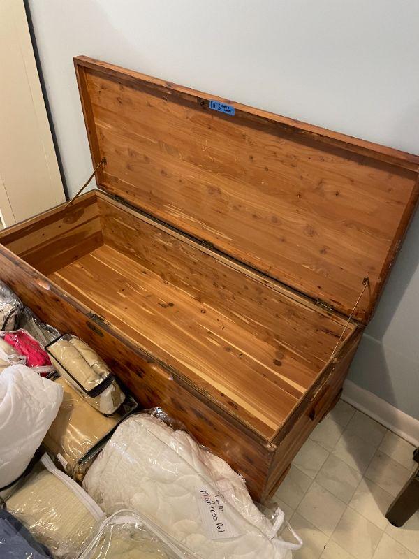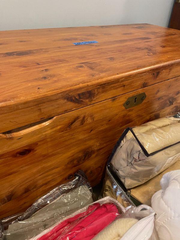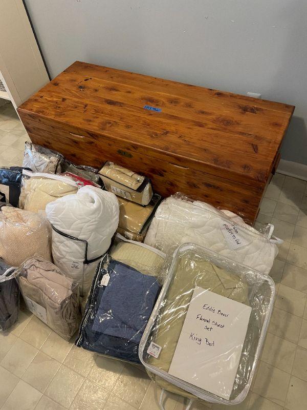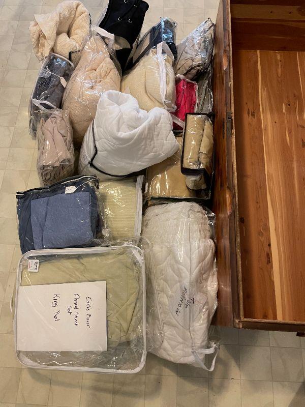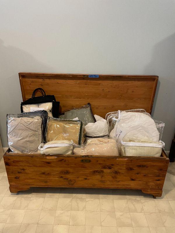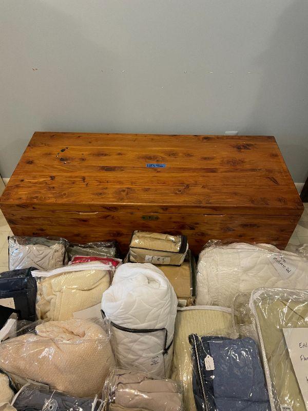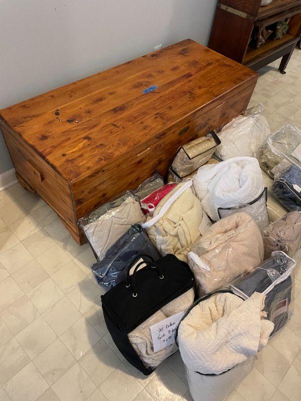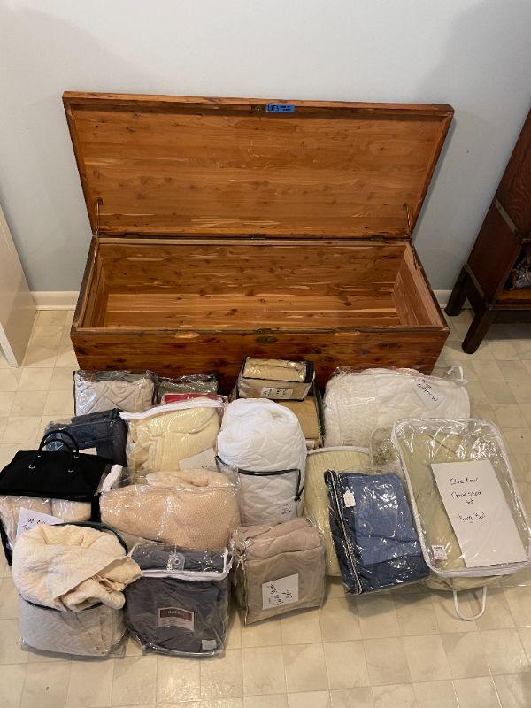Cedar chest (49'' L x 21'' W x 19'' tall), 17 different blankets/sheets/drapes/bed skirts/ covers king and queen sizes.