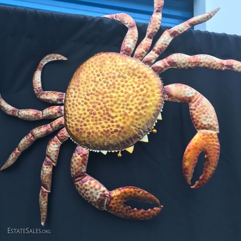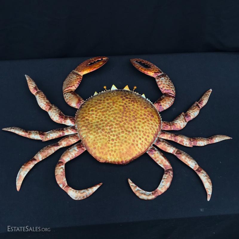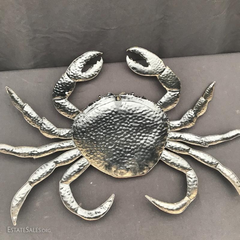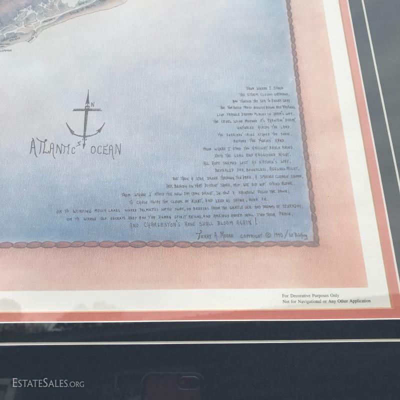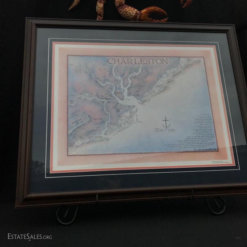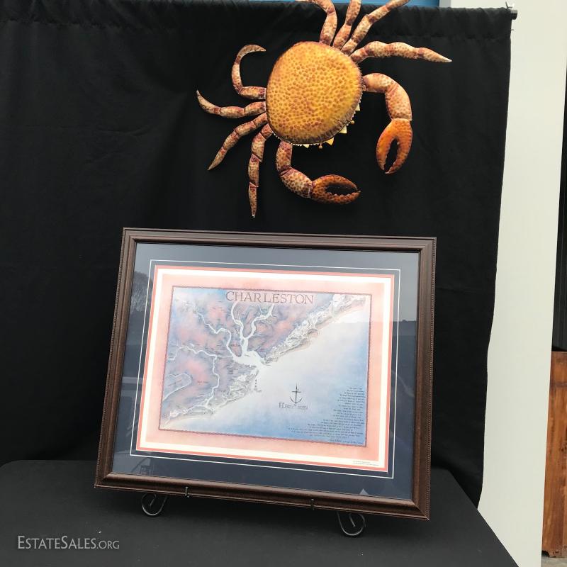 Print of Charleston coastal mapping for decorative use only. Created by Terry A. Moore copyright 1990. Print measures 29.5” x24”. Tin crab with hook for hanging on the wall. Bronze and gold tones and measures 29” wide. This lot is available for shipping or local pick up in Asheville, NC.