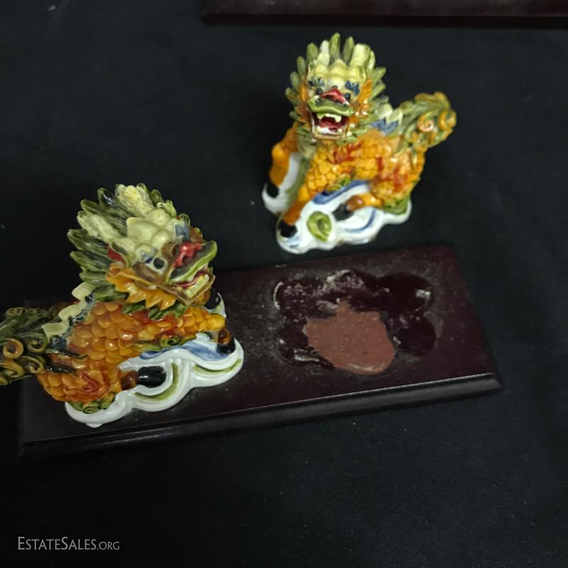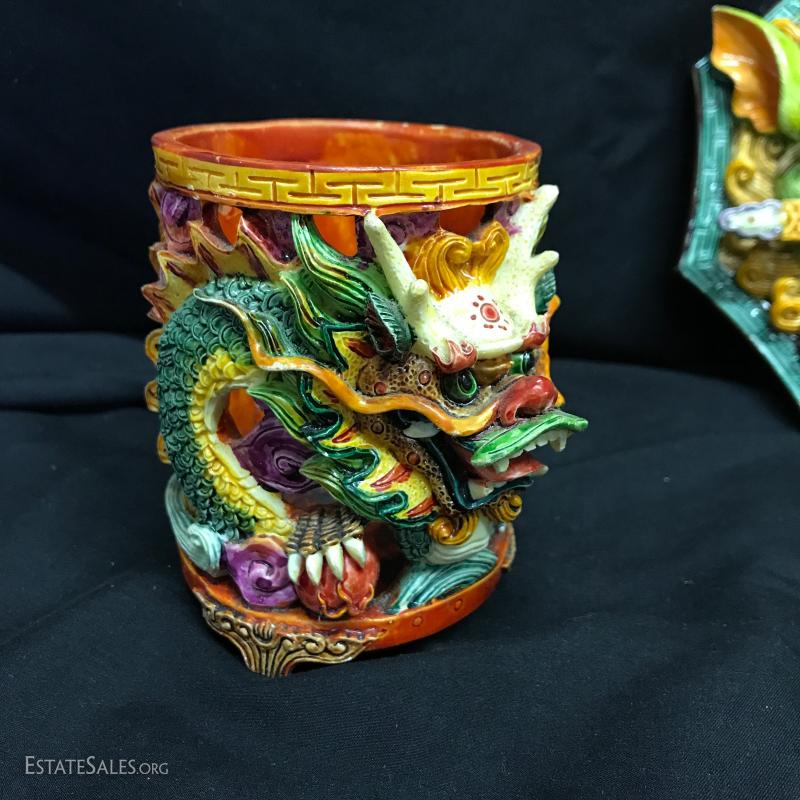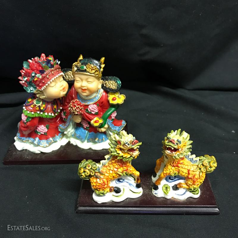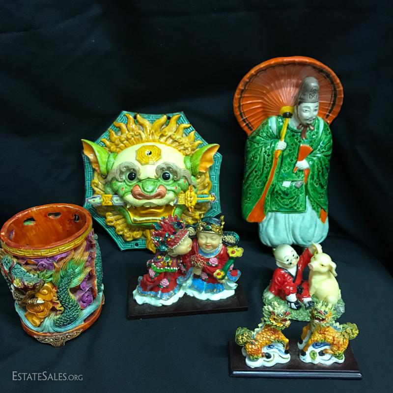 Bright colored decor. Includes candle holder, wall plaques and figurines. One tiger is not attached to wood. See photo for details. Tallest piece is man with umbrella, 9" tall. Smallest tigers are 2.5"tall. Shipping available or local pick up in Waynesville, NC.