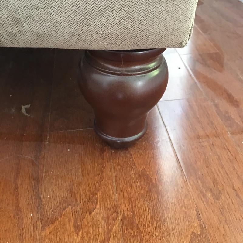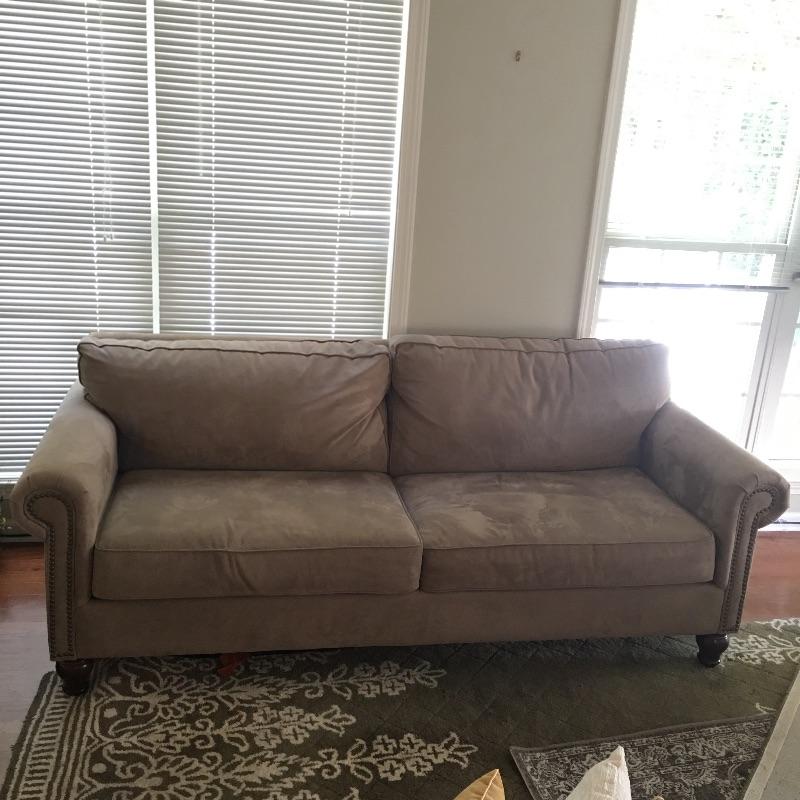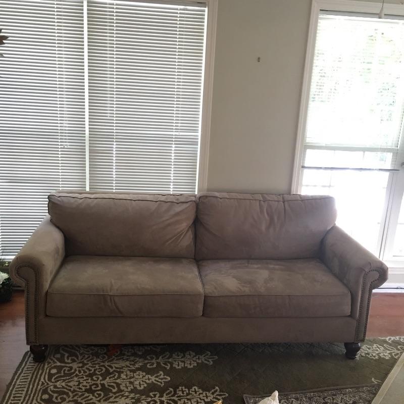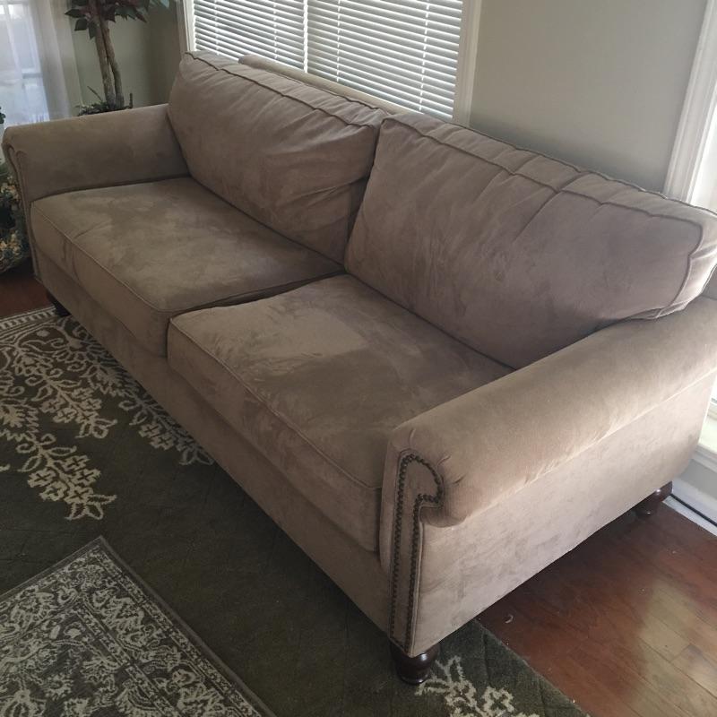 This long couch will be great for entertaining and look great at the same time. It is a nice tan color and has great brass nailhead trim and wooden feet. Couch measures 36” x 80” x 31”. Bring help item is heavy. No stairs to remove.