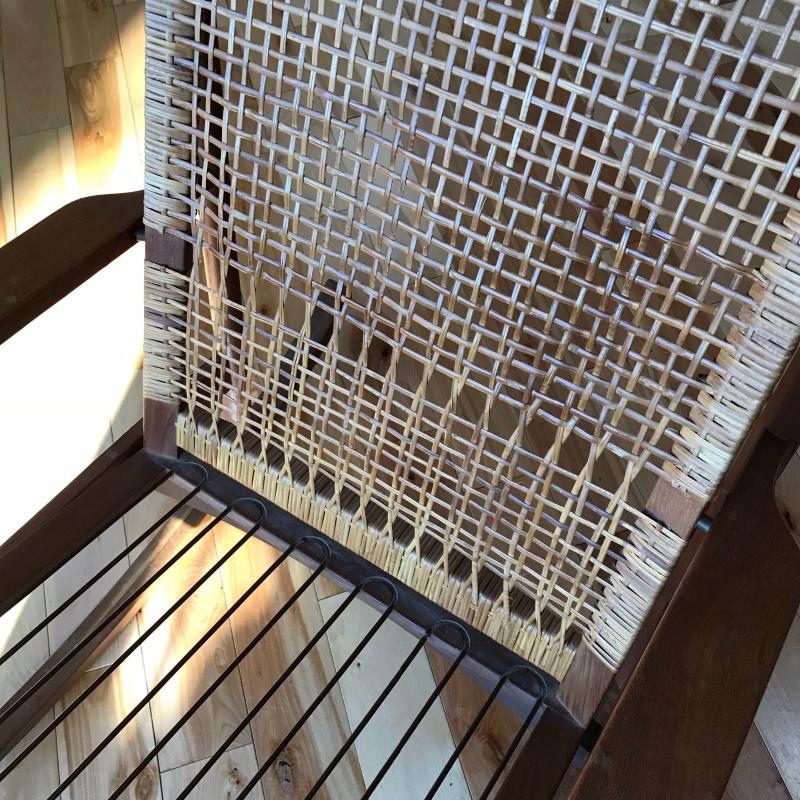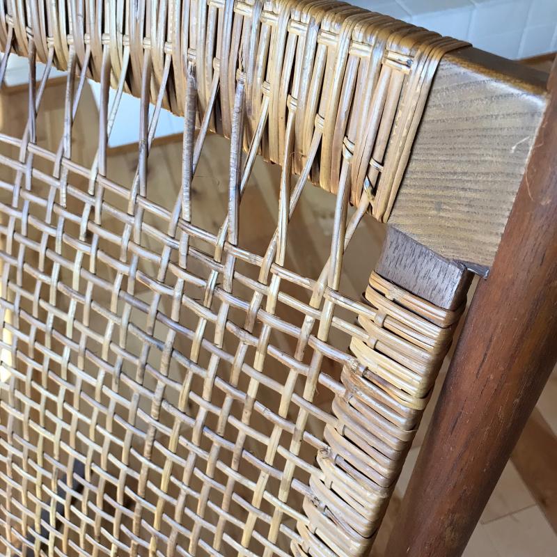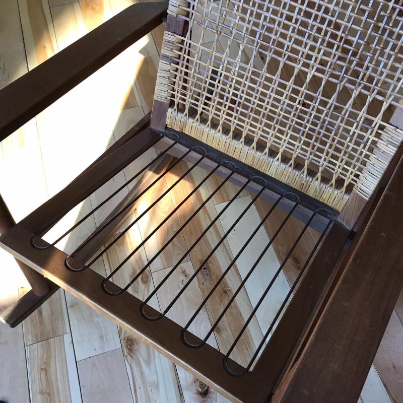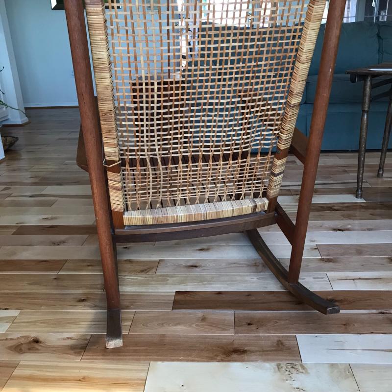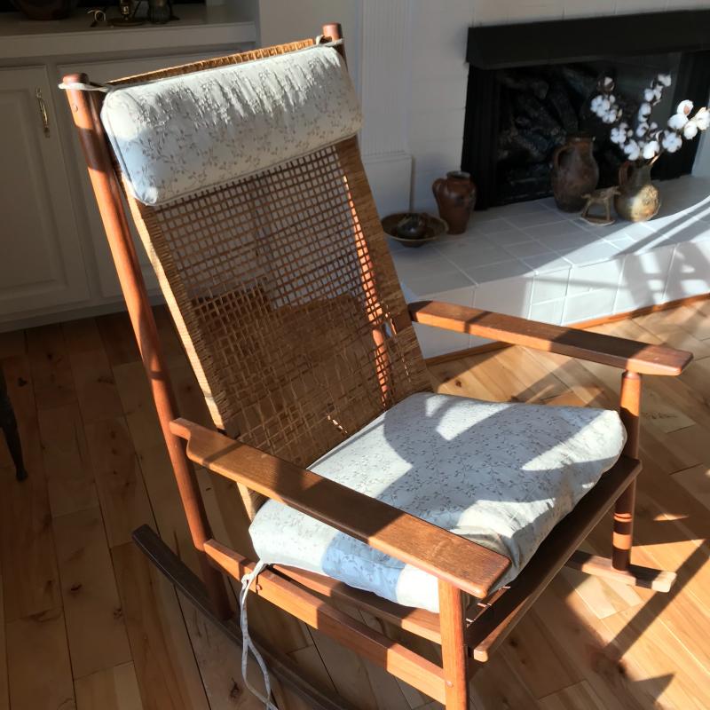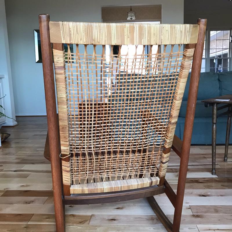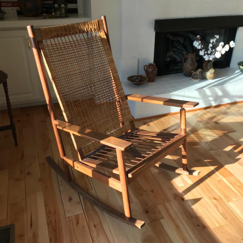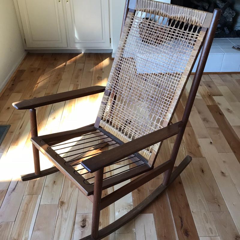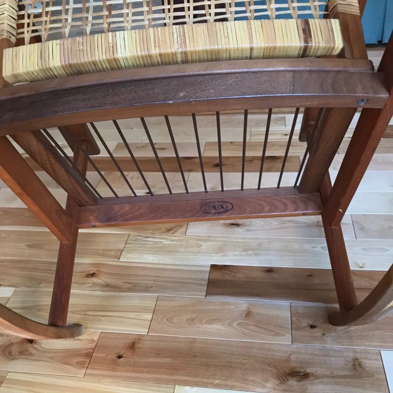 Gorgeous rocking chair made by DUX from Denmark. Woven back and rubber seat. Includes removable cushion. Gorgeous well-made piece. Some small scratches on one leg. See pics. 37”l x 26”w x 41”h. No Shipping available. Only local pick up in Asheville, NC.