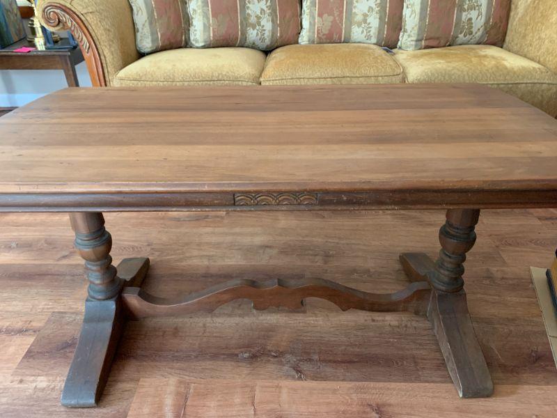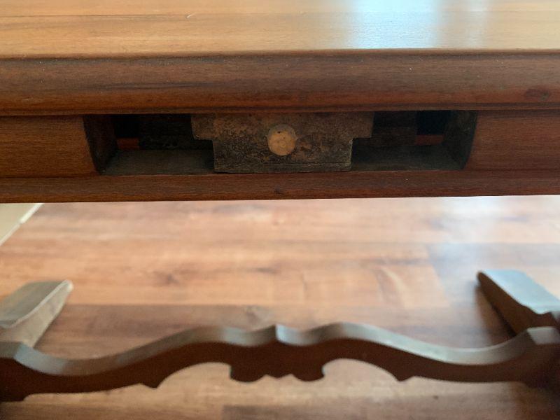Drop Leaf English Tea Table.47.5" long x 23" tall. 24" across closed, 41" across with leaves open. Wear to the finish. Missing decorative pull. Selling as is.
