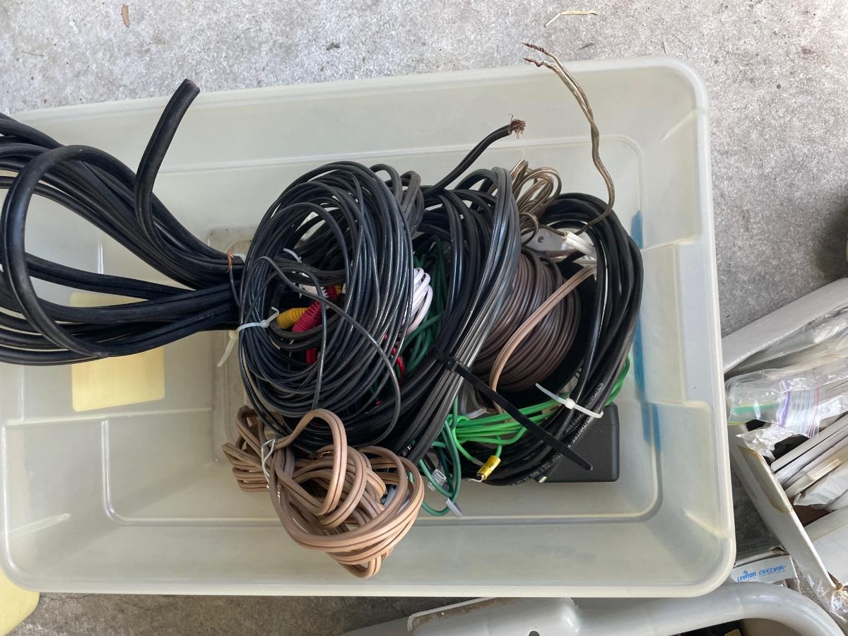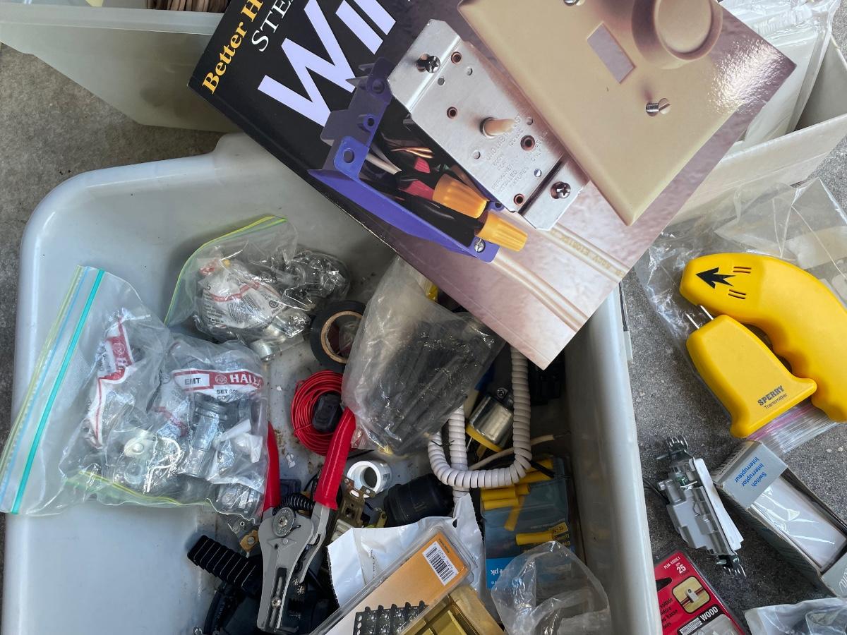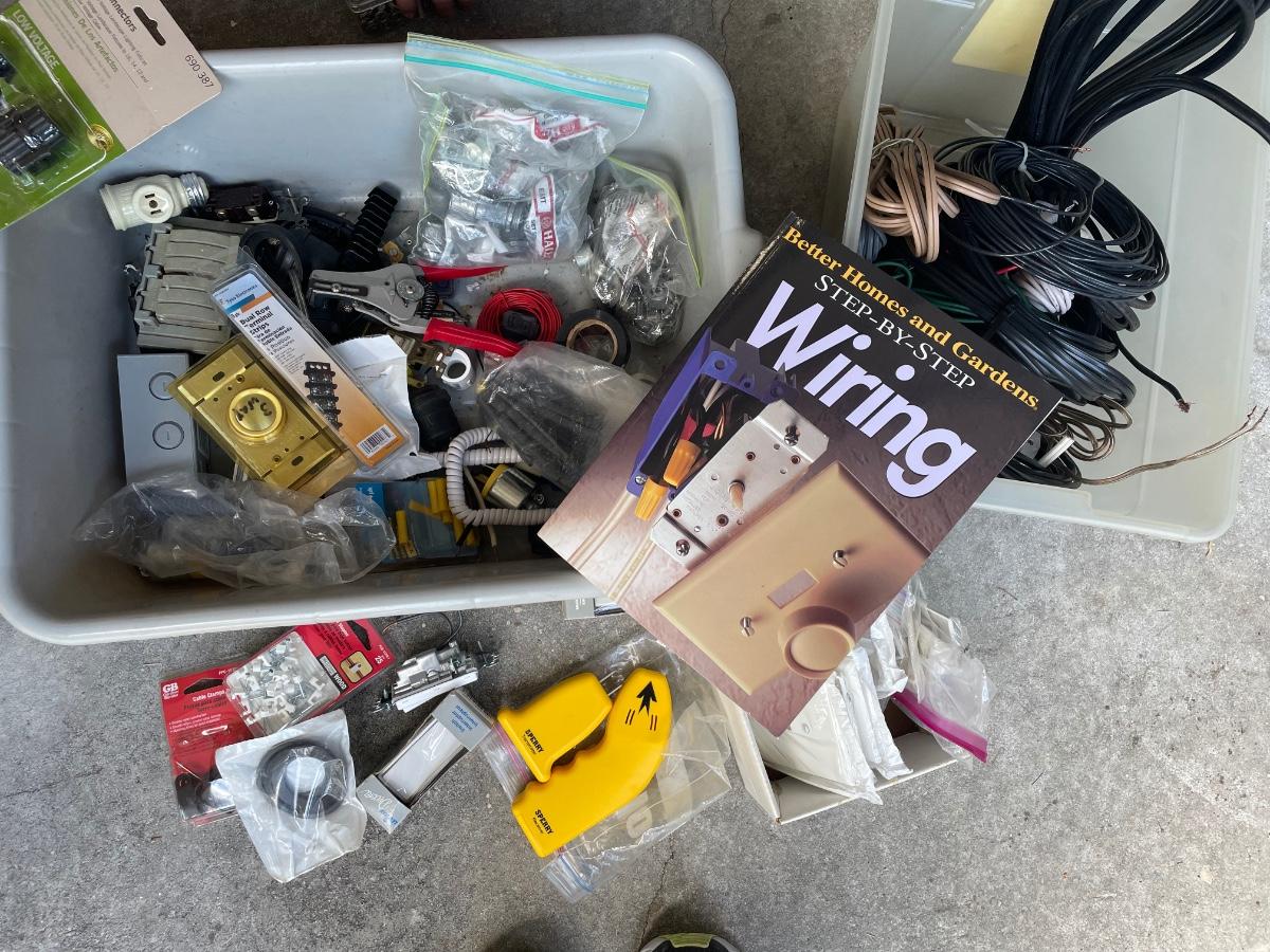 Two bins of electrical wire, wiring tools and supplies--huge variety and a book "Step-by-Step Wiring"