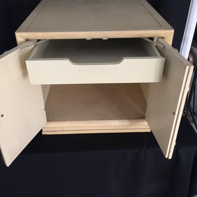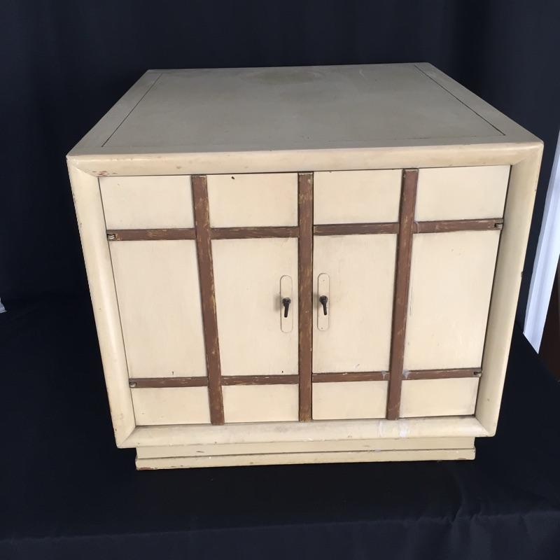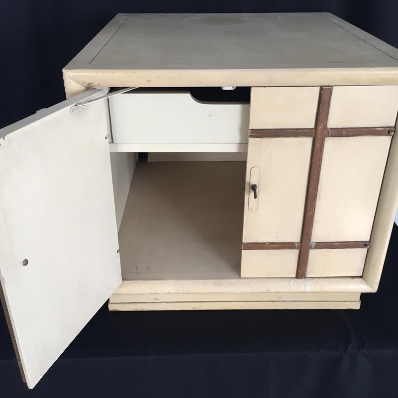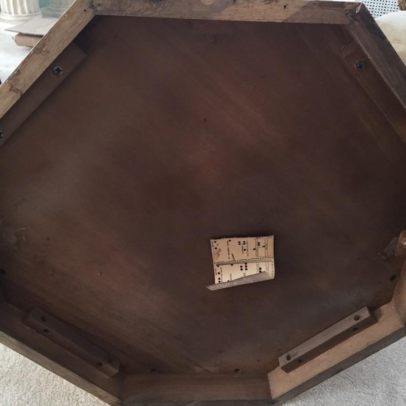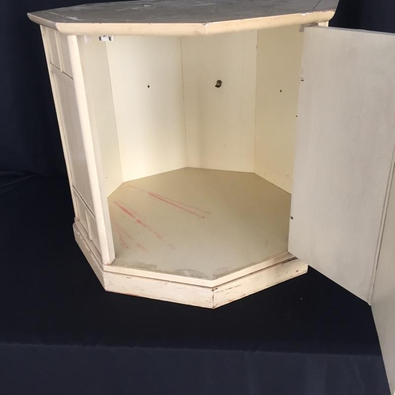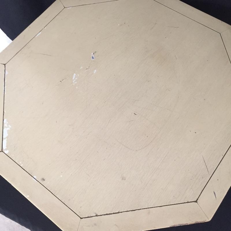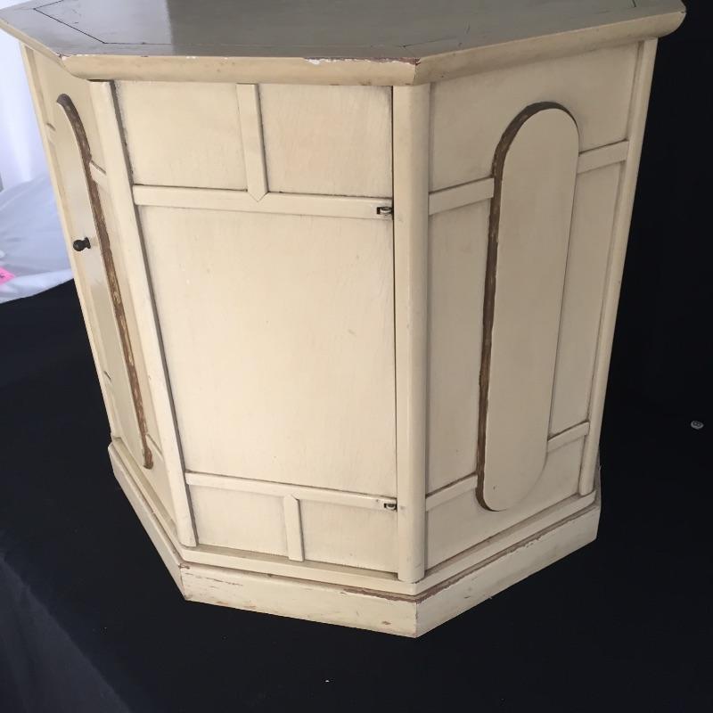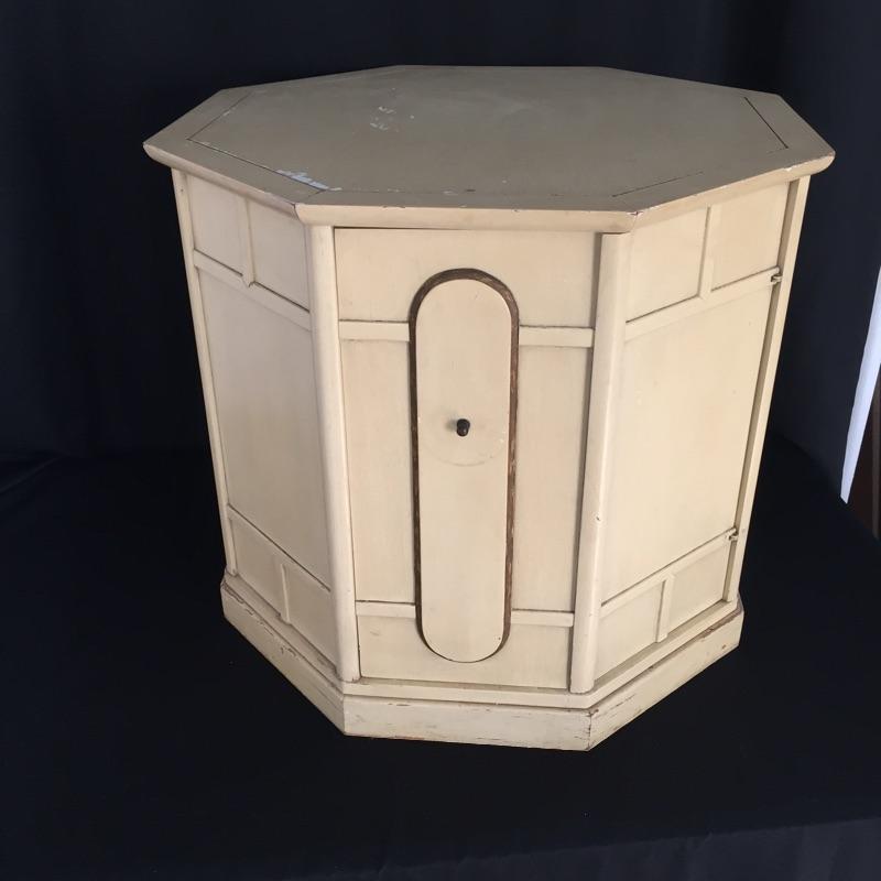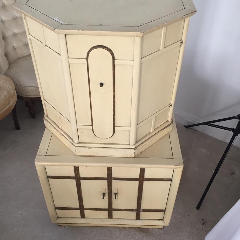 Pair of Eclectic end tables. One is an octagon shape and the other a rectangle. They are stacked on top of each other in the photo. Tables have some wear and tear but can be painted - See Pictures. Octagonal Table measures 24” x 24” x 21.5”. Rectangular table measures 24” x 26” x 21.5”.
