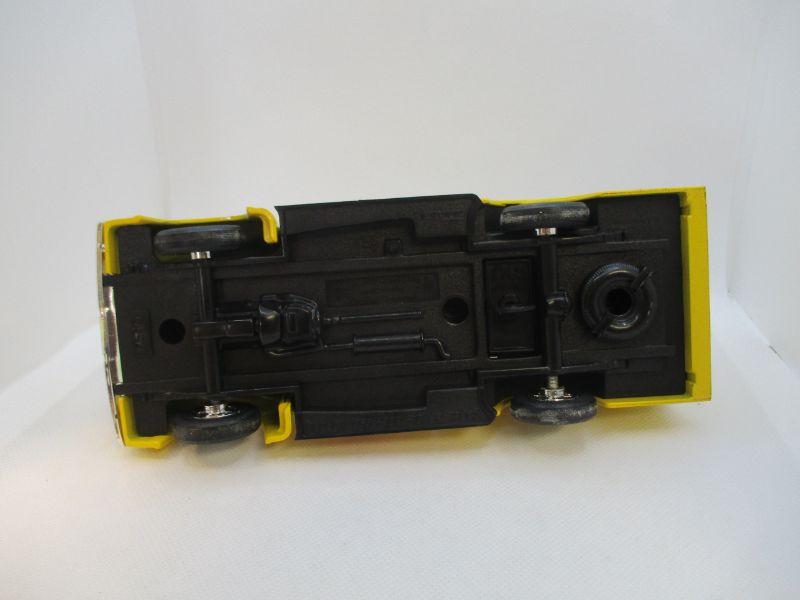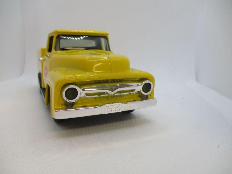 Super nice yellow truck replica of a 1956 Ford Pick Up. It is about 8" long with a metal body and a plastic underside. Very clean condition with just a couple of rub spots on the back driver side.