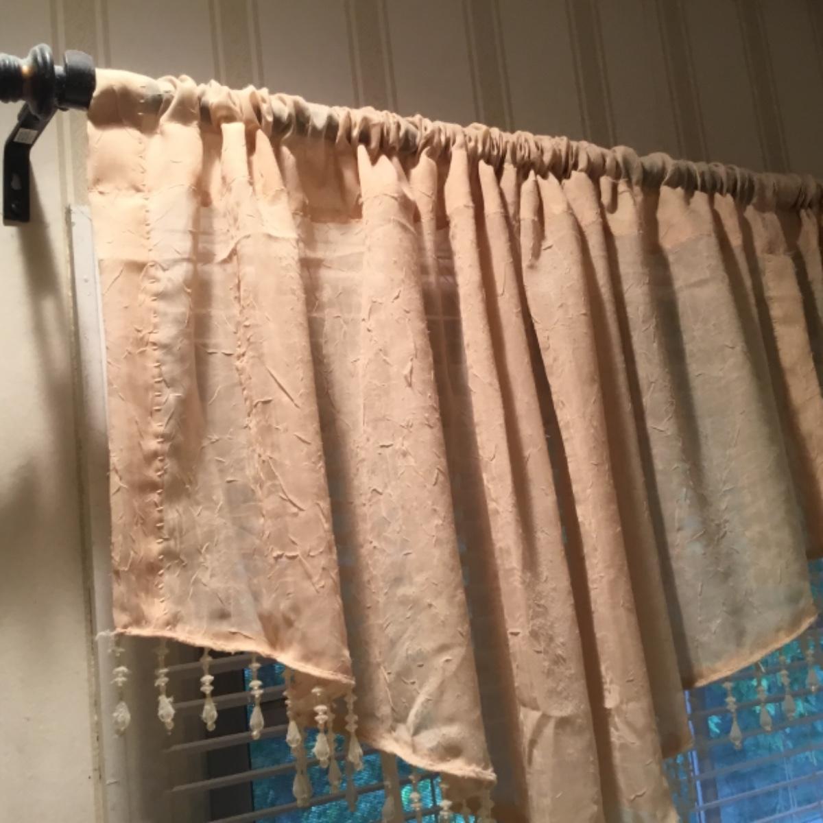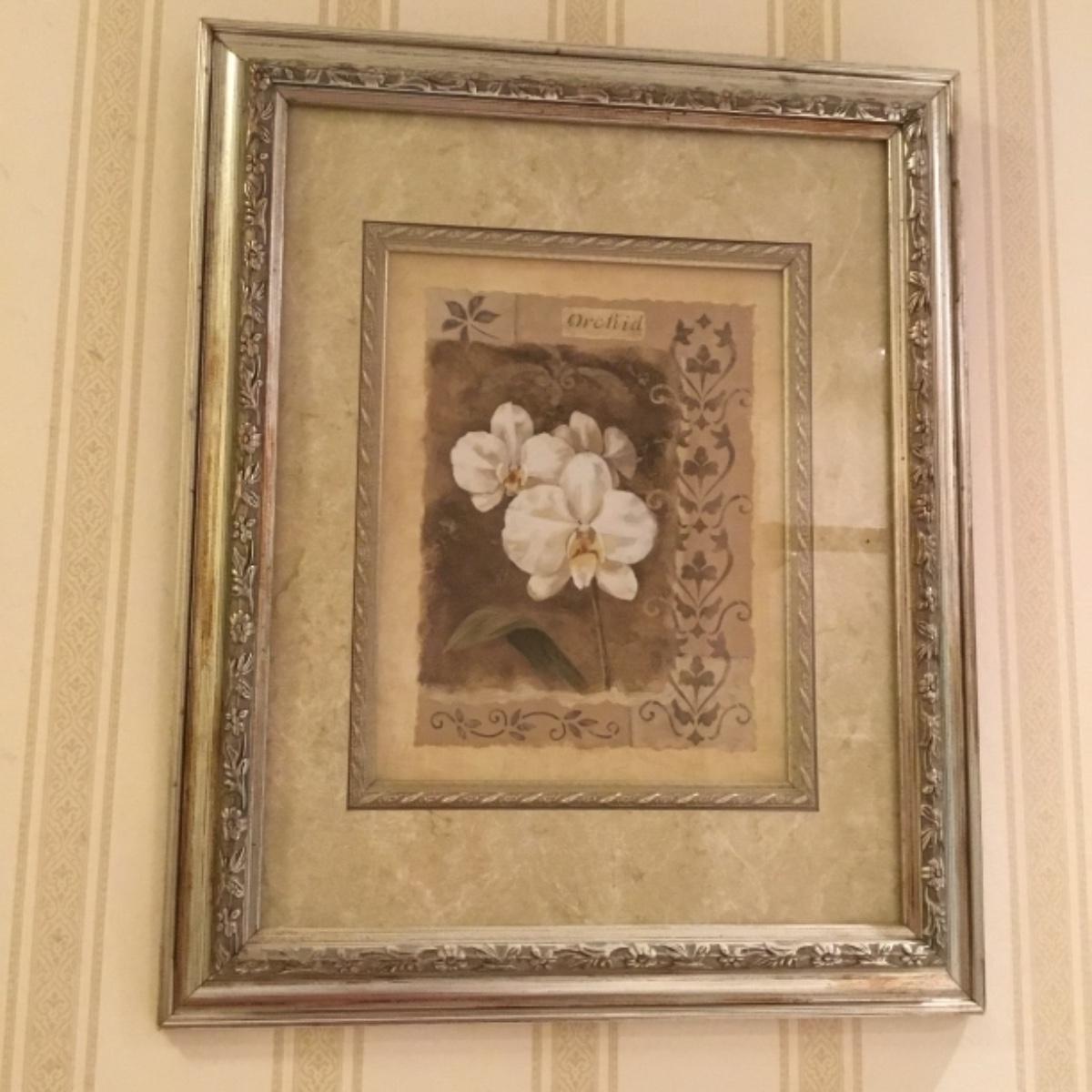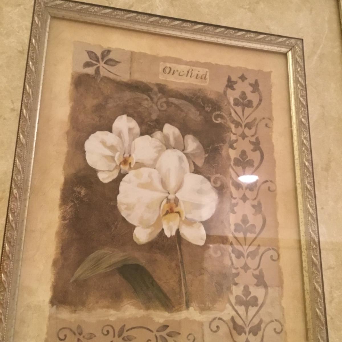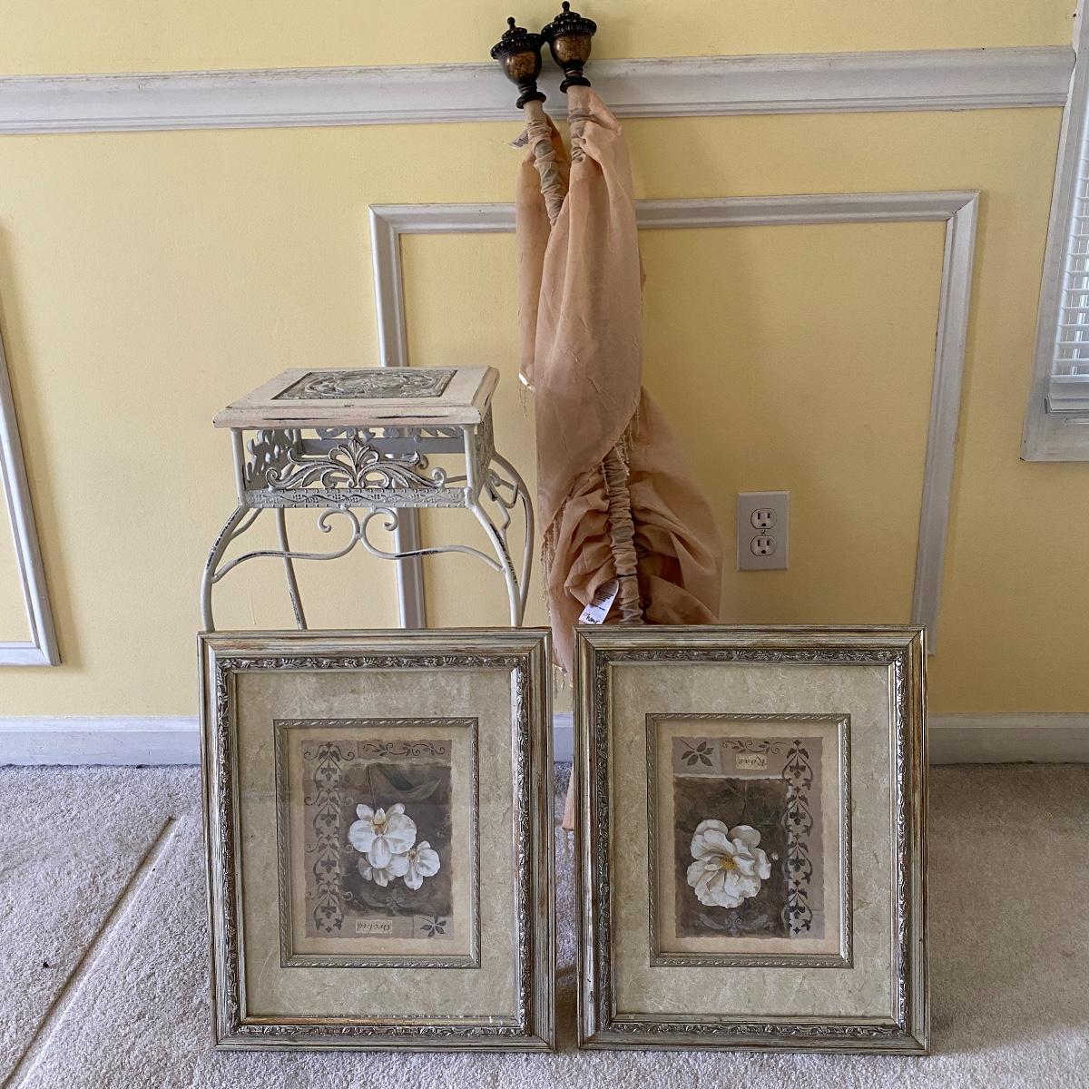 Lot includes great home decor items! Small metal table or plant stand measures 10”x10”x25”. It is white with rustic look, see photos. Two framed orchid prints included as well, both measuring 13.5”x16.5”. Lot also includes four panels of peach curtain