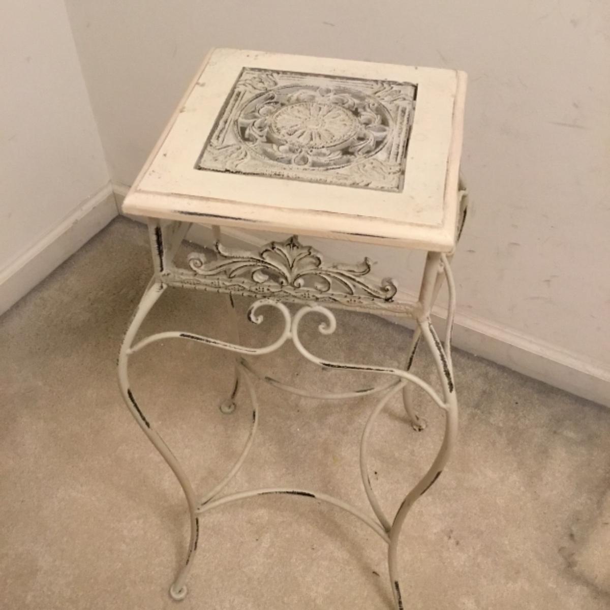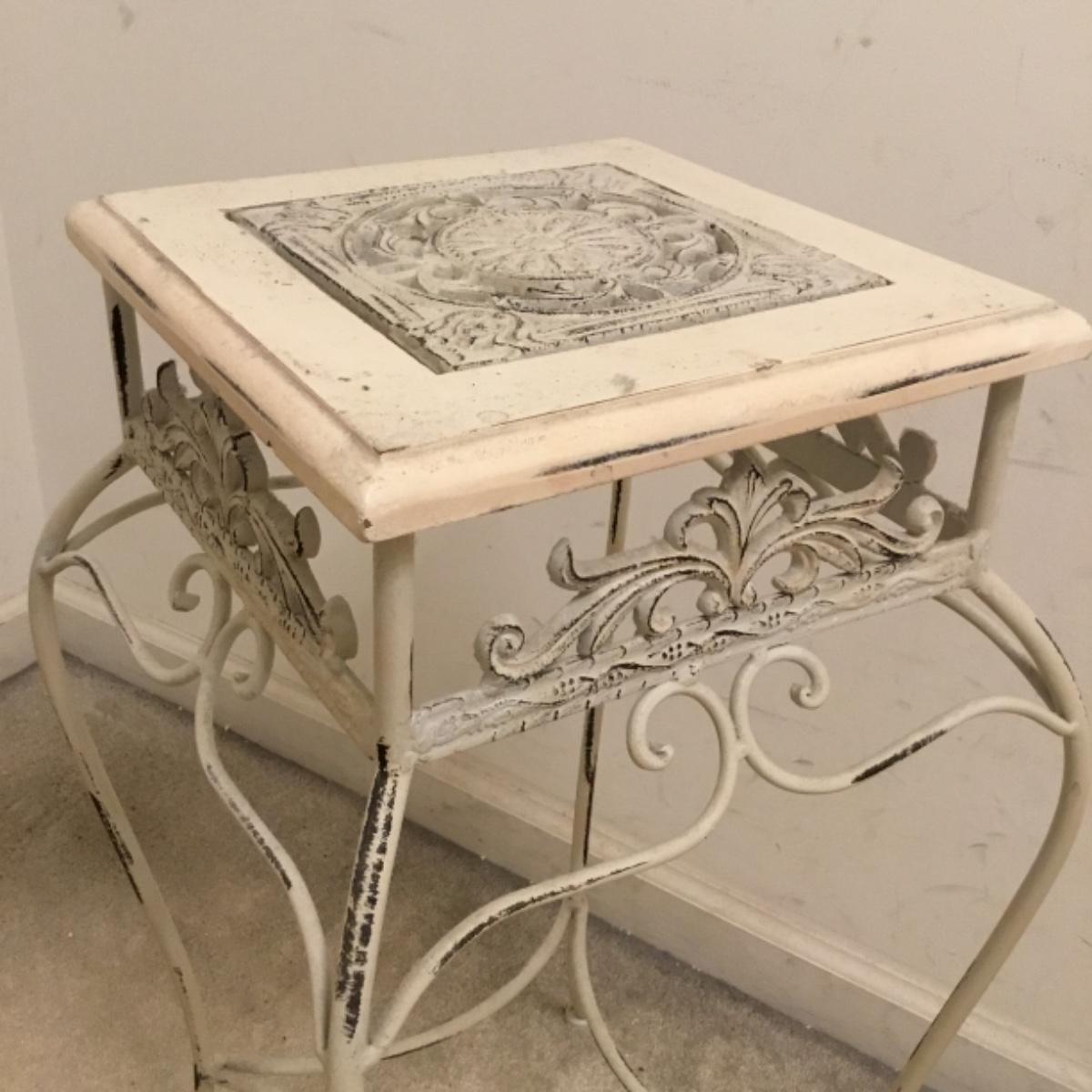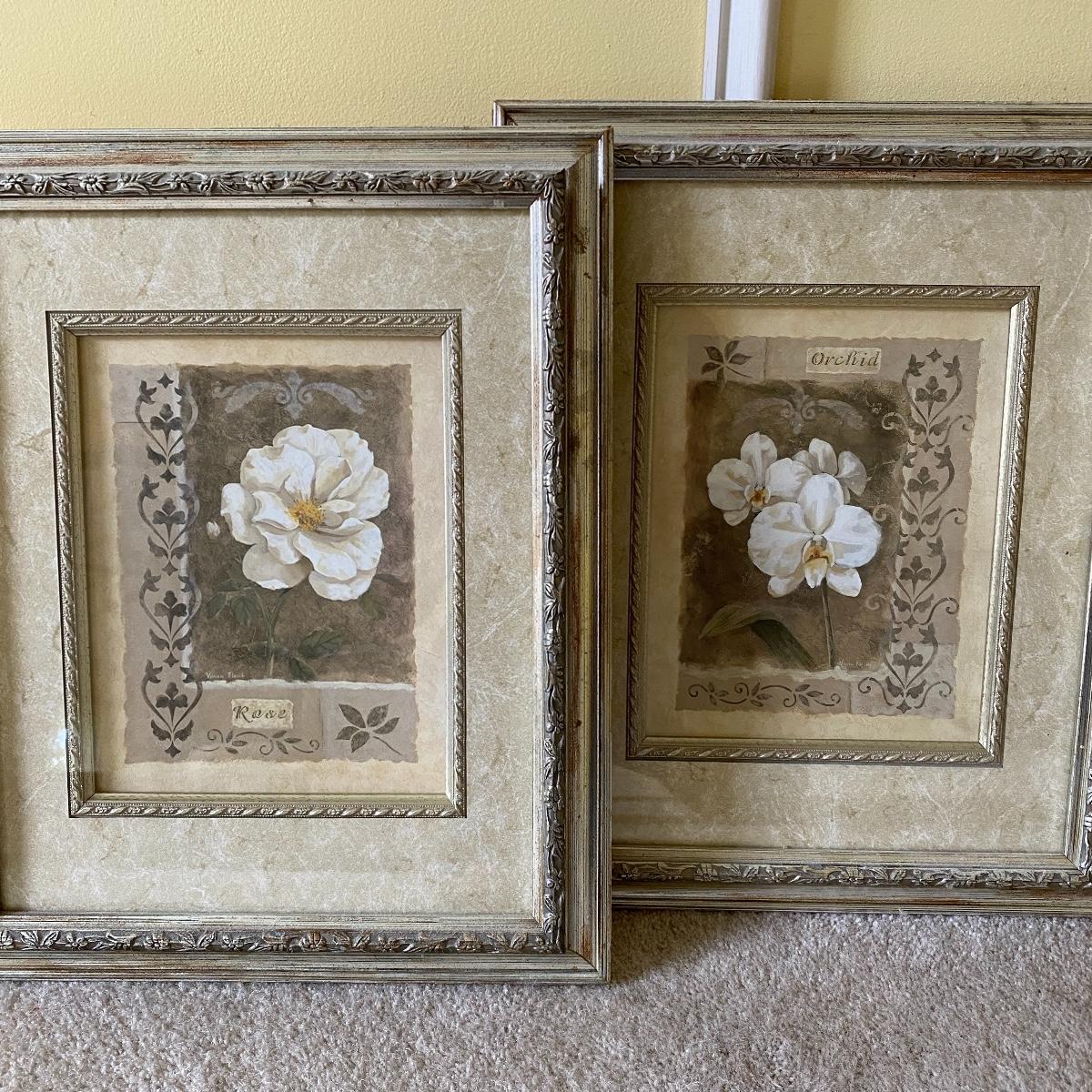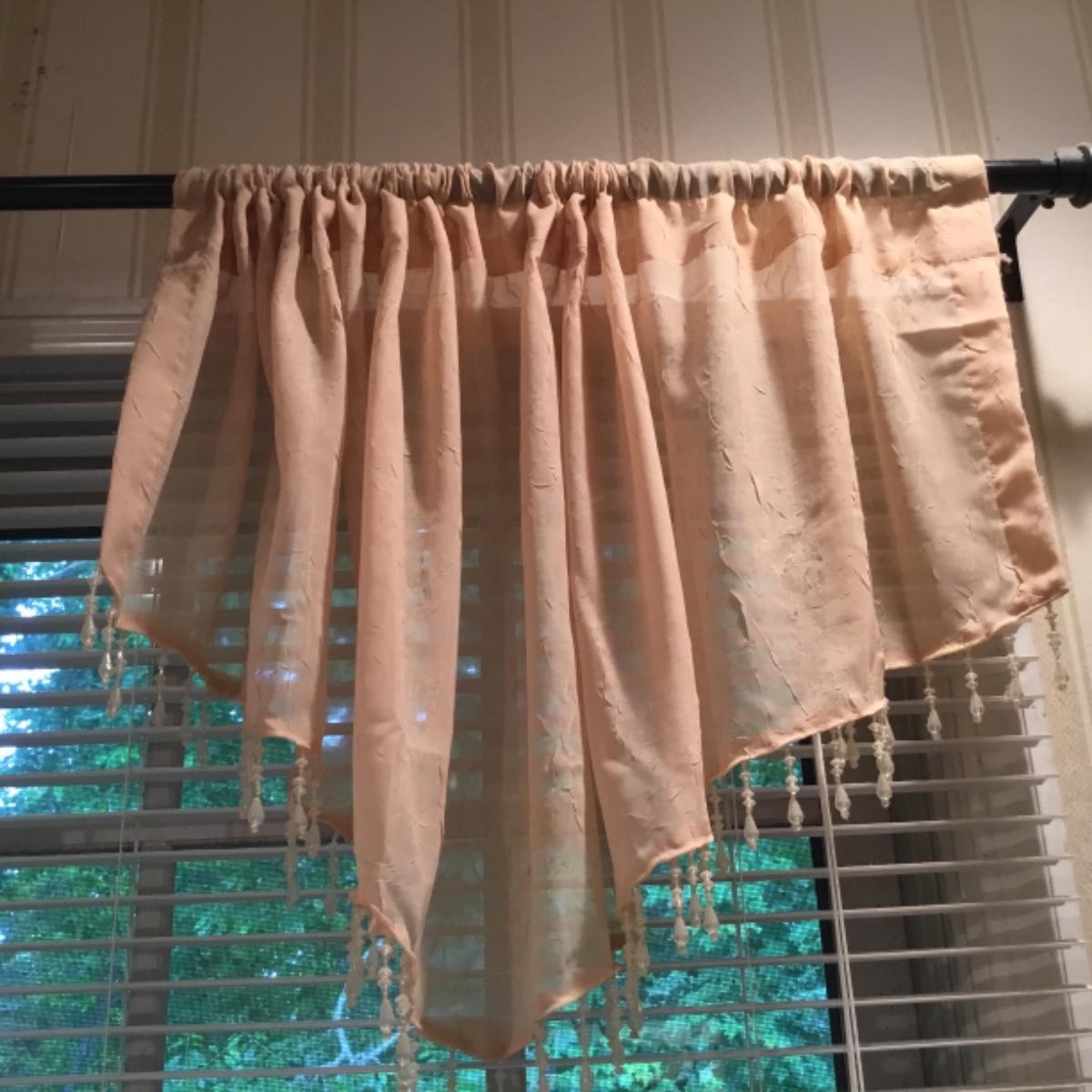 Lot includes great home decor items! Small metal table or plant stand measures 10”x10”x25”. It is white with rustic look, see photos. Two framed orchid prints included as well, both measuring 13.5”x16.5”. Lot also includes four panels of peach curtain