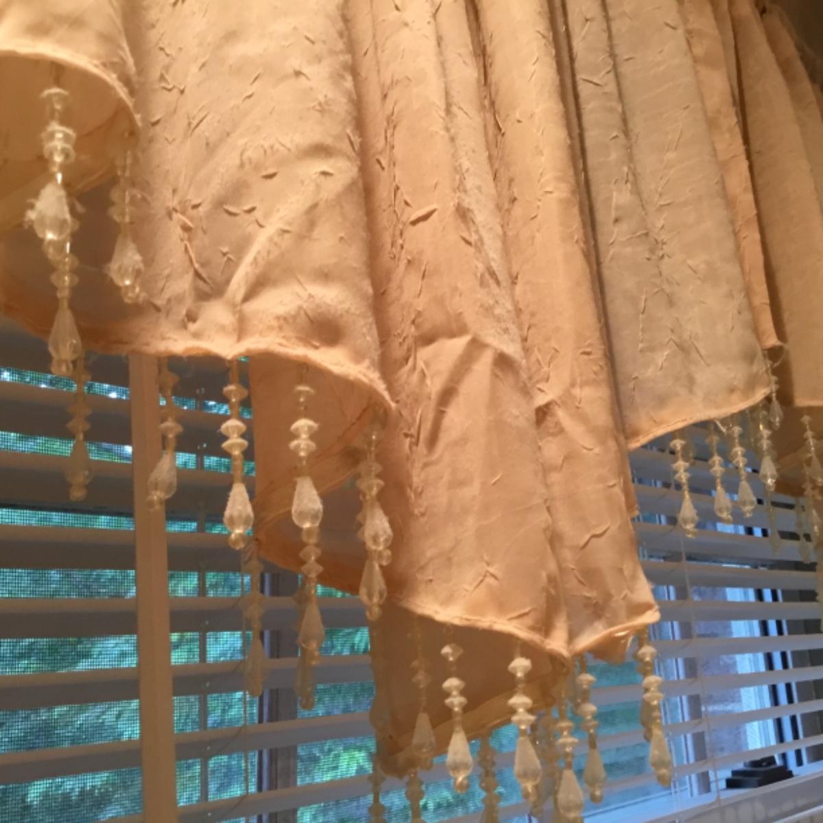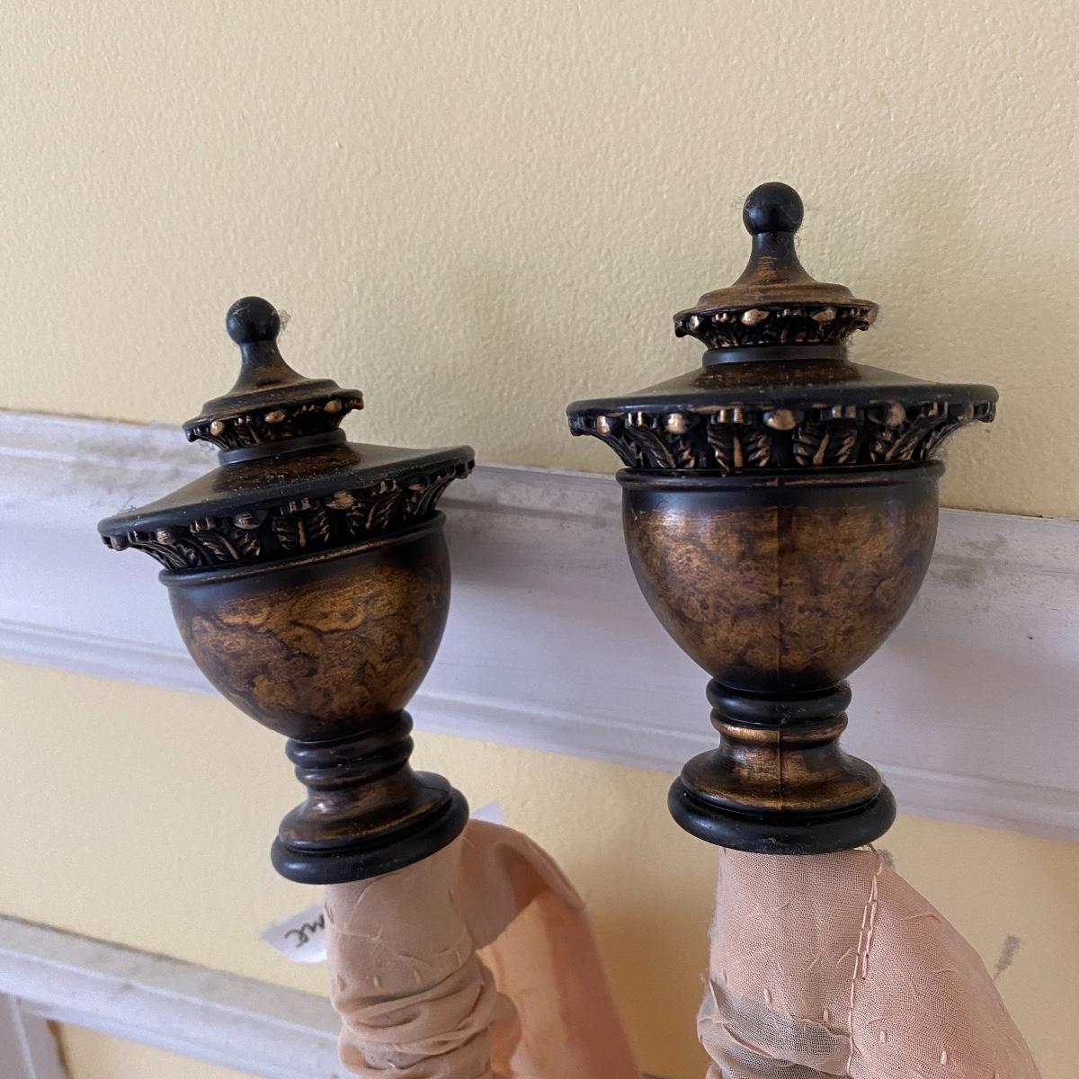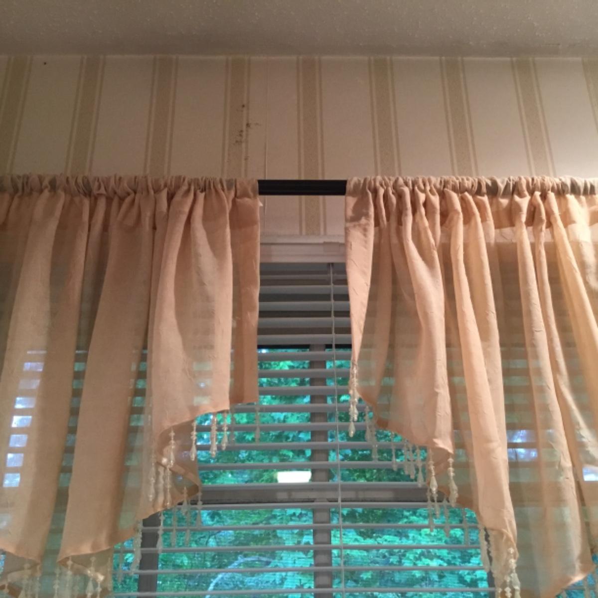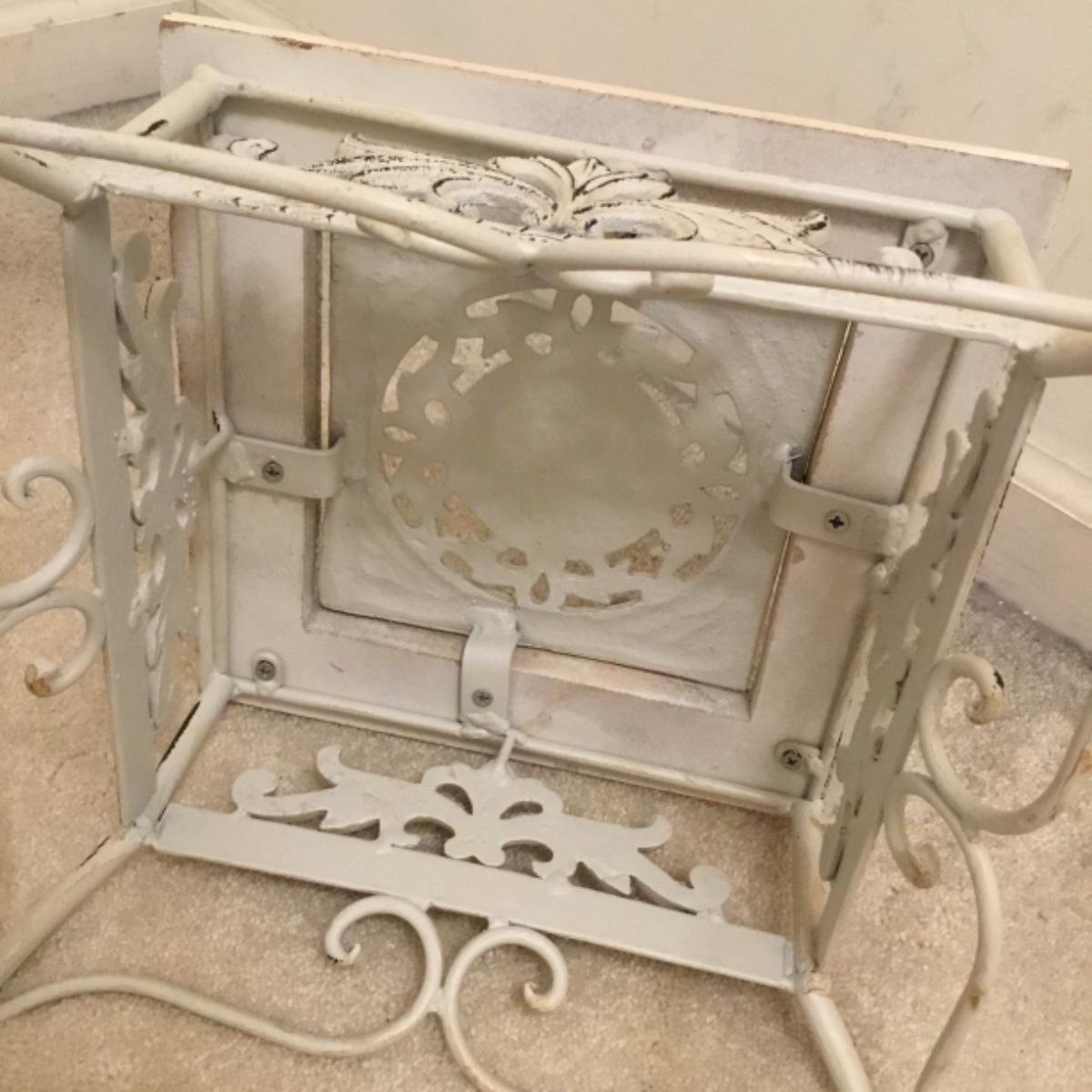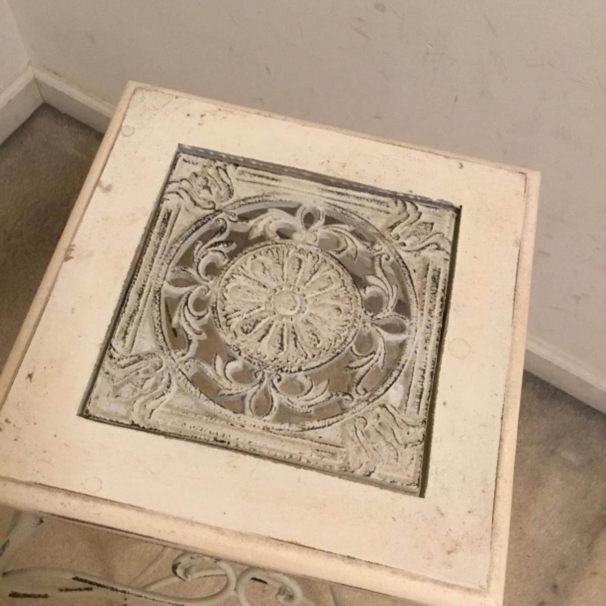 Lot includes great home decor items! Small metal table or plant stand measures 10”x10”x25”. It is white with rustic look, see photos. Two framed orchid prints included as well, both measuring 13.5”x16.5”. Lot also includes four panels of peach curtain