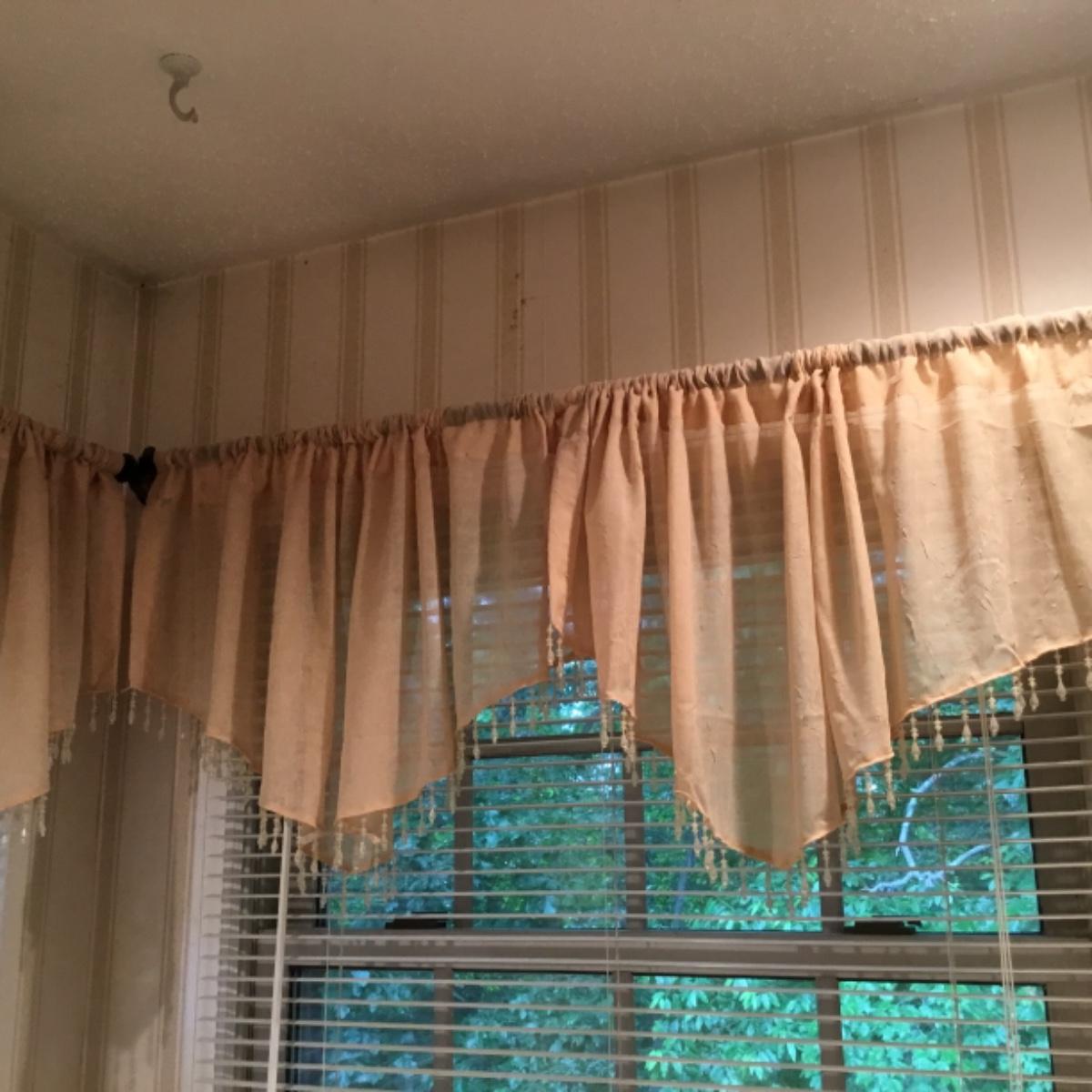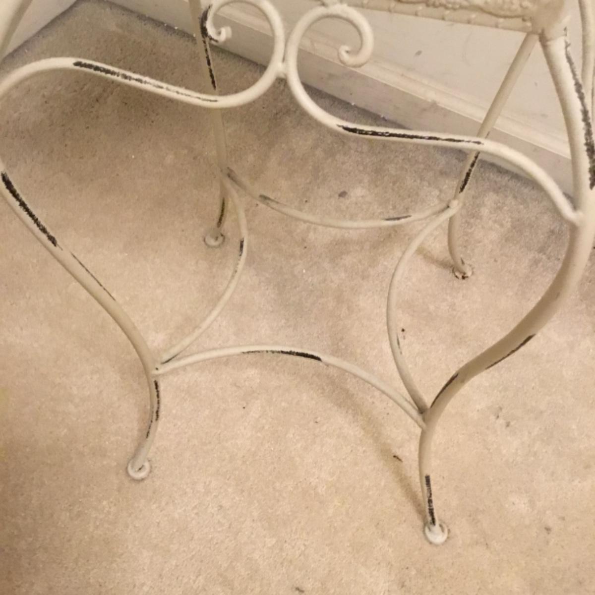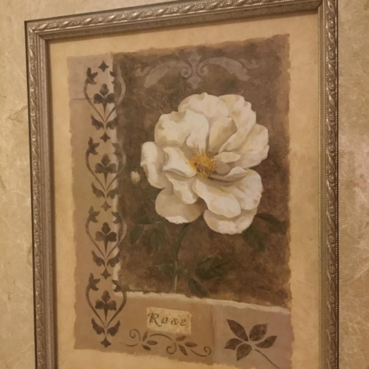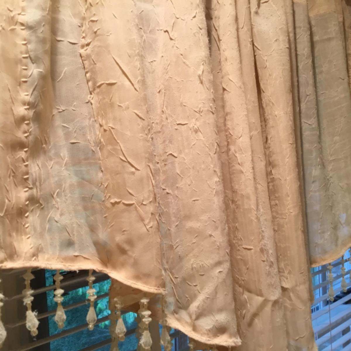 Lot includes great home decor items! Small metal table or plant stand measures 10”x10”x25”. It is white with rustic look, see photos. Two framed orchid prints included as well, both measuring 13.5”x16.5”. Lot also includes four panels of peach curtain