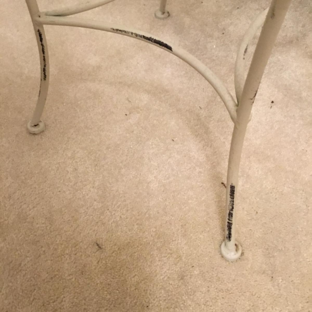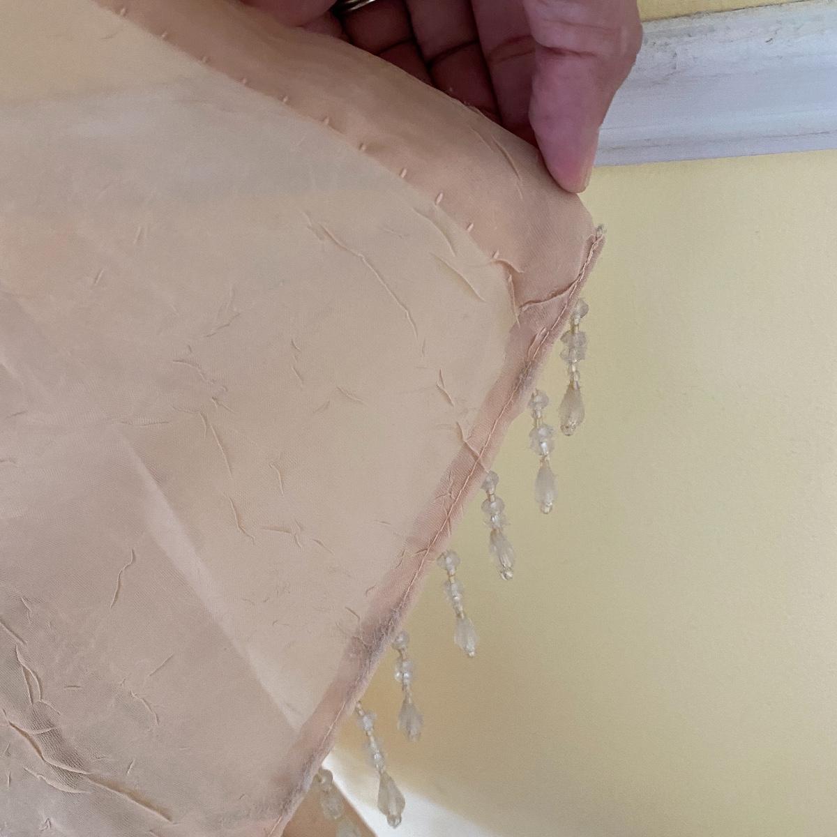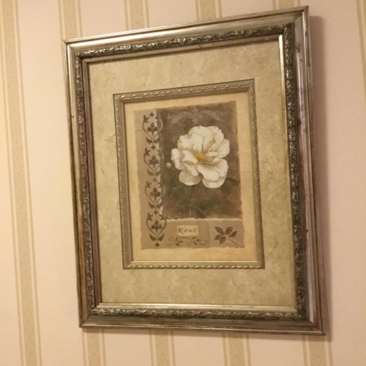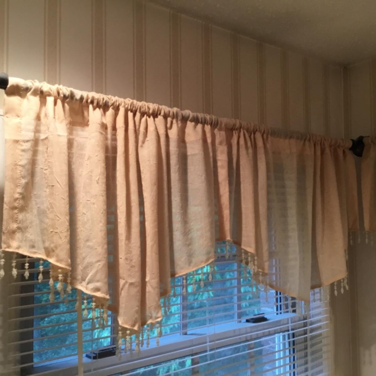 Lot includes great home decor items! Small metal table or plant stand measures 10”x10”x25”. It is white with rustic look, see photos. Two framed orchid prints included as well, both measuring 13.5”x16.5”. Lot also includes four panels of peach curtain