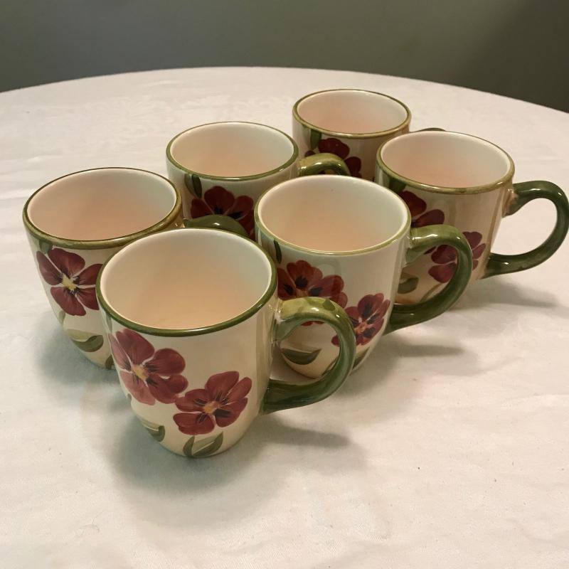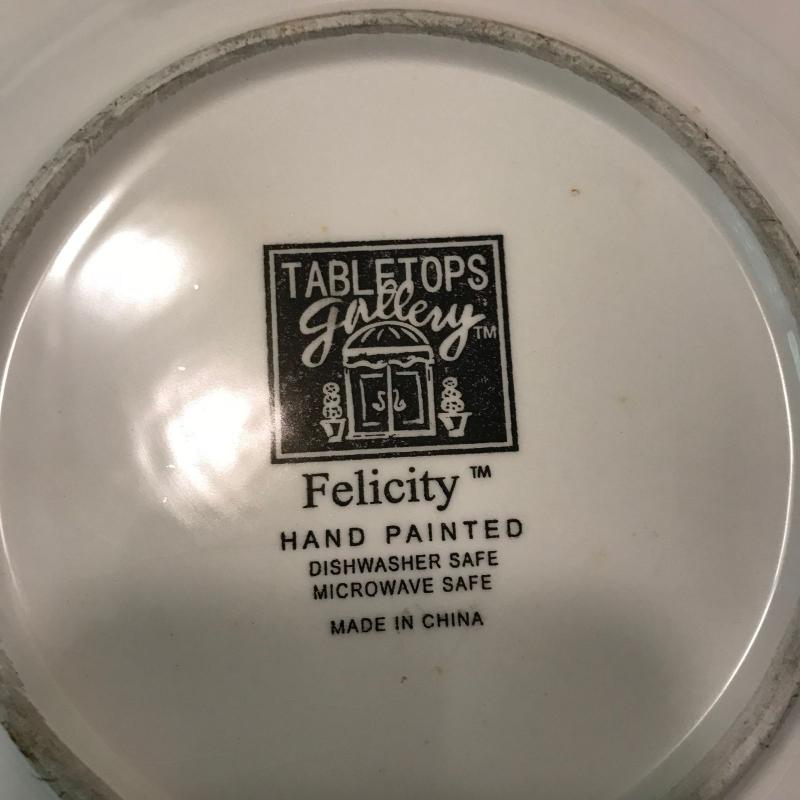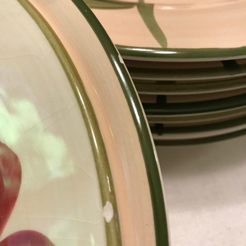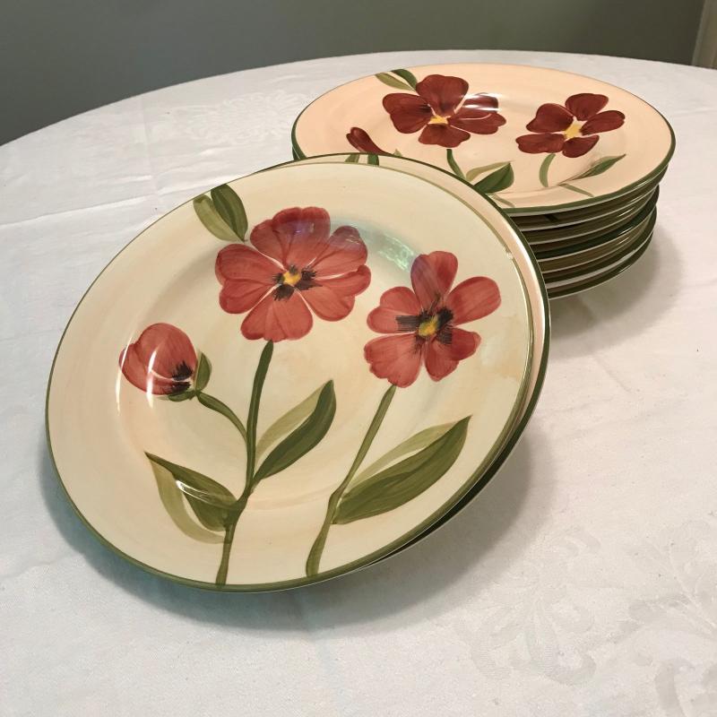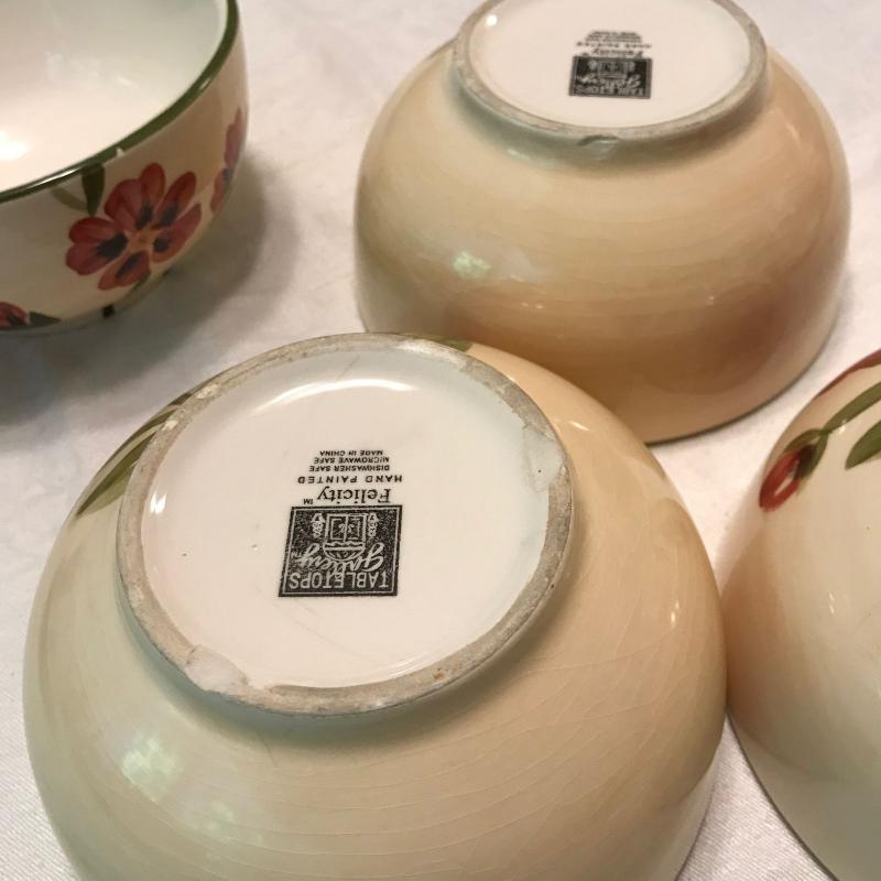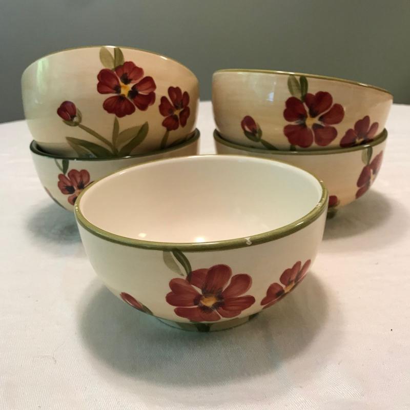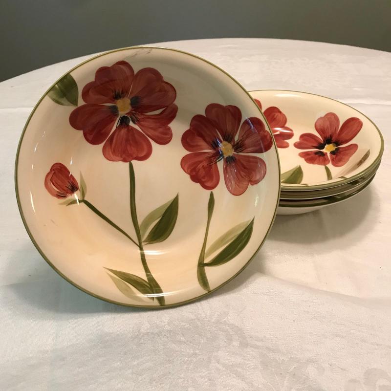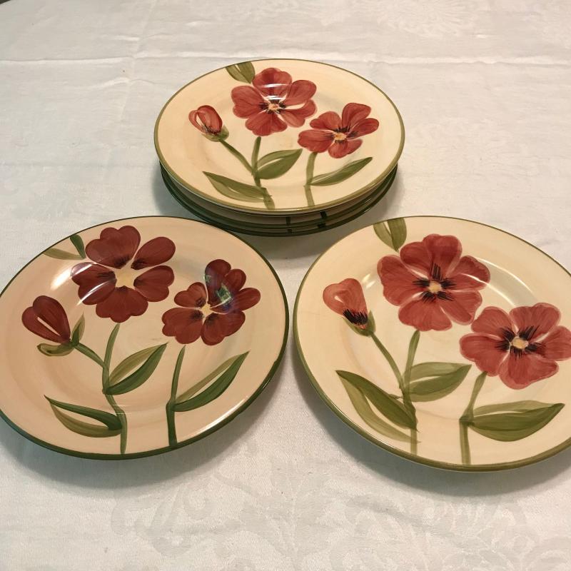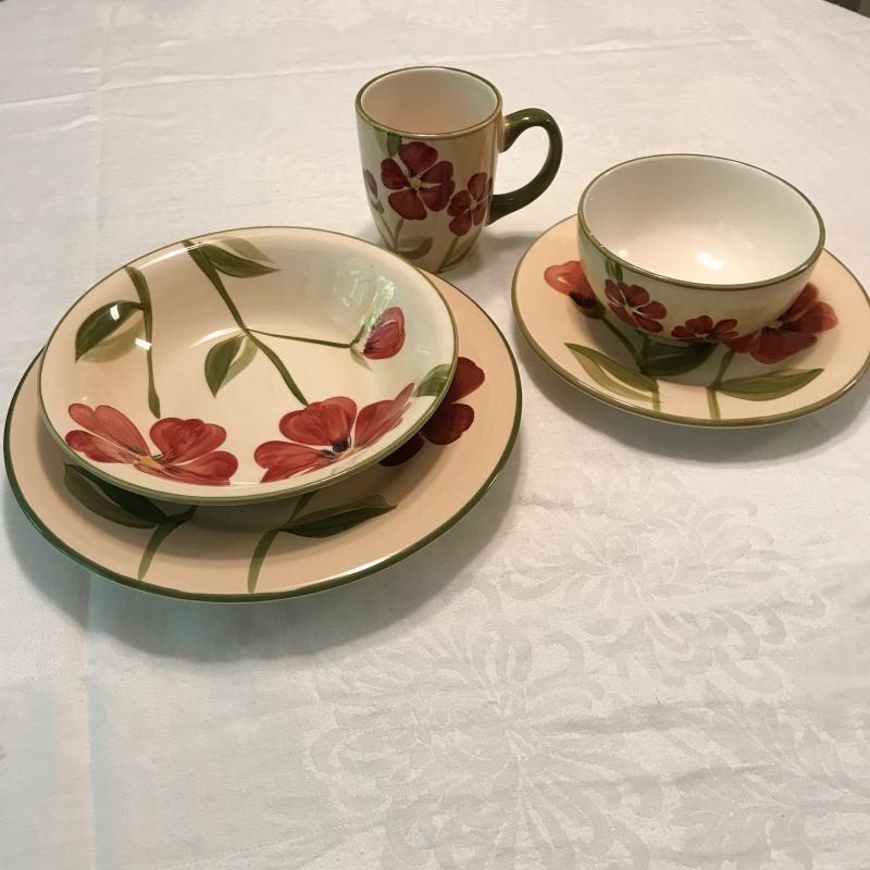 Plates, bowls and mugs in this nice beige and red floral dish set. Felicity design. Hand painted. Some small chips. No shipping.