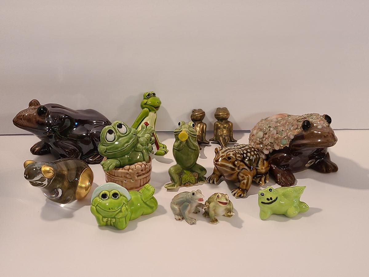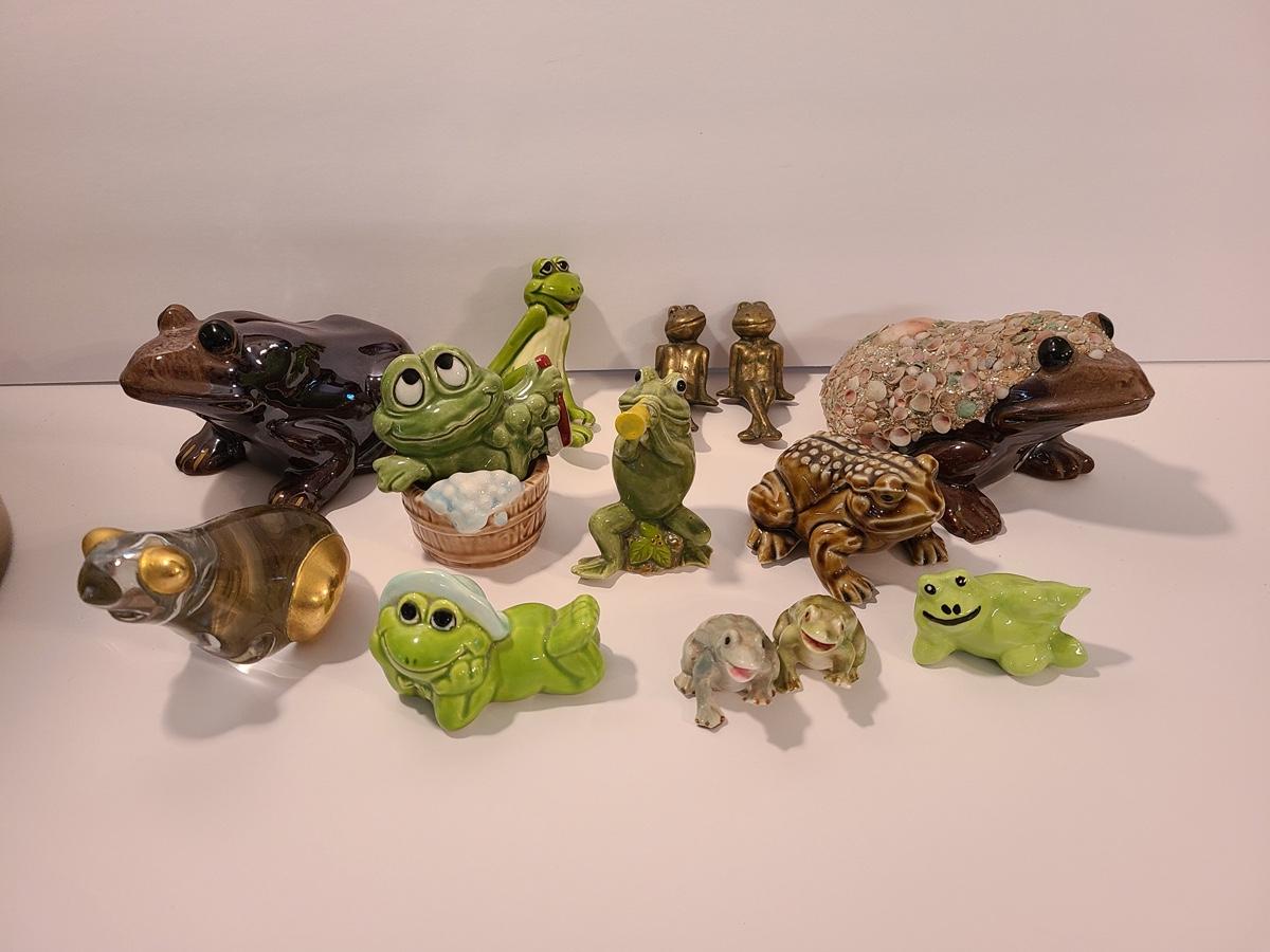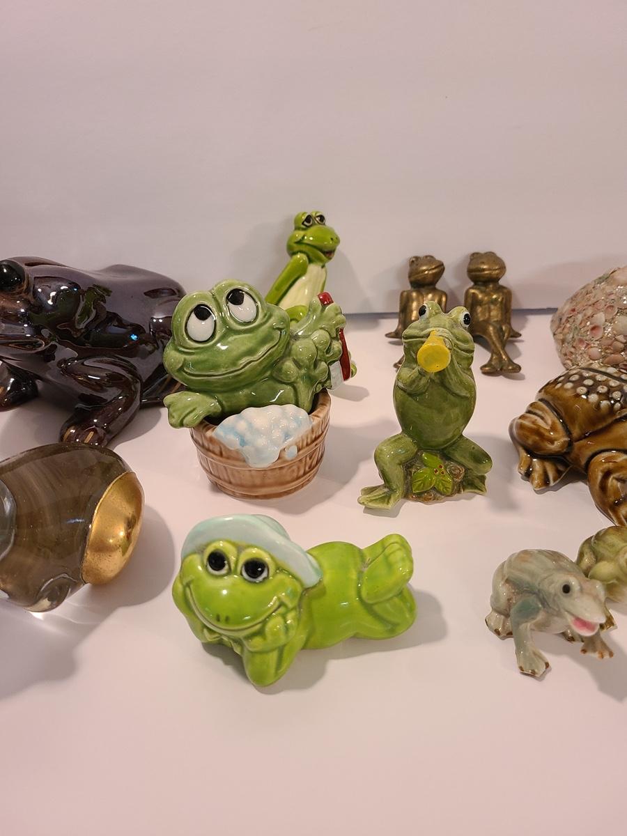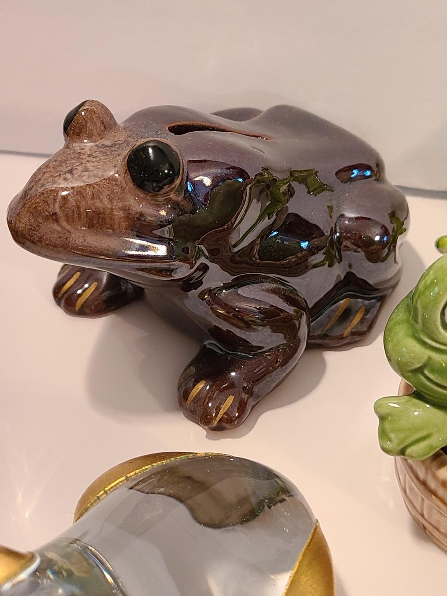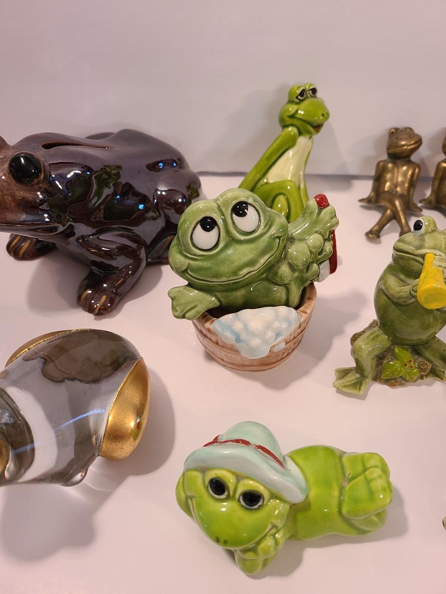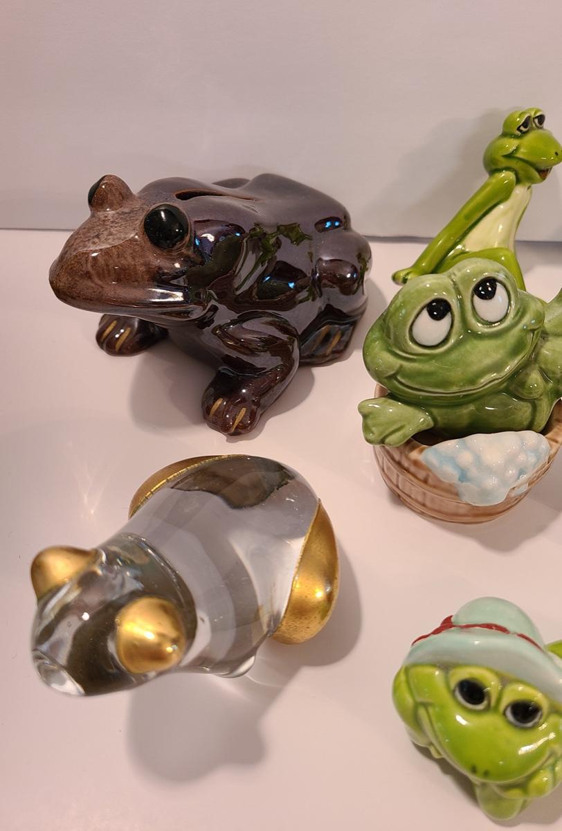 Lot 5: Frog Collectibles: Glass Paperweight, Salt & Peppers and More