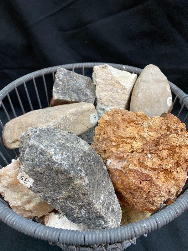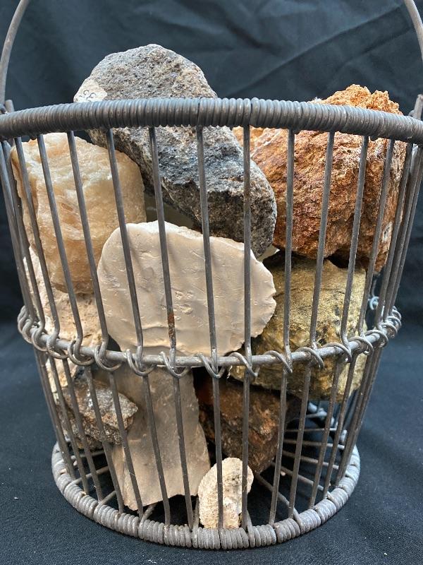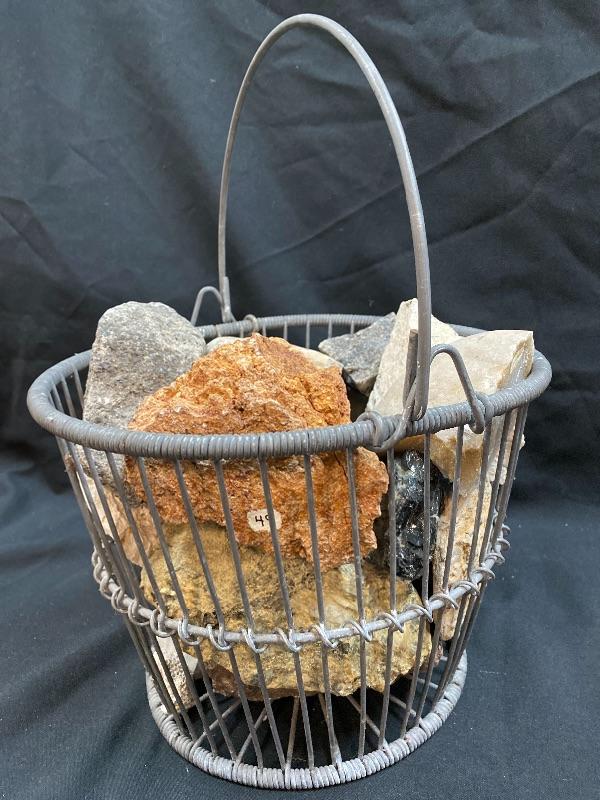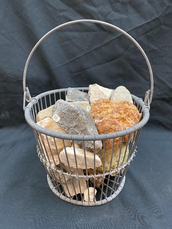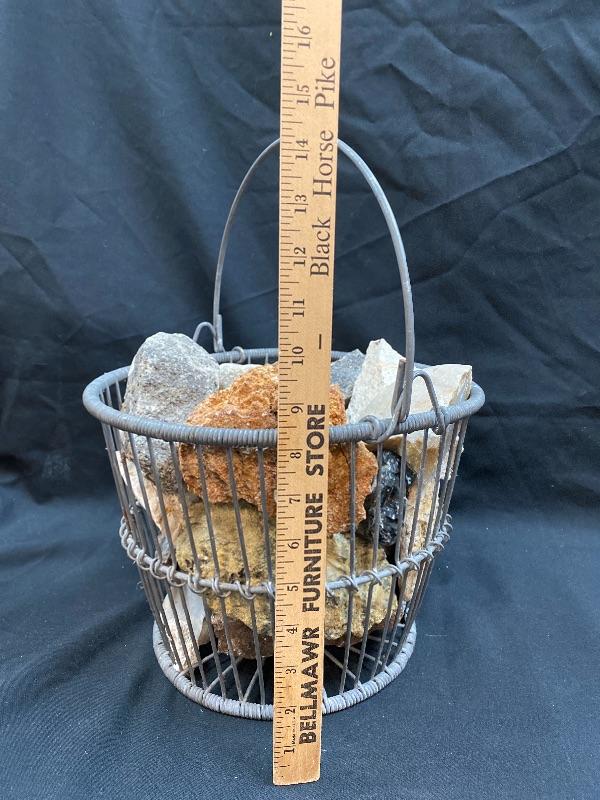 Lot #5; Galvanized Heavy Metal Basket with Fossilized Rocks.