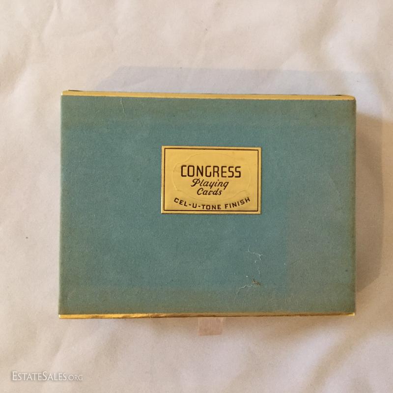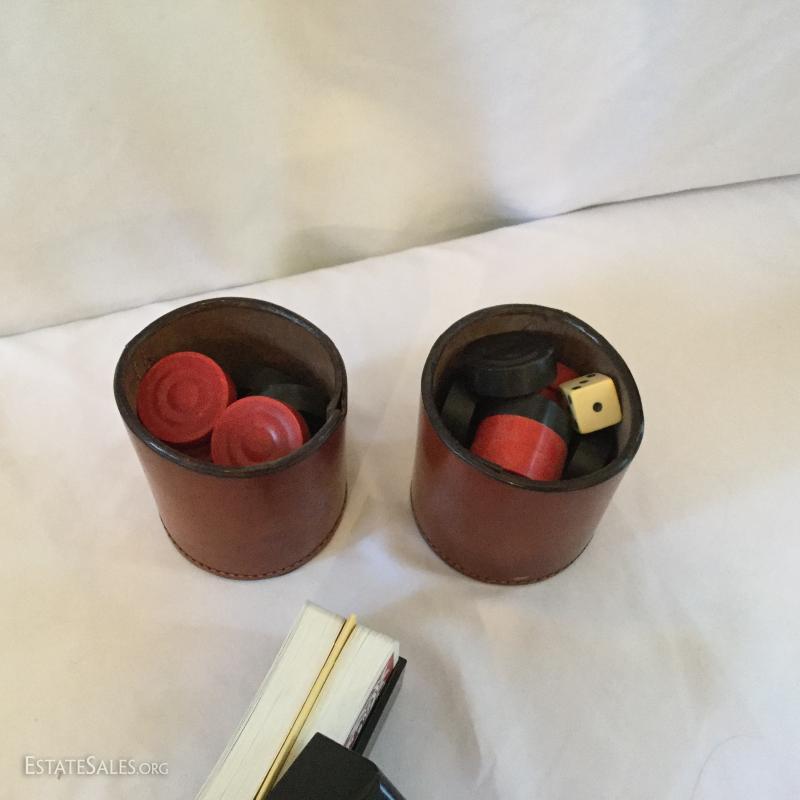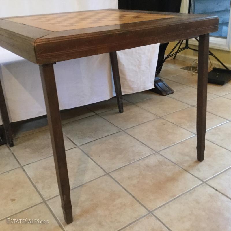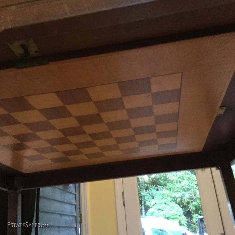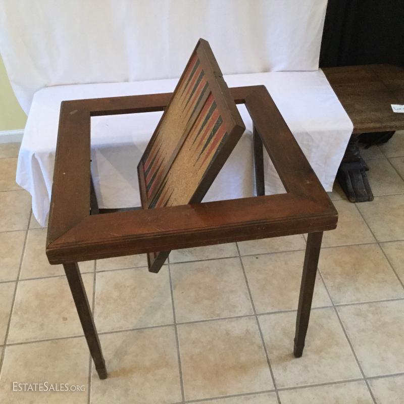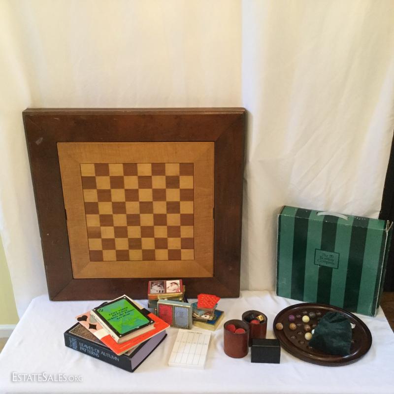 Standard sized card table with chess/checker board on one side and backgammon on the flip side. Legs fold for easy storage. Game Pieces and die for table included. 30.5"l x 30.5"w x 27.5"h Lot also includes sets of Congress and Crown playing cards in cases, puzzles, bridge score pad and wood marble game from Bombay Co. We have not counted all cards to decks or pieces to puzzles. This lot is available for local pick up in Flat Rock, NC only.