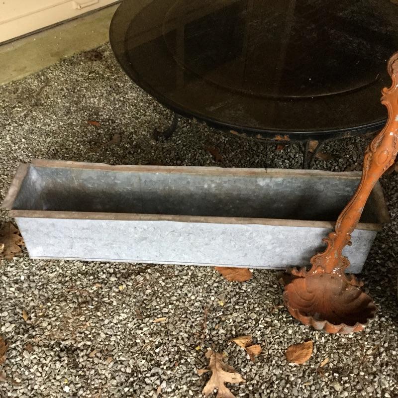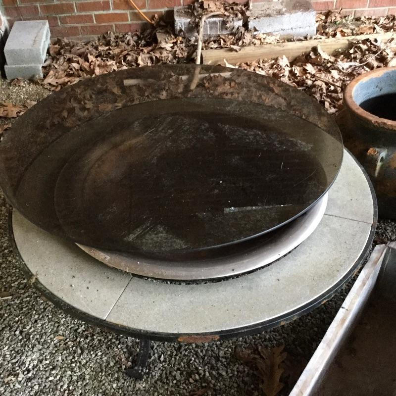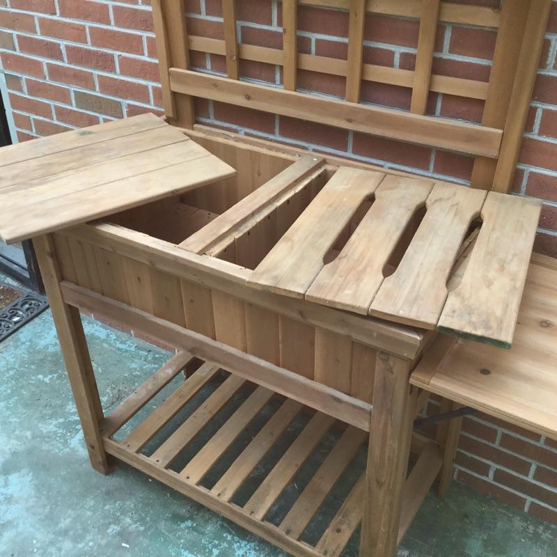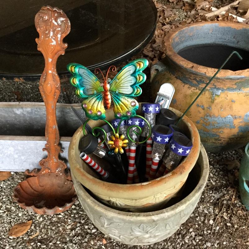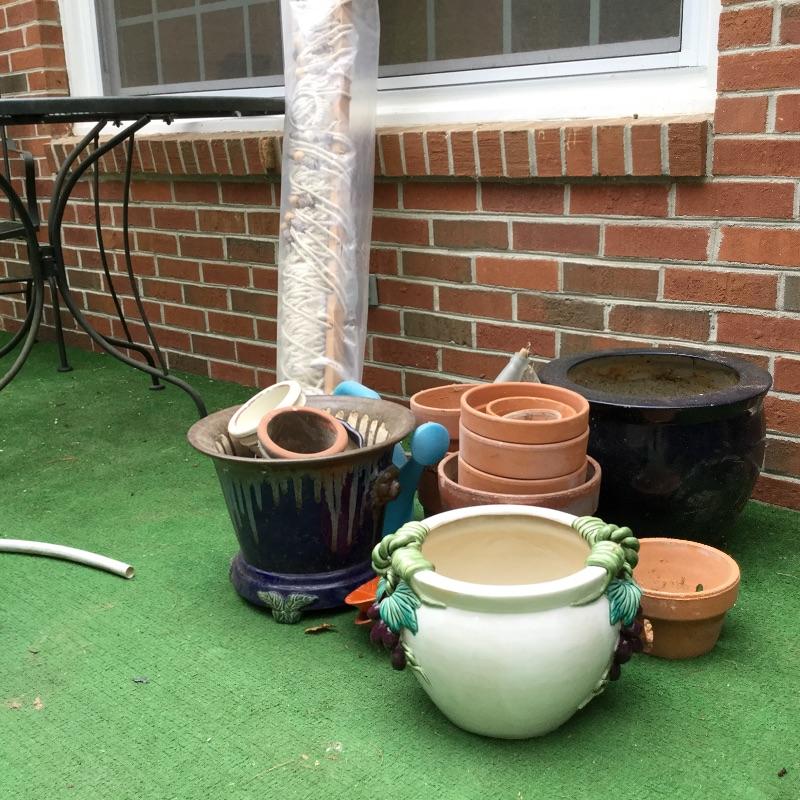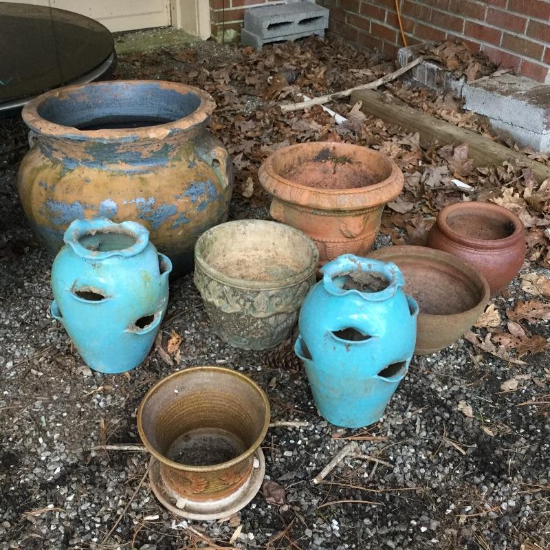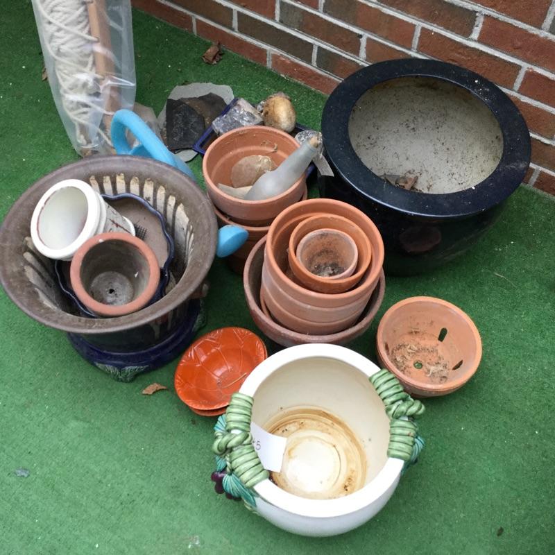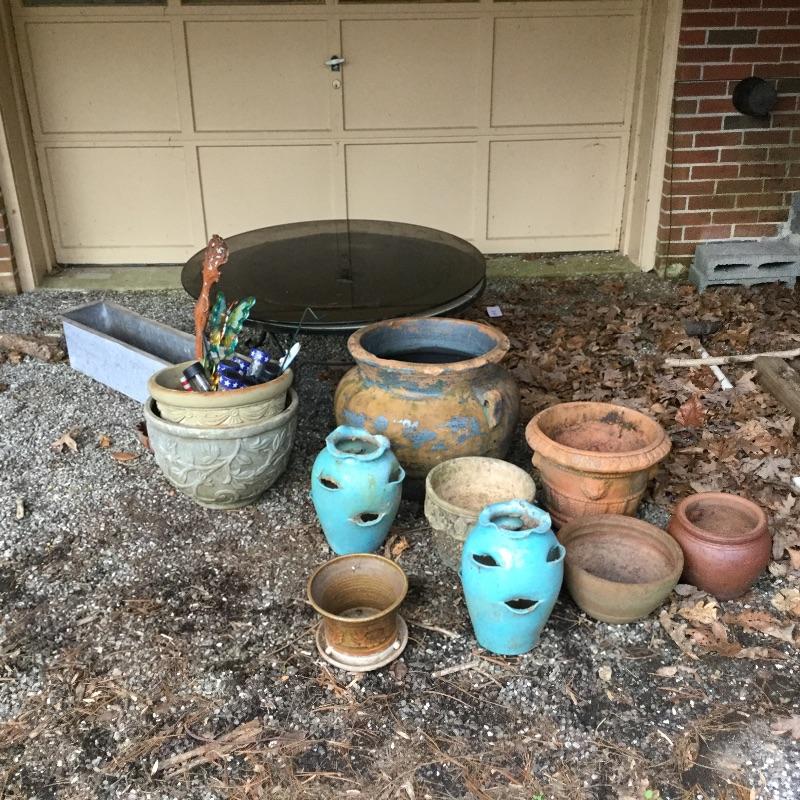 Lot includes wood Potting table that measures 38.5” x21.5” x65” and has a fold down leaf that adds 12”. Wrought iron table and two chairs with table measuring 48” d and 28” tall, hammock is in like new condition, Coleman fire pit (42” diameter) with glass top, solar lights for the yard and colorful decor and there is an array of ceramic, pottery, terra-cotta planters in this lot.