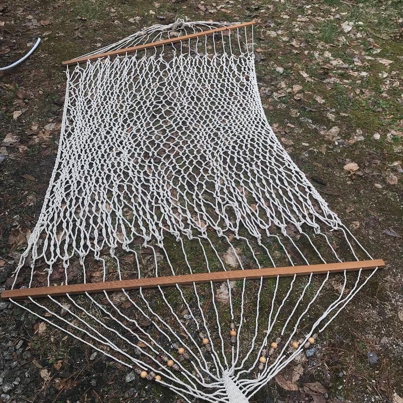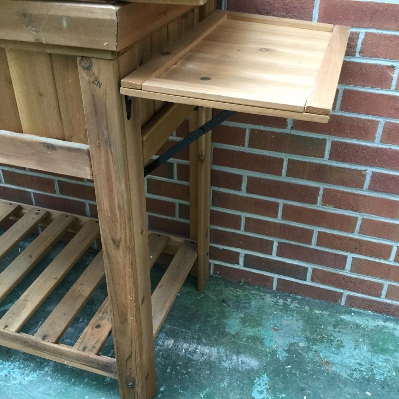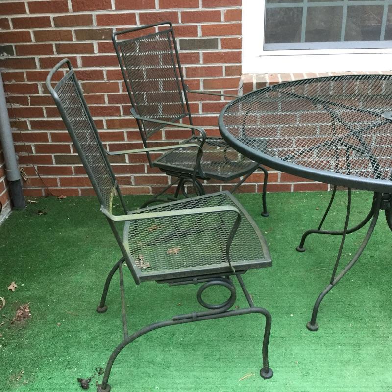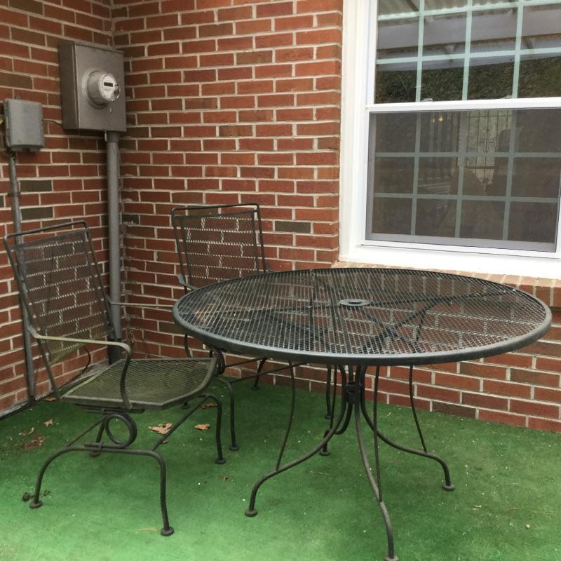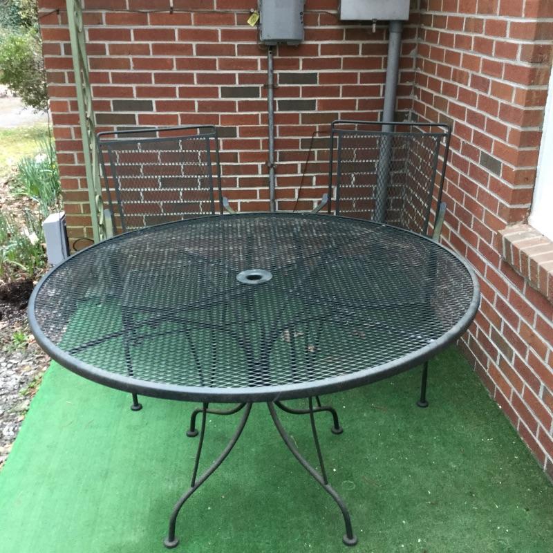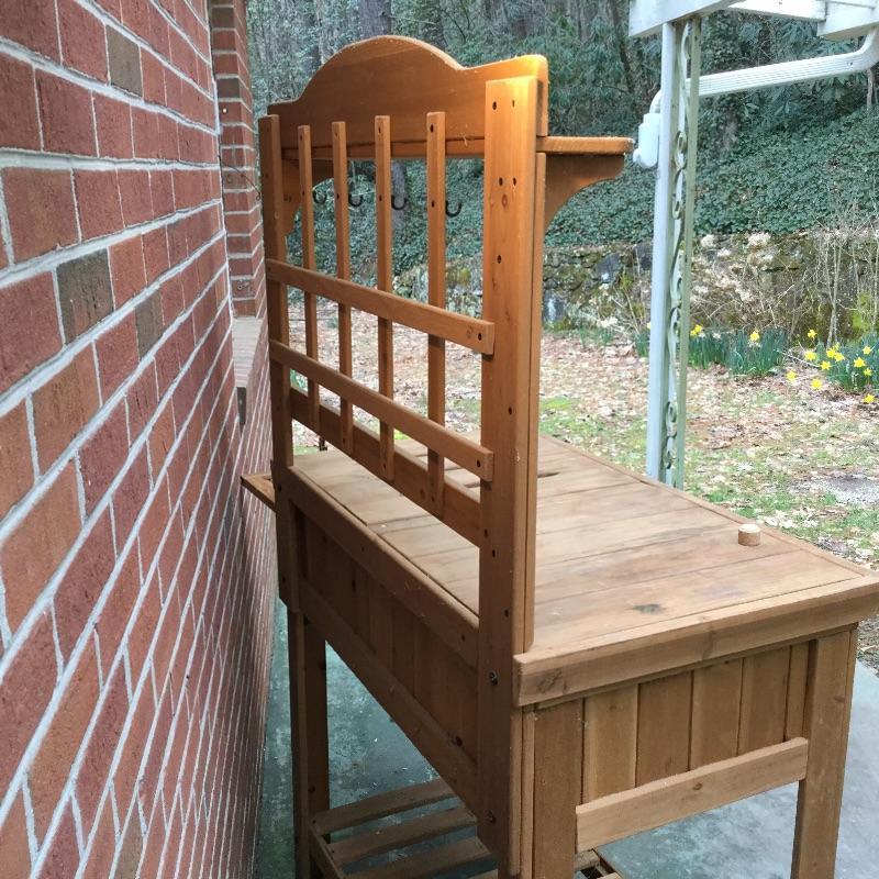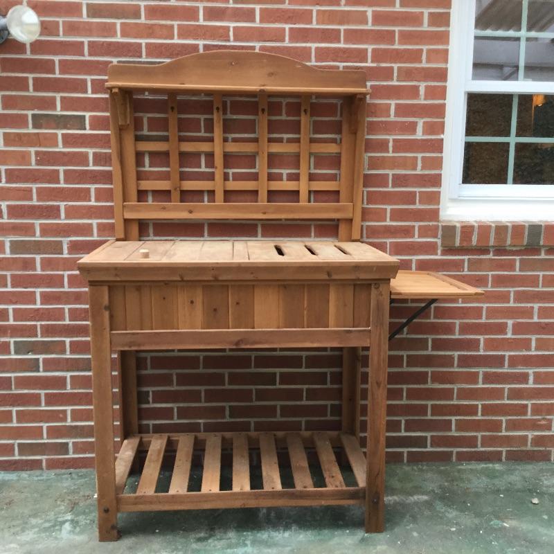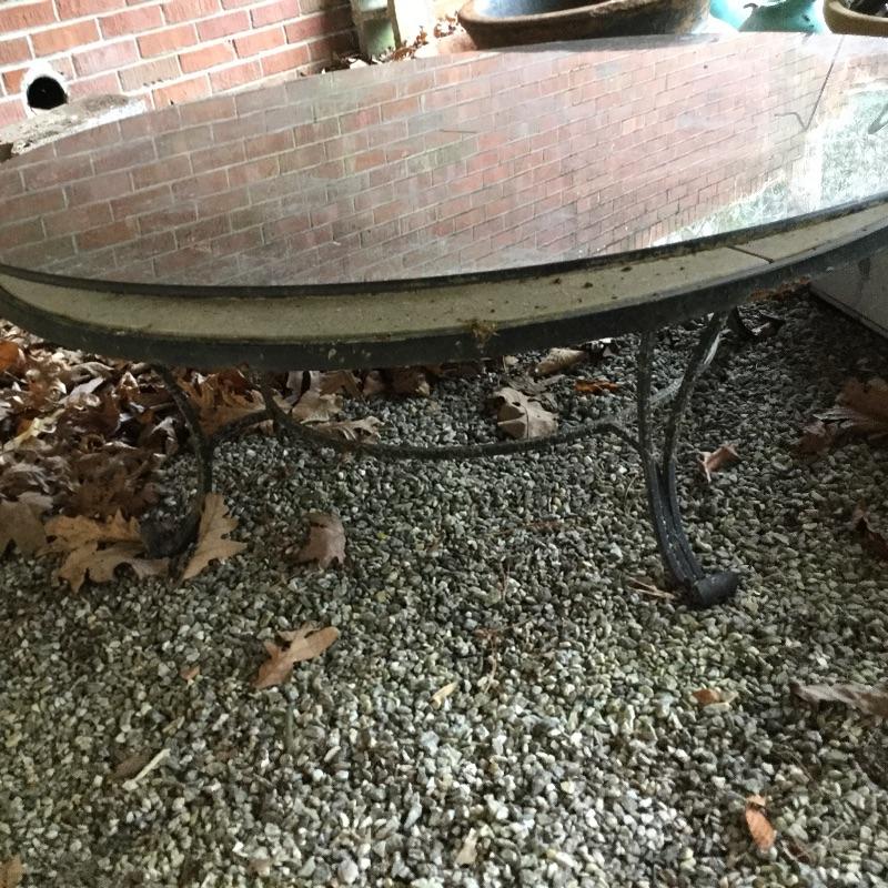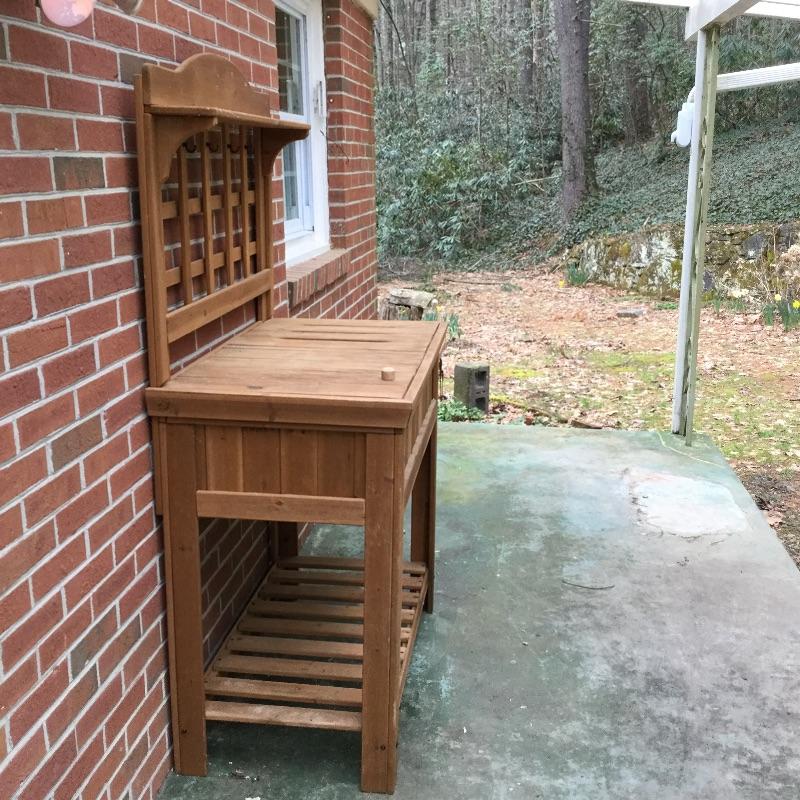 Lot includes wood Potting table that measures 38.5” x21.5” x65” and has a fold down leaf that adds 12”. Wrought iron table and two chairs with table measuring 48” d and 28” tall, hammock is in like new condition, Coleman fire pit (42” diameter) with glass top, solar lights for the yard and colorful decor and there is an array of ceramic, pottery, terra-cotta planters in this lot.