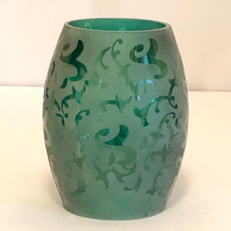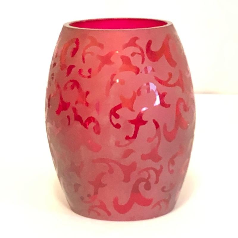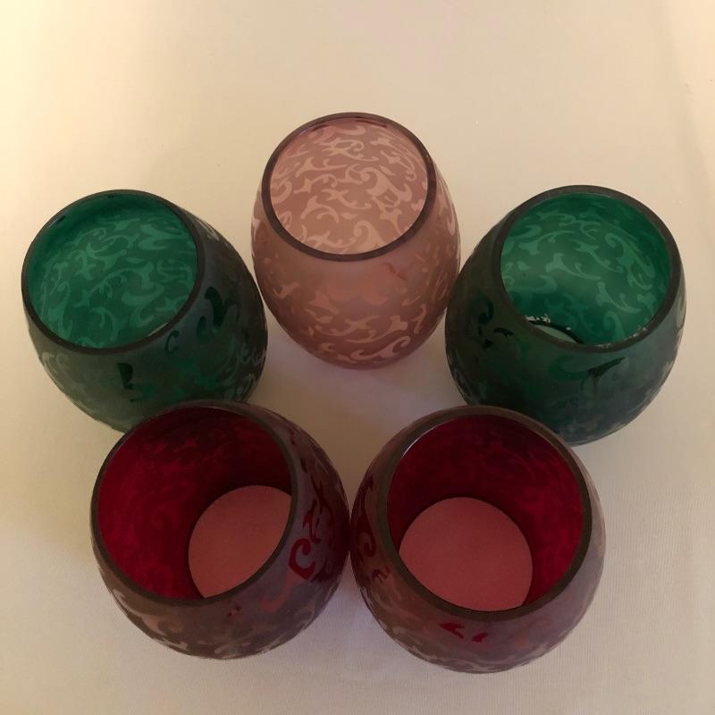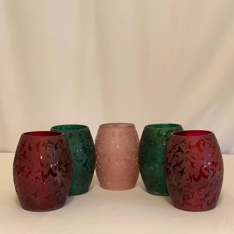 These five decorative glass hurricanes are great as a set and each makes a statement on its own. Complimentary colors in reds, pinks and greens.