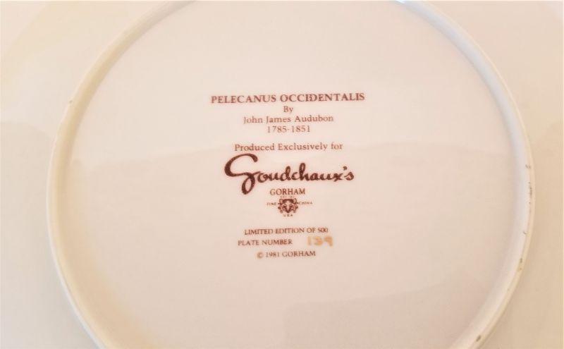 Lot #5 Gorham Collectible Porcelain Plate - limited edition - Goudchaux's 1981 Peliccanus Occidentalis