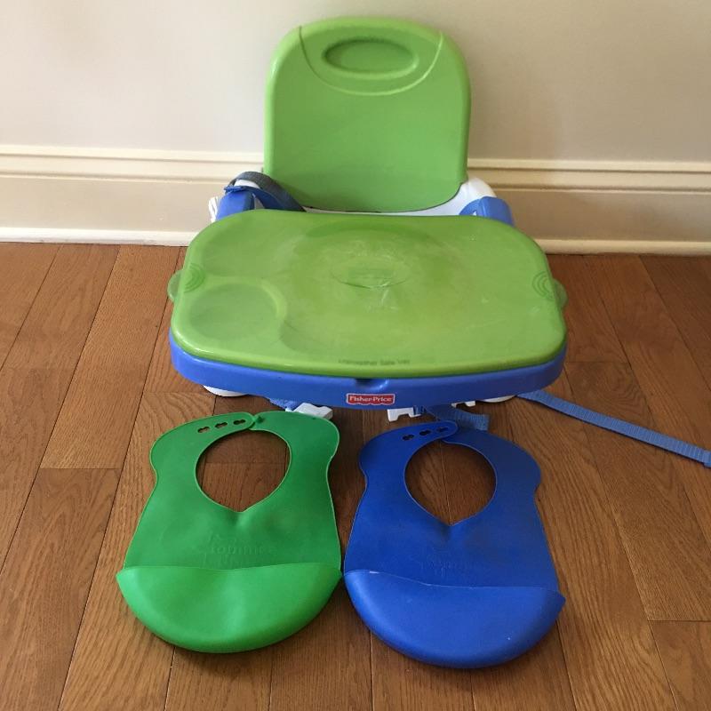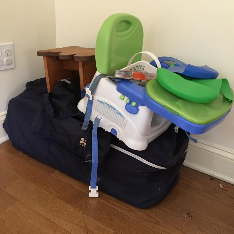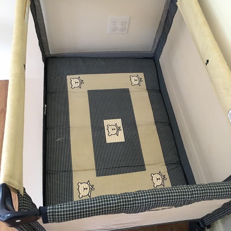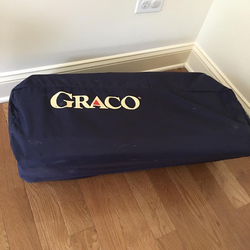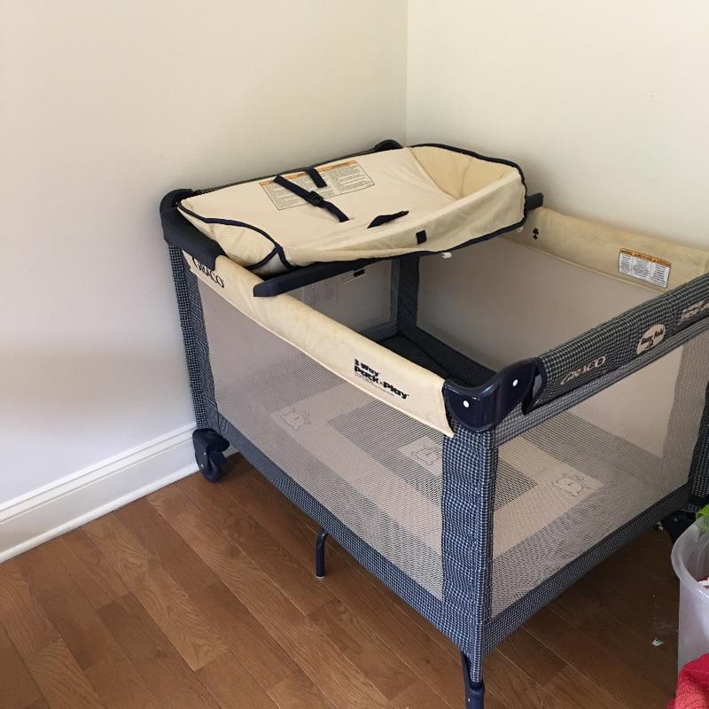 Graco Pack and Plat and more. Be ready for th kids or grandkids when they come over! Lot includes Fischer Price high chair insert, bear shaped wooden stool and a Graco pack and play. Mesh on pack & play has hole in it, see pictures. Pack and play measures 29” x 40” x 30”.
