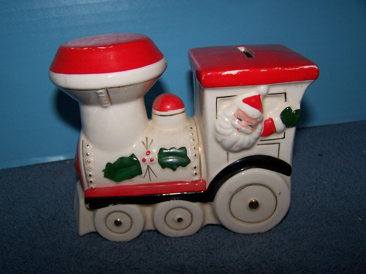 THIS IS A GREAT VINTAGE MCM SANTA & ELF TRAIN BANK!!! 4 3/4'' X 6''.. LIGHT WEAR/RUBS..