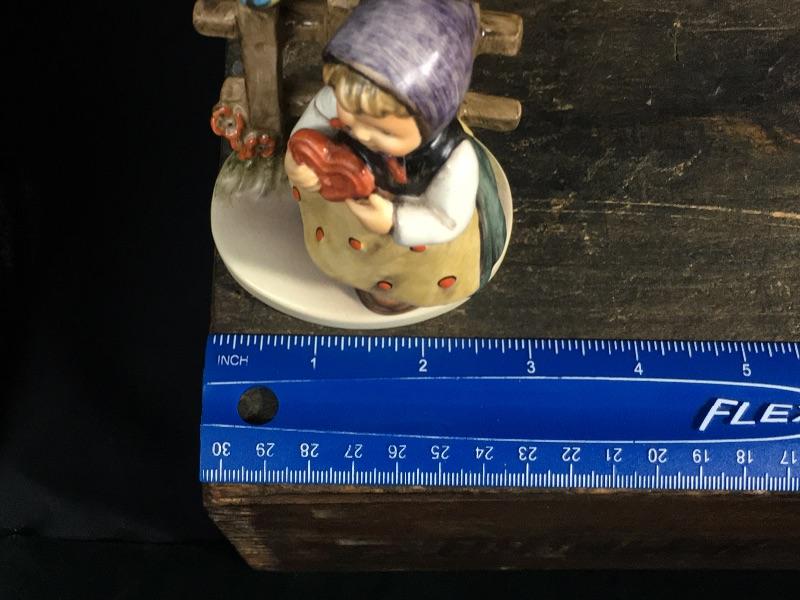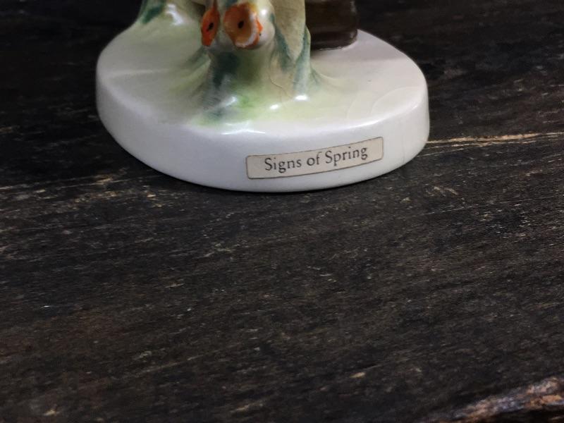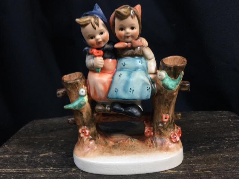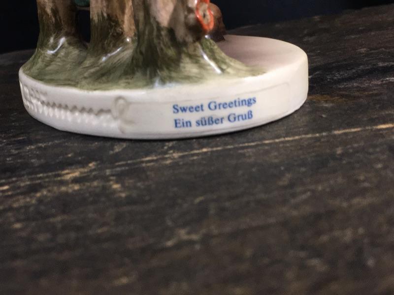 This lot of 3 Hummels contains Hummels #179 “Coquettes”, #352 “Sweet Greetings”, and #203/1 “Signs of Spring”. “Coquettes” is a TMK 6 Hummel that has light crazing around its figure. “Sweet Greetings” is also a TMK 6 Hummel and is in mint condition with no visible signs of crazing. “Signs of Spring” is a TMK 4 Hummel and shows signs of minimal crazing around its figures.