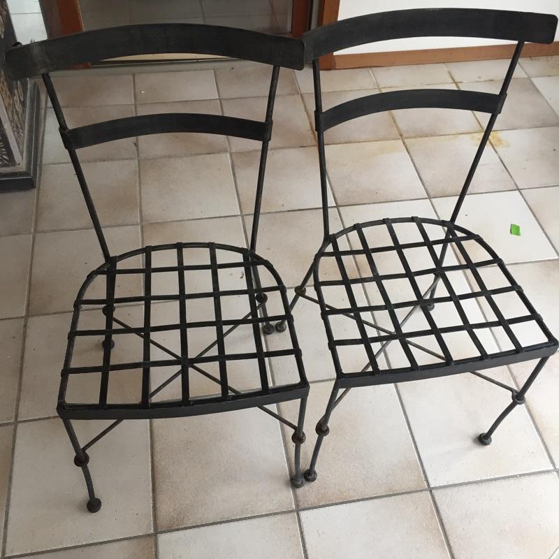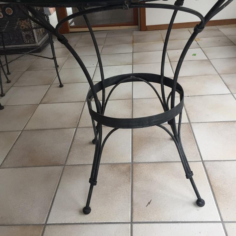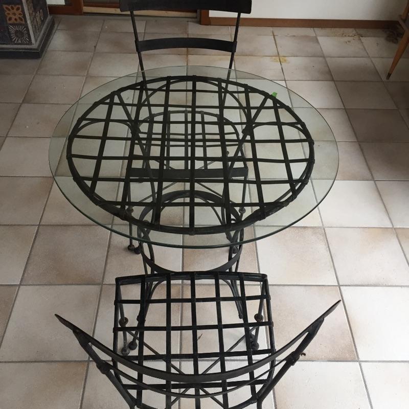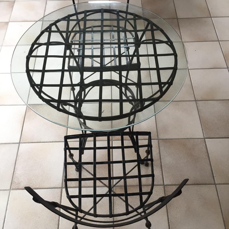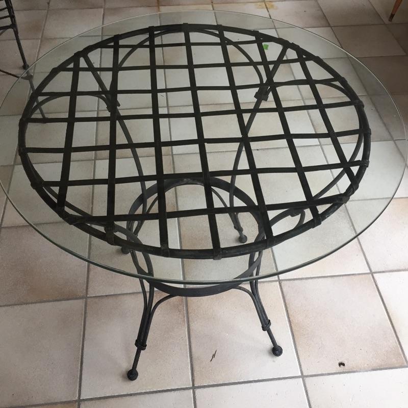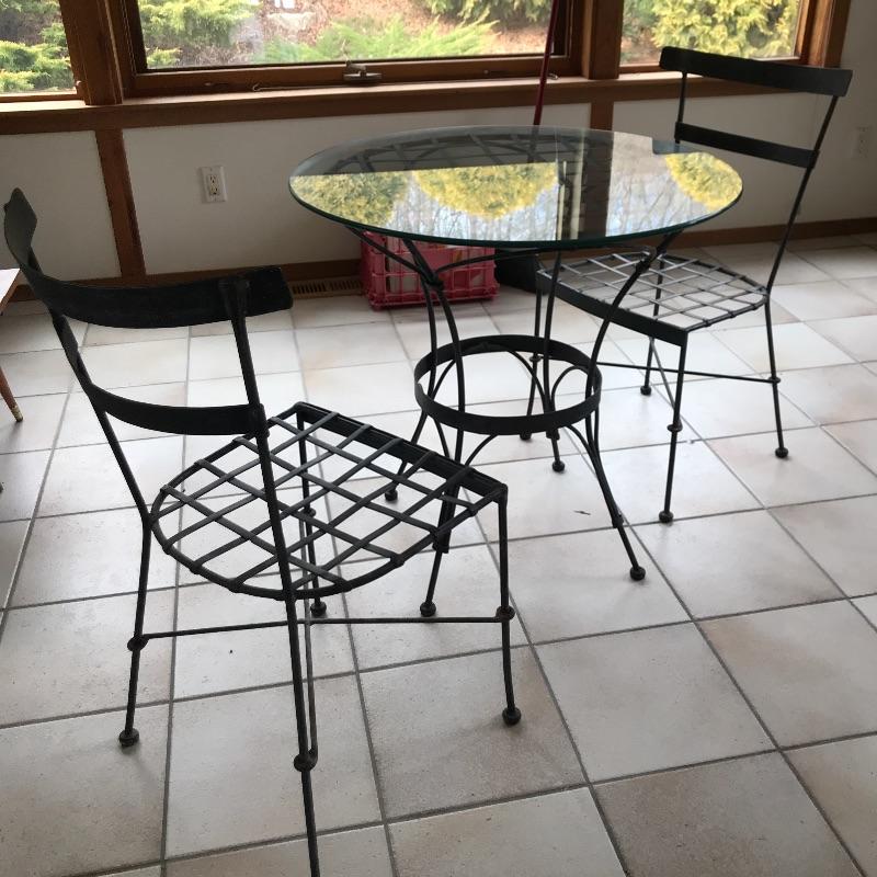 Unique glass topped iron table and chairs. Great for your morning coffee or a game of cards. Table measures 30” D x 29.75” tall. Chairs measure 15.5” x 16.5” x 33.5”. Seat height 17”.