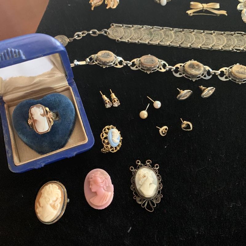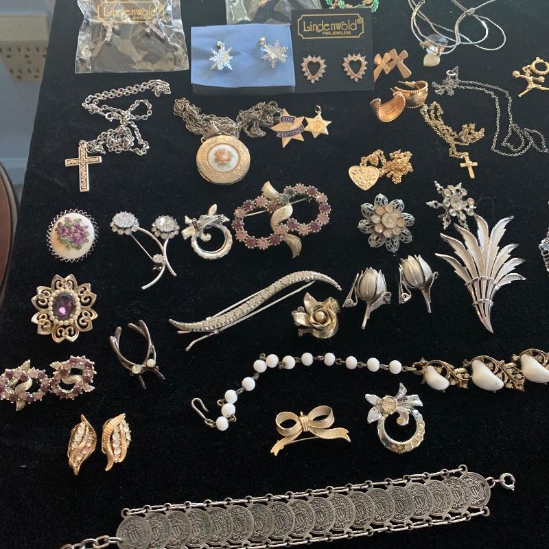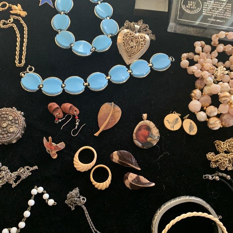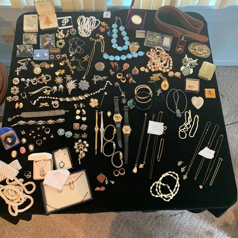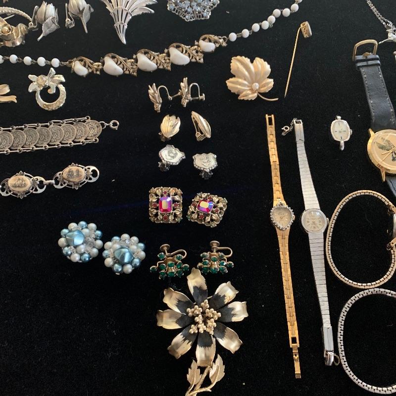14k chains, 10k chains, 14k diamond heart pendant, cameos, vintage clip earrings and sparkle pins, couple turquoise pieces, ladies watches to include timex, Kelton, citizen quartz, and more. Costume jewelry, 1989 s Eagle Coin and fun trinket boxes as well as one faux fur coat and one vintage mink collared coat and a few purses finish out this lovely ladies lot.