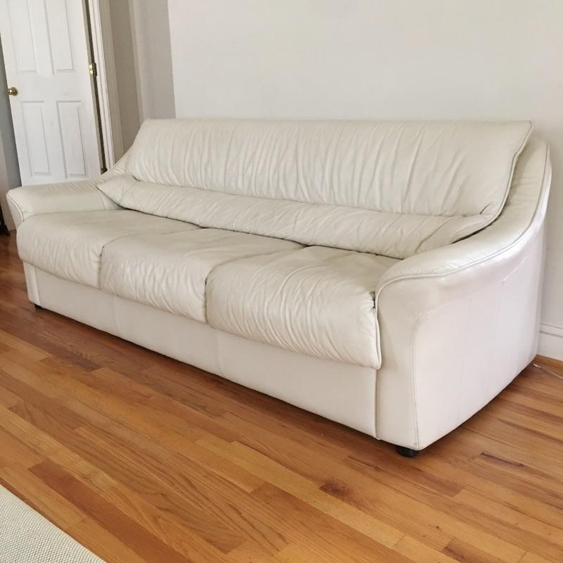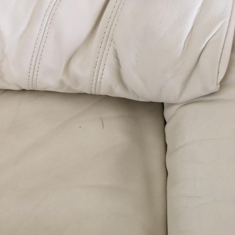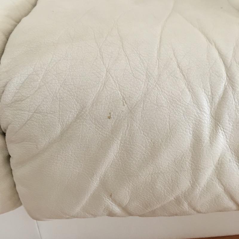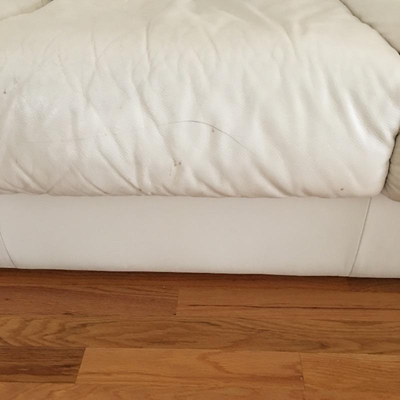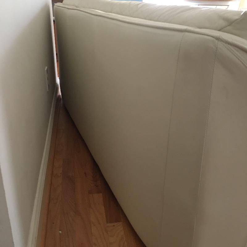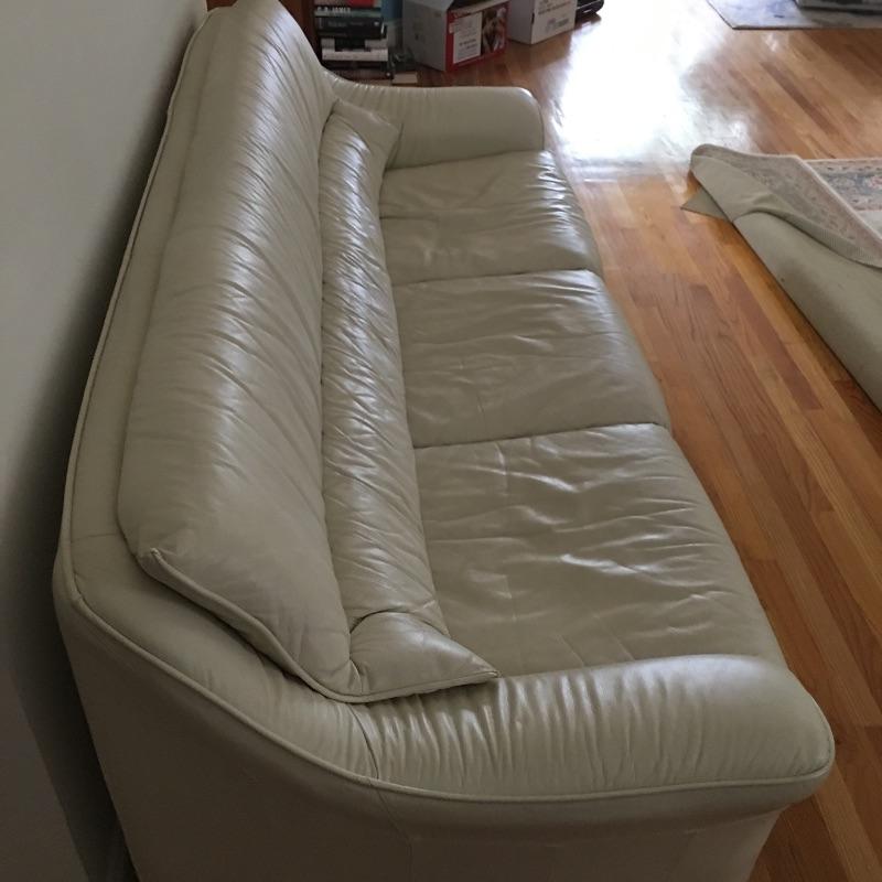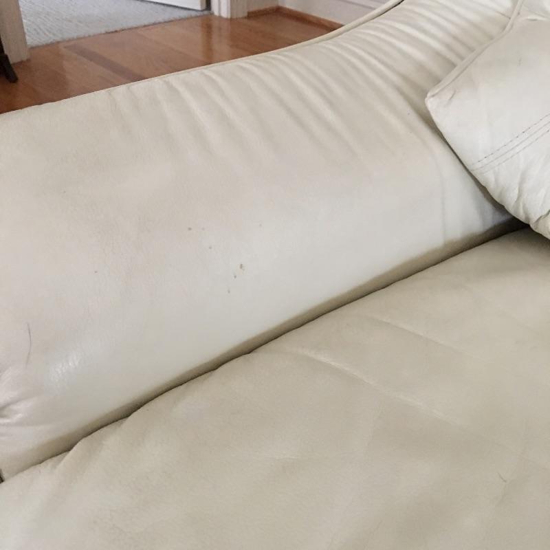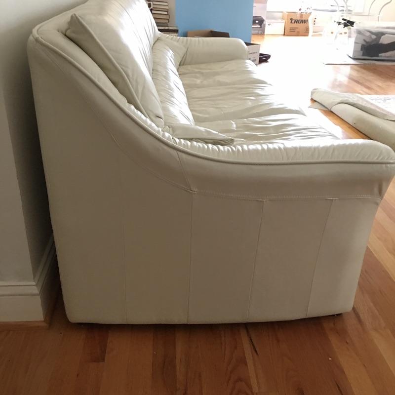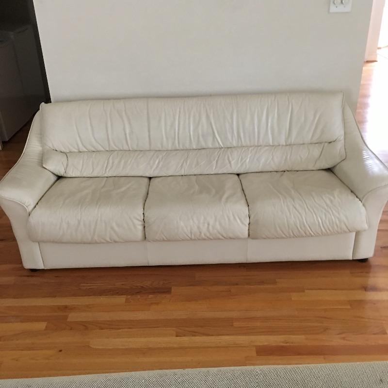 White leather couch in excellent shape. Great for the household with animals or kids as it is easy to clean.