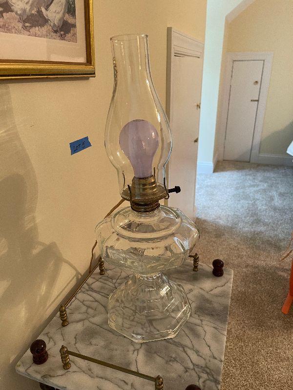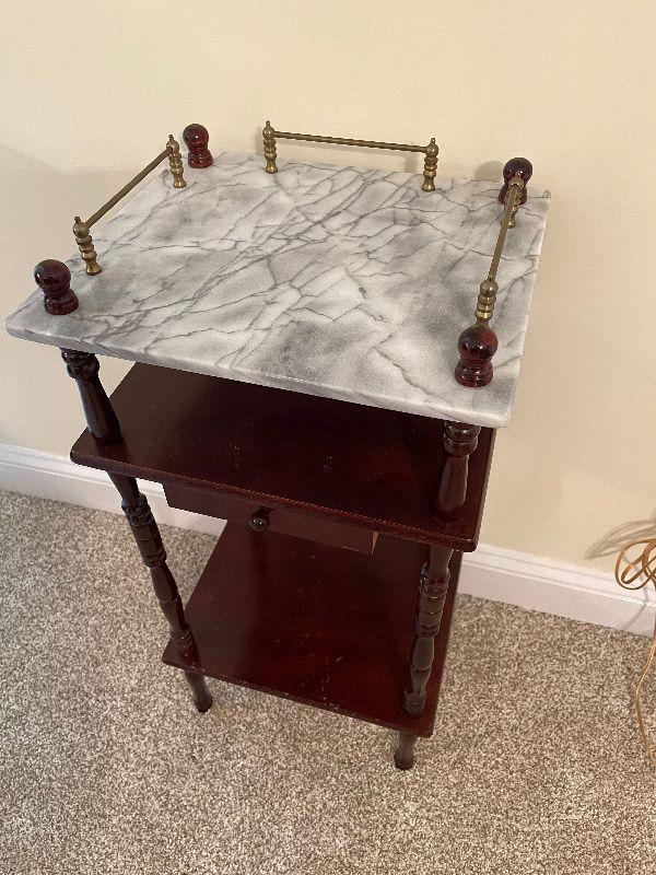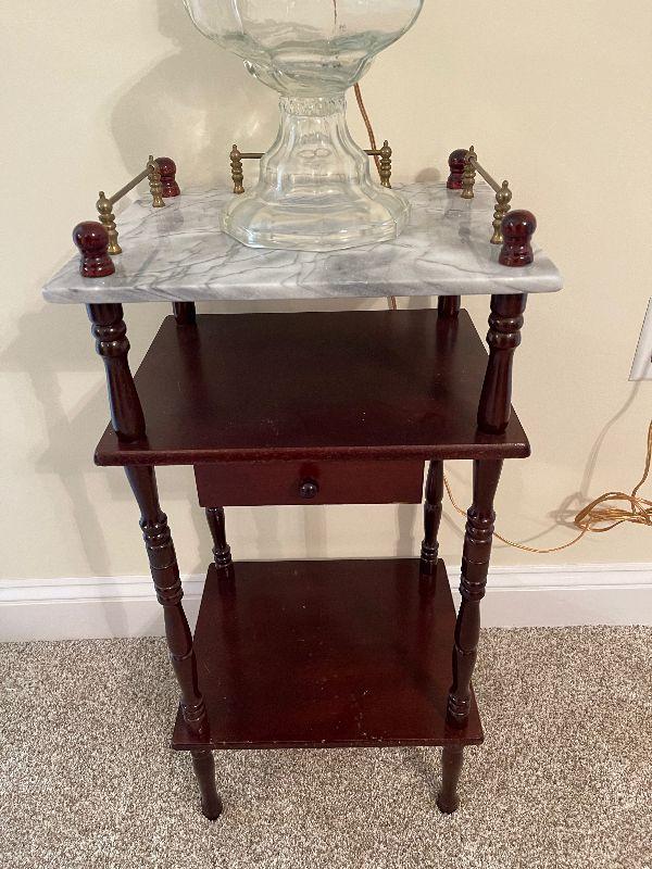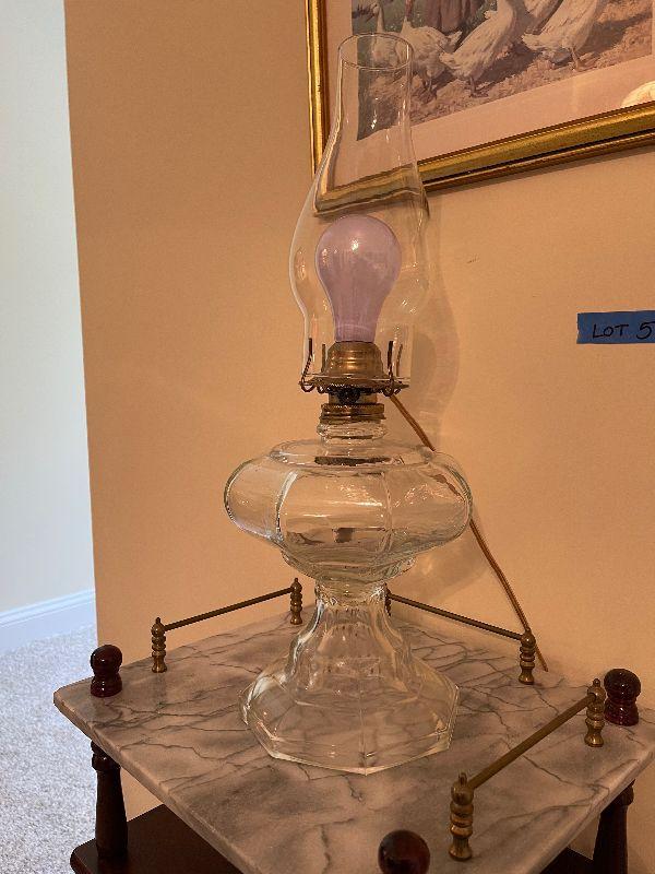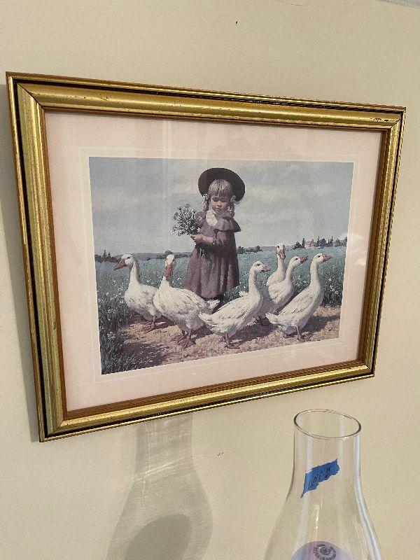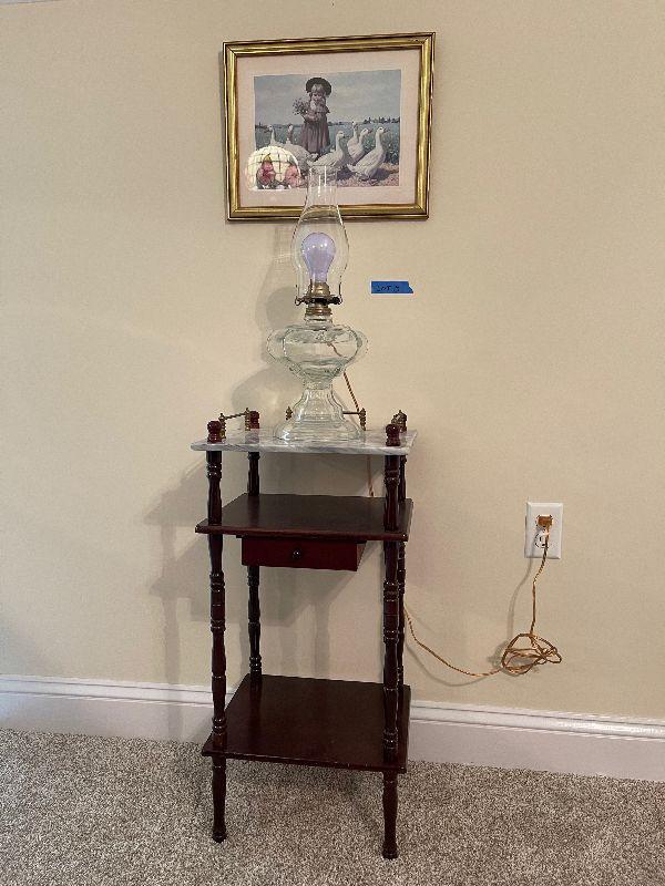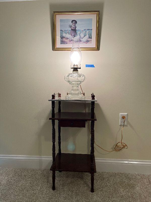 Marble Top Accent Table, Oil Style Lamp and Girl with Ducks Wall Art