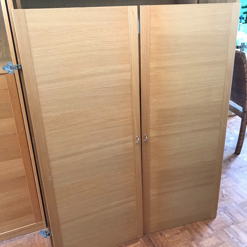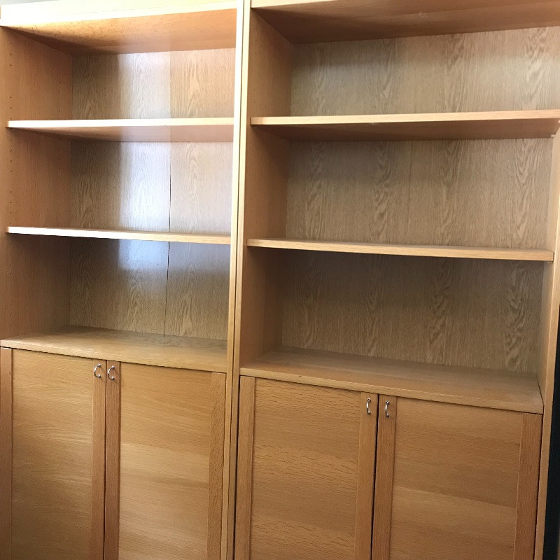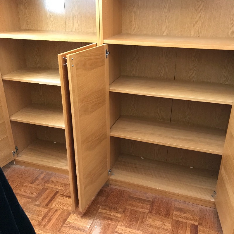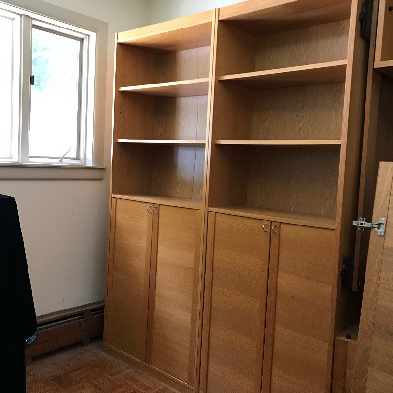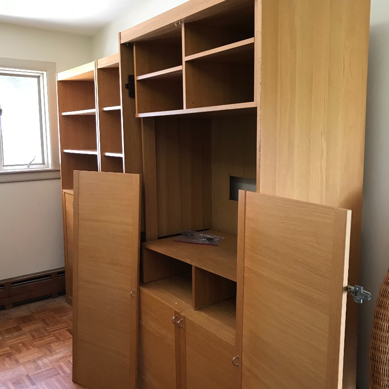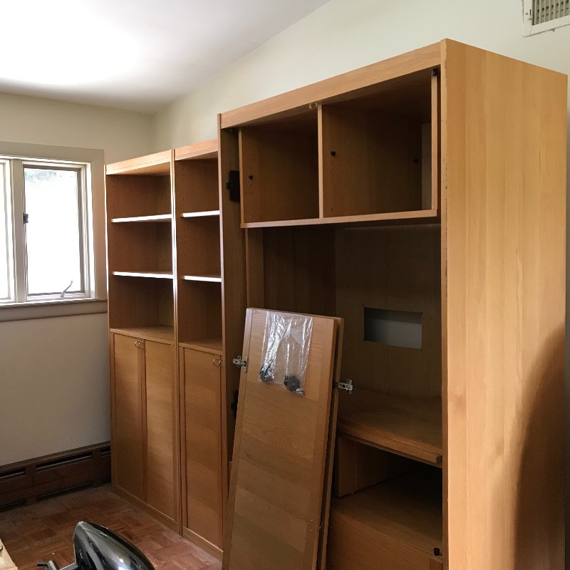 Lovely matching trio here with 2 sets of shelf cabinets that have six shelves each, three of which are hidden by stylish doors with understated silver pulls. The shelves are all adjustable, but the upper three have some discoloration, see images. Shelves are accompanied by a matching four door entertainment armoire with an extra riser that is the perfect height for storing your DVD's. The previous owner used the armoire without the top doors, but has kept some hardware if the new owner cares to re-attach the doors. All the wood appears to be pressed and the back panel is lightweight and may need some sort of stabilizing. All pieces appear to have aged nicely. Shelf units measure approximately 31” x 14” x 79” each and the armoire is approximately 41” x 23.75” x 79” See images. Please bring help to load.
