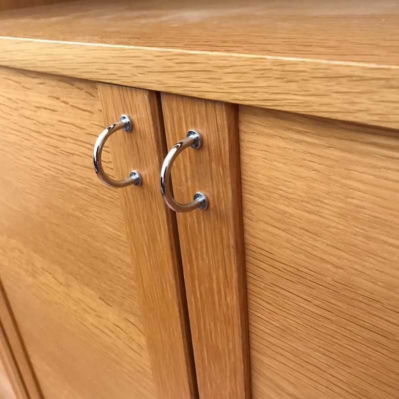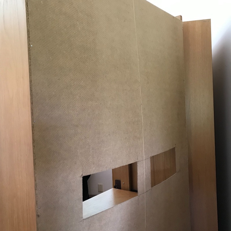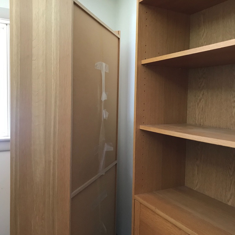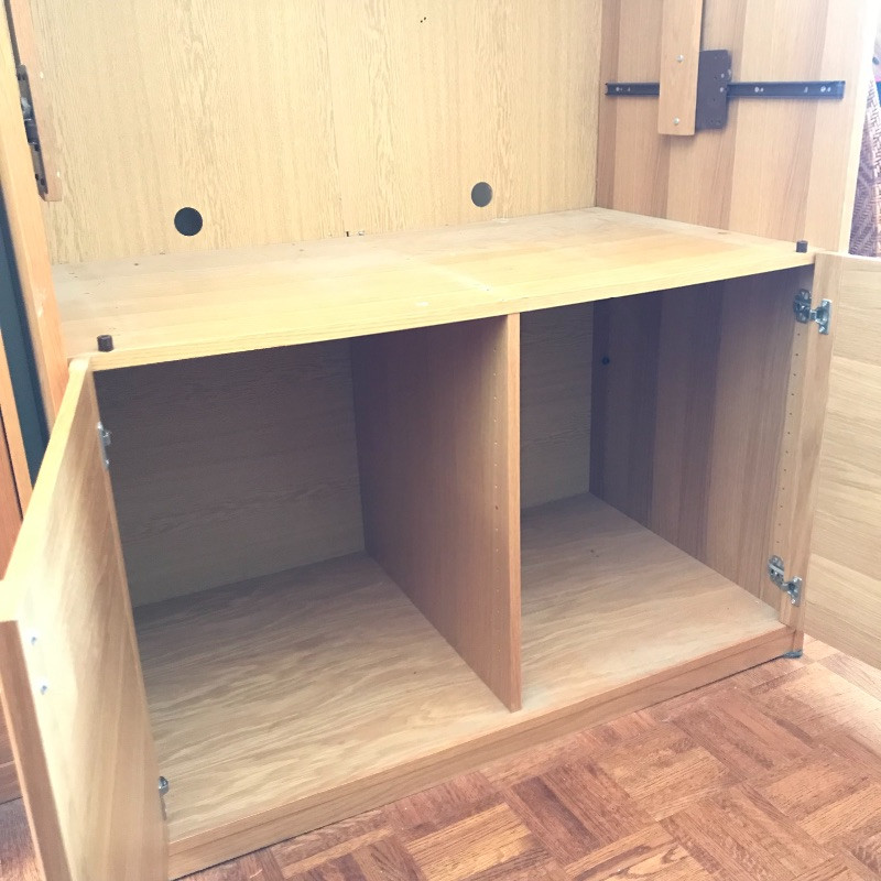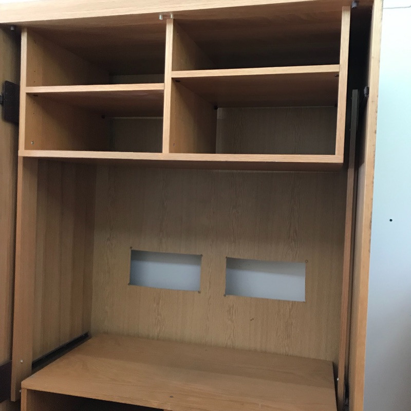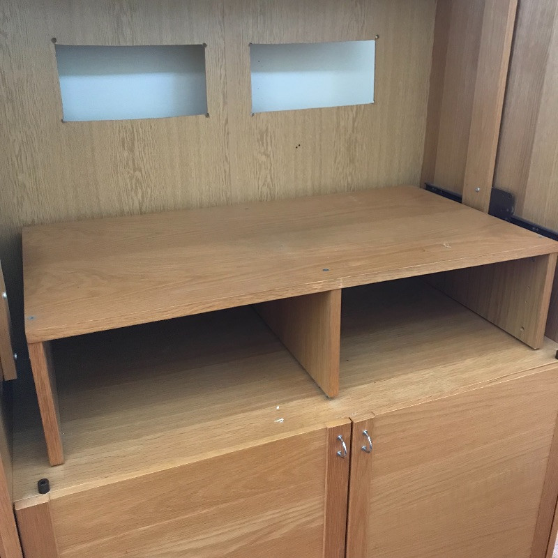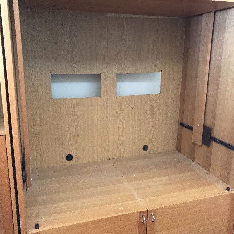 Lovely matching trio here with 2 sets of shelf cabinets that have six shelves each, three of which are hidden by stylish doors with understated silver pulls. The shelves are all adjustable, but the upper three have some discoloration, see images. Shelves are accompanied by a matching four door entertainment armoire with an extra riser that is the perfect height for storing your DVD's. The previous owner used the armoire without the top doors, but has kept some hardware if the new owner cares to re-attach the doors. All the wood appears to be pressed and the back panel is lightweight and may need some sort of stabilizing. All pieces appear to have aged nicely. Shelf units measure approximately 31” x 14” x 79” each and the armoire is approximately 41” x 23.75” x 79” See images. Please bring help to load.